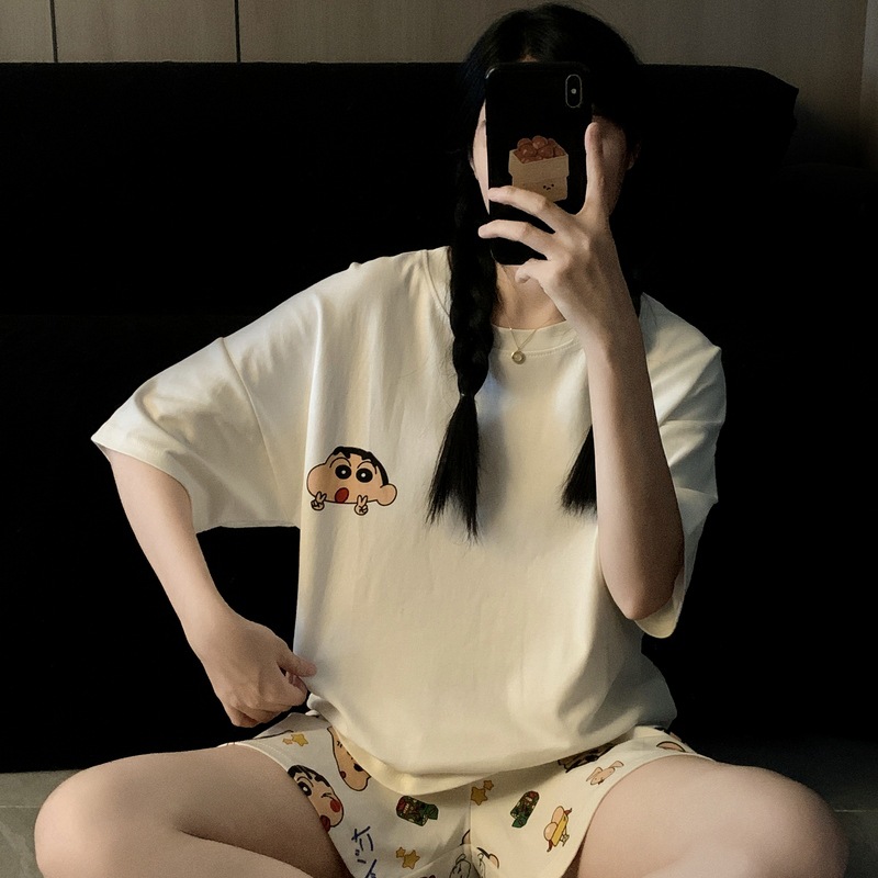 재고 도매 커플 파자마 여성용 둥근 목 크레용 작은 새 봄과 가을 헐렁한 홈 의류 짧은 소매 여름 3 피스 세트스토어 가기