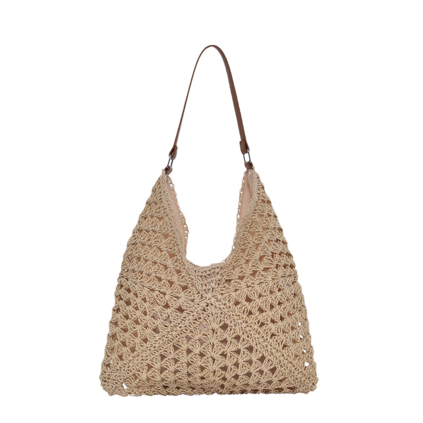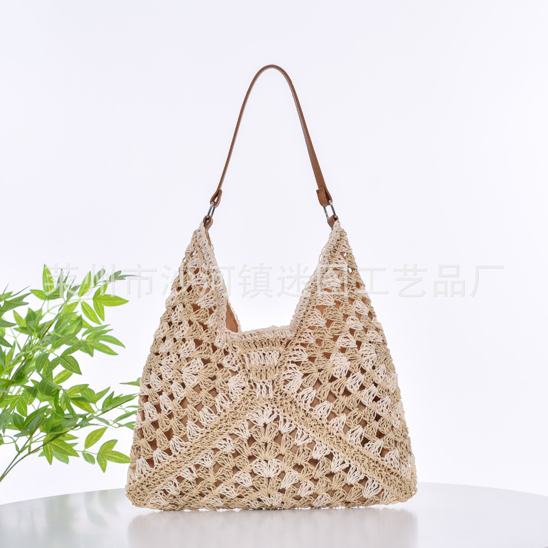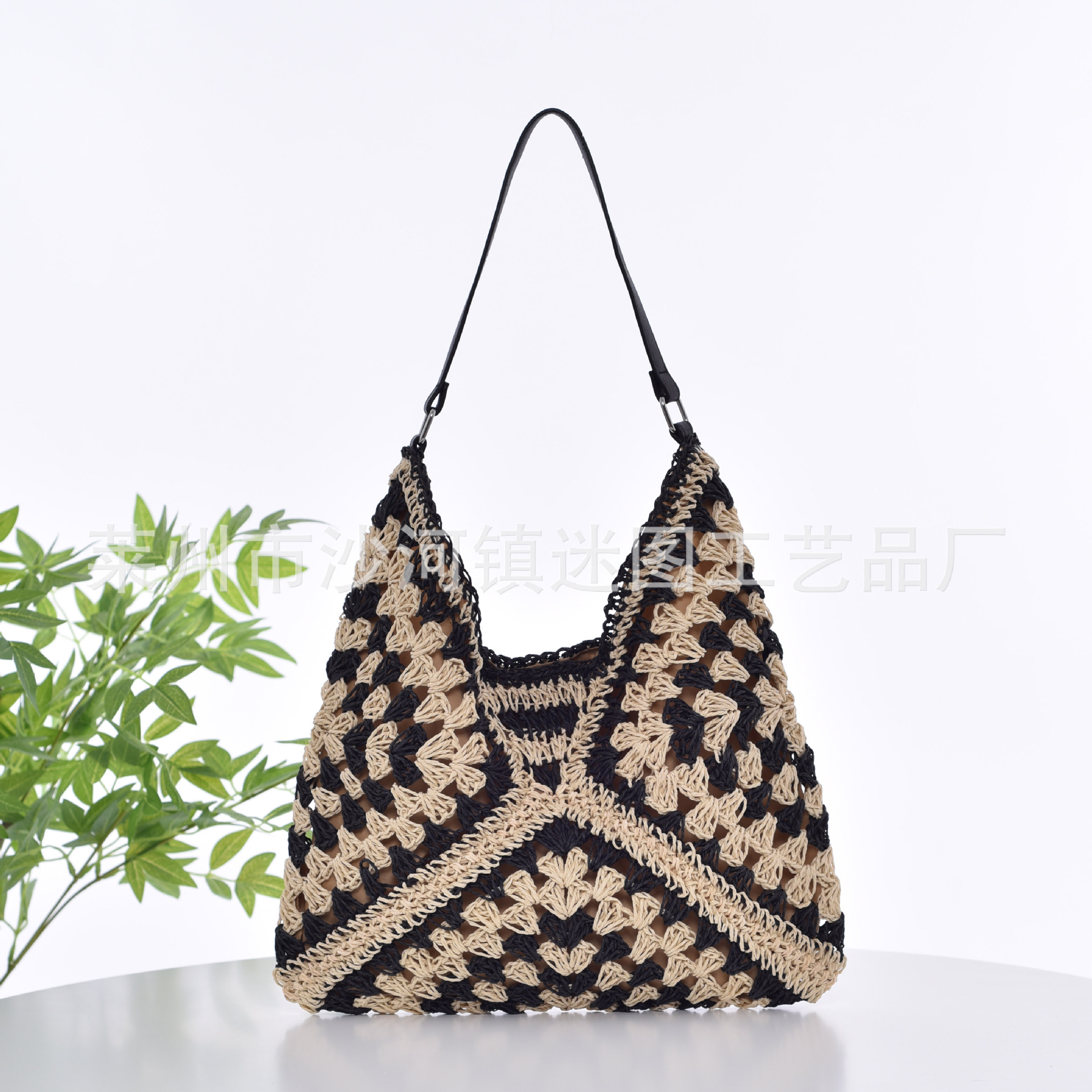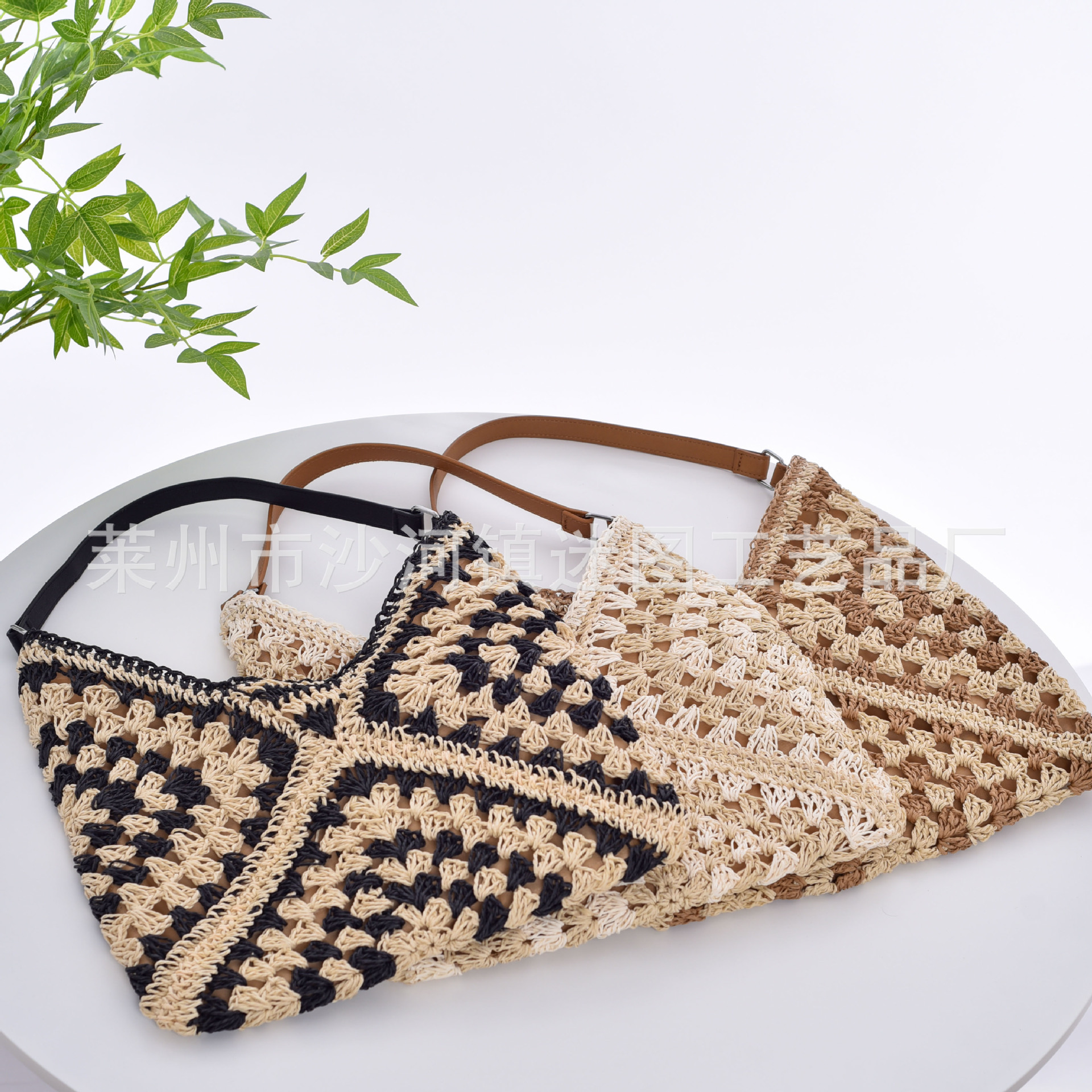 국경 간 인기 수제 밀짚 가방 중공 사각형 꽃 대형 삼각형 대비 색상 짠 어깨 가방 캐주얼 비치 토트 백
