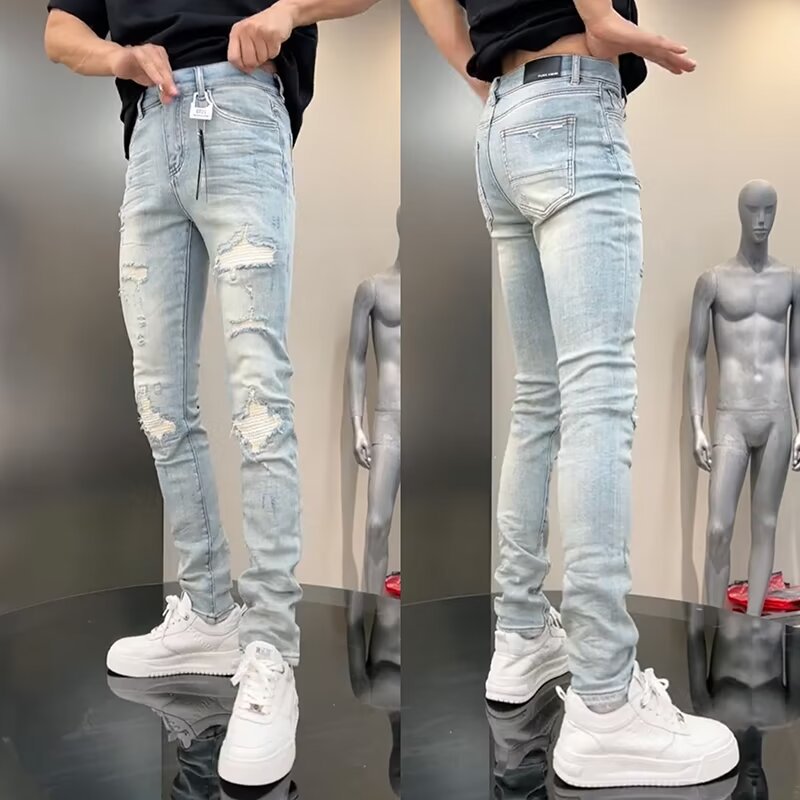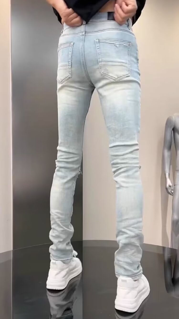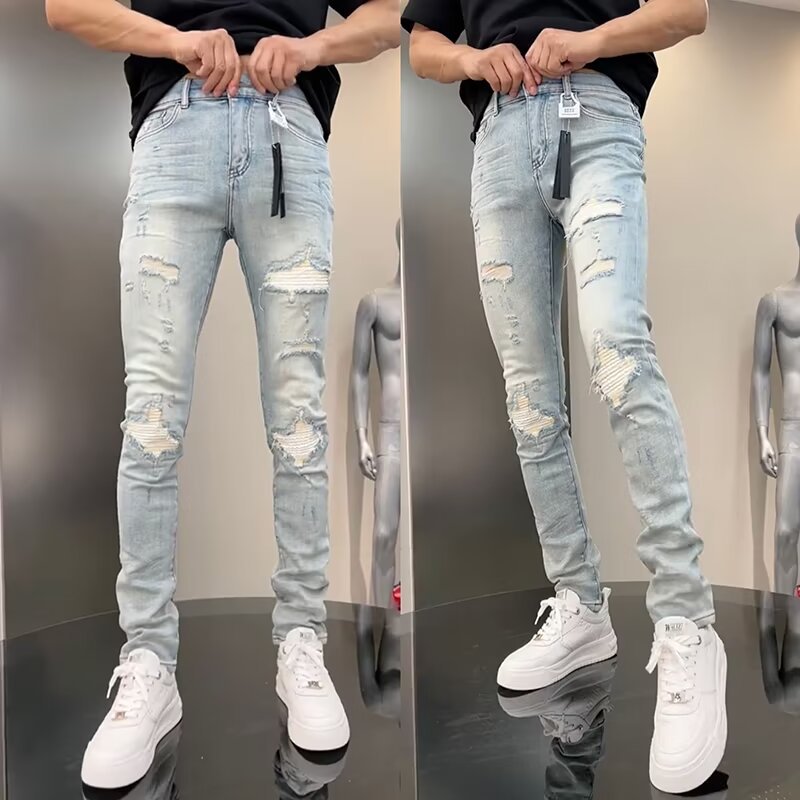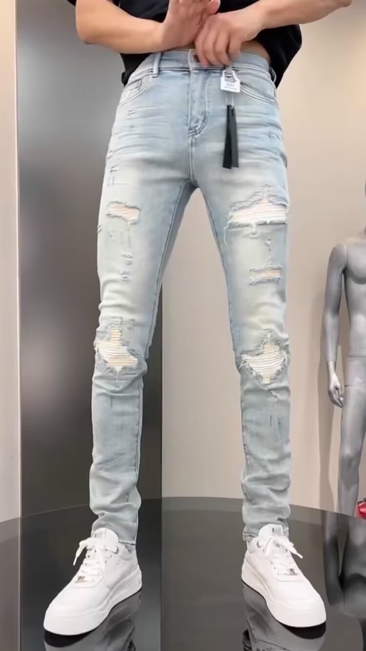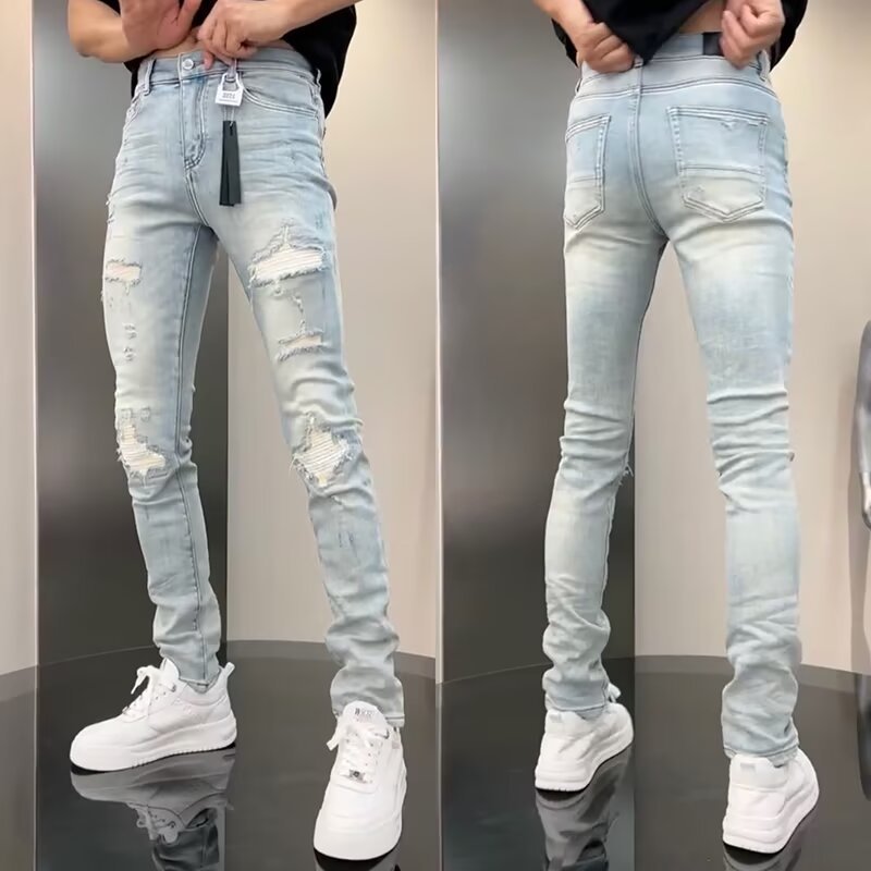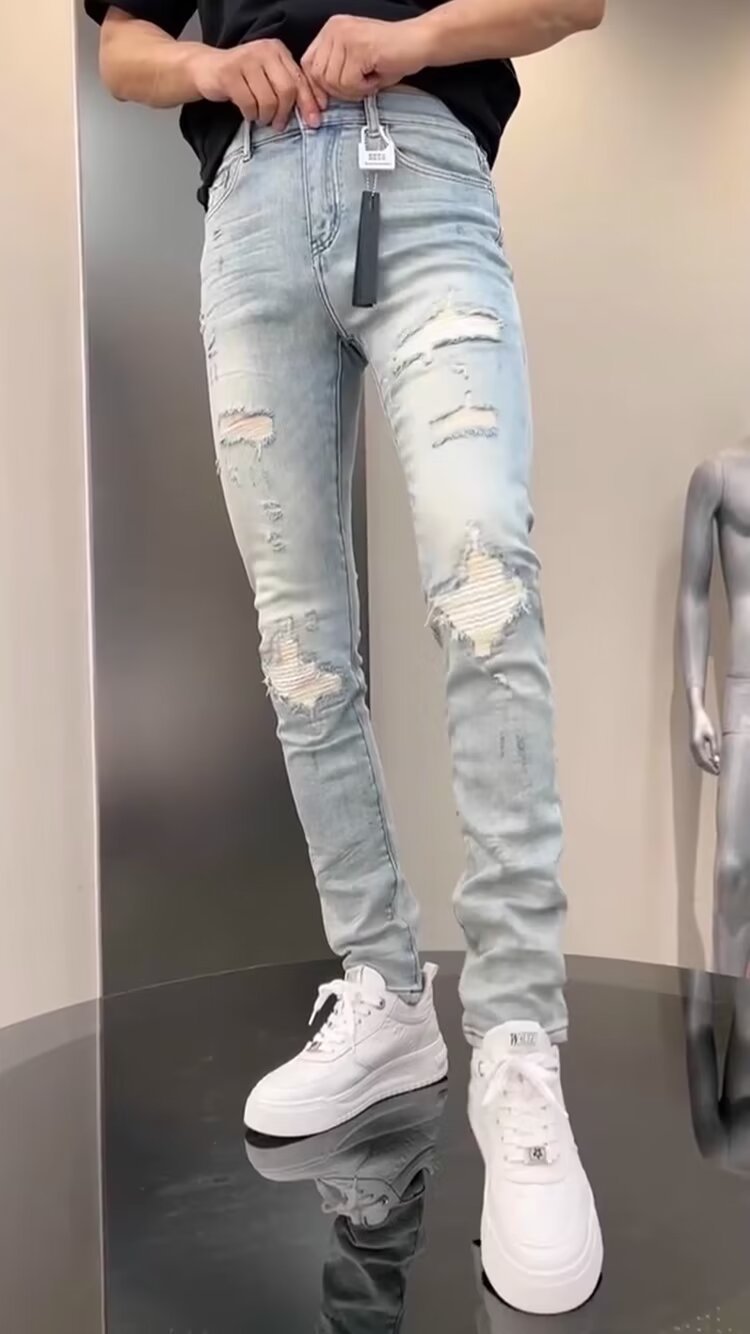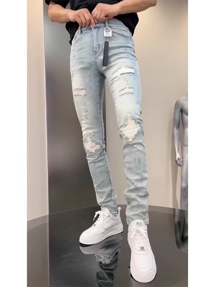 봄 새로운 블루 슬림 스트레치 청바지 남성용 유행 사이버 축하 캐주얼 바지 올매치 리핑 청소년 스키니 바지스토어 가기