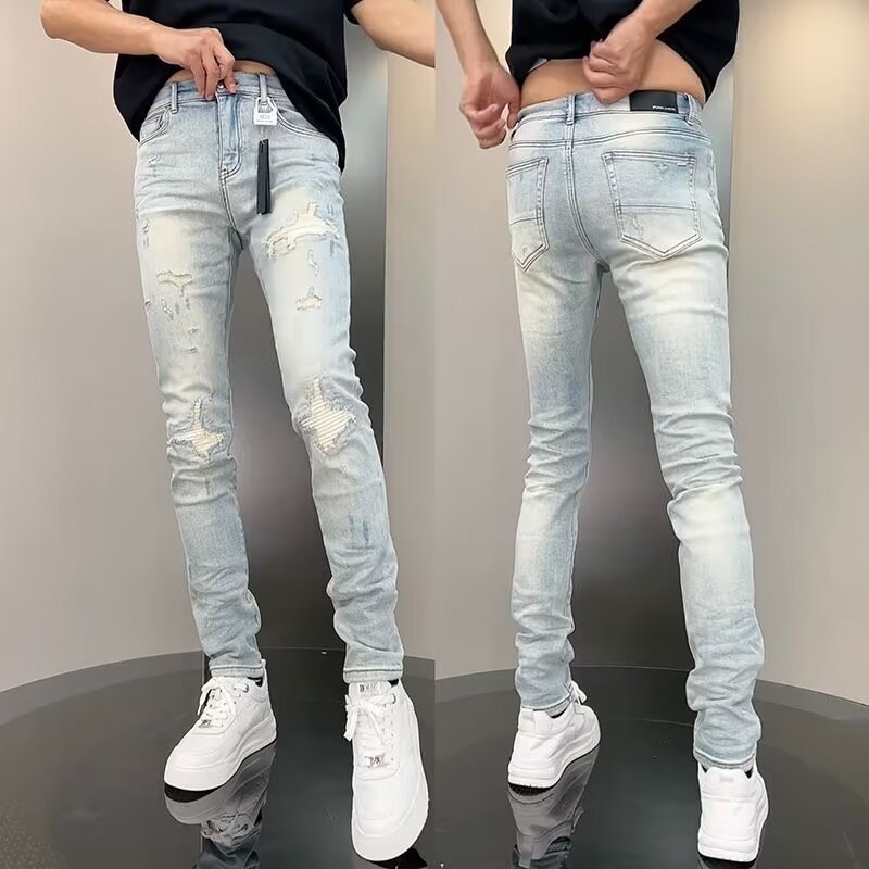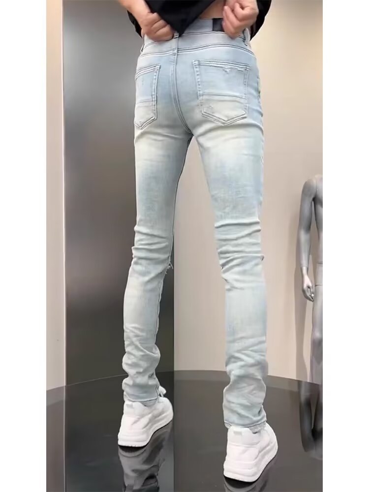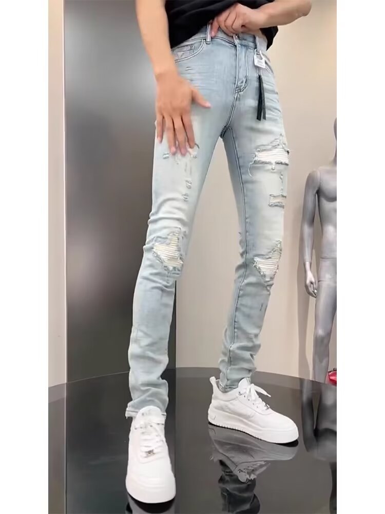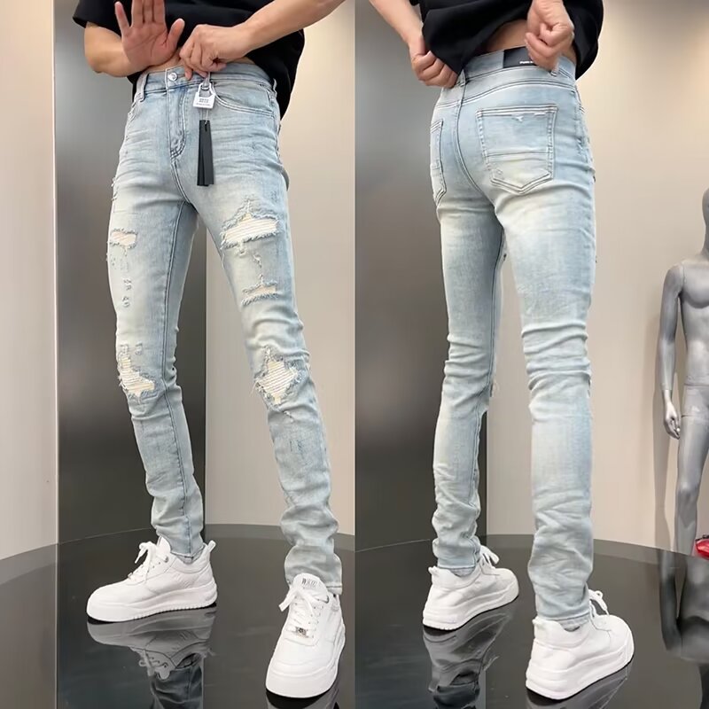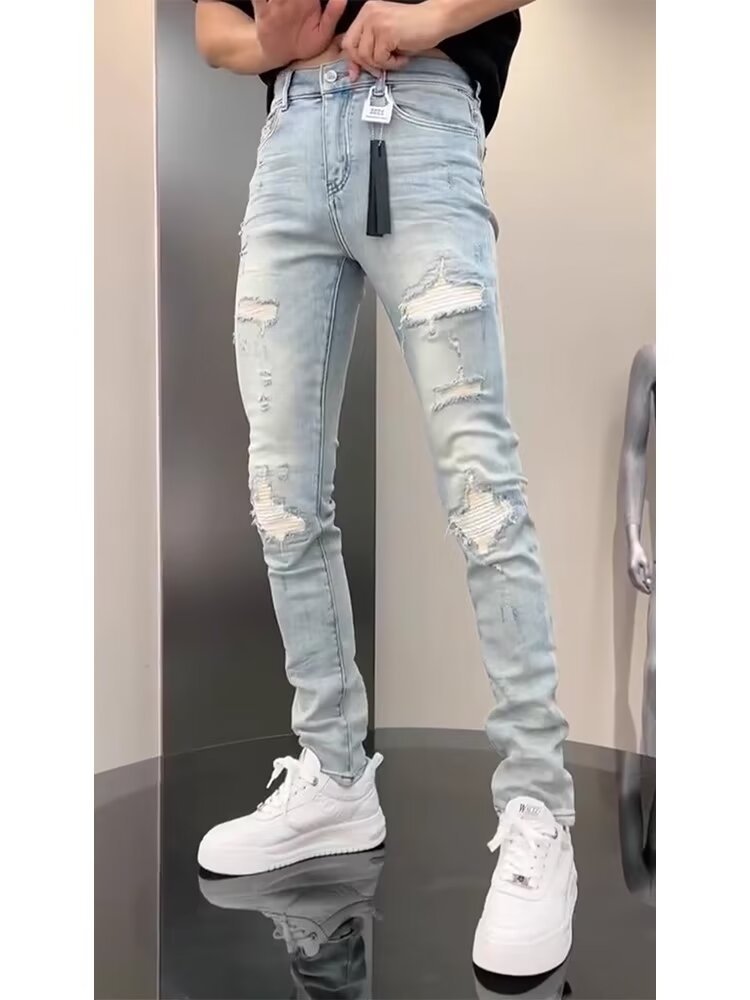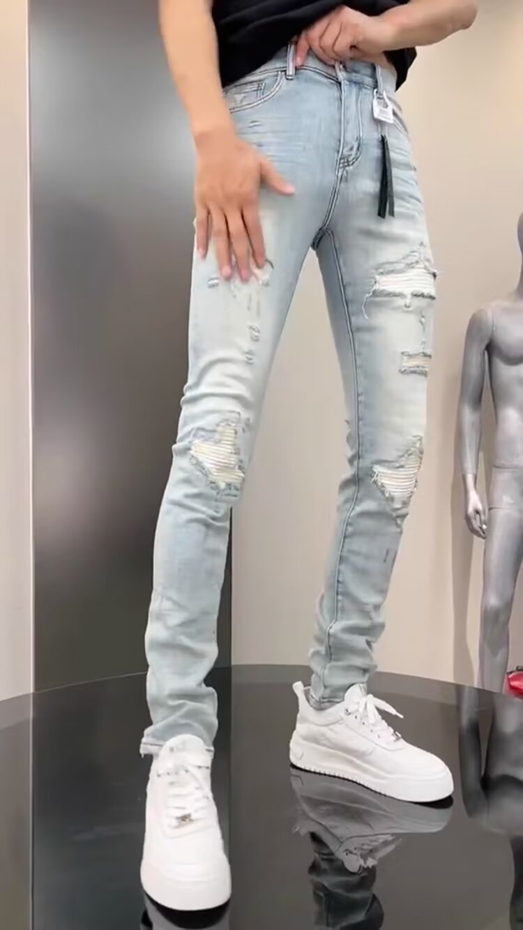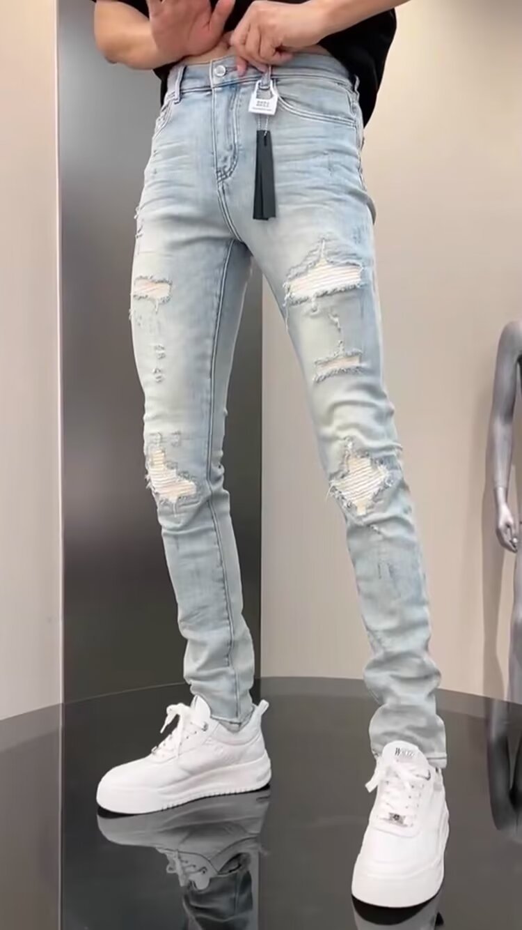 봄 새로운 블루 슬림 스트레치 청바지 남성용 유행 사이버 축하 캐주얼 바지 올매치 리핑 청소년 스키니 바지스토어 가기