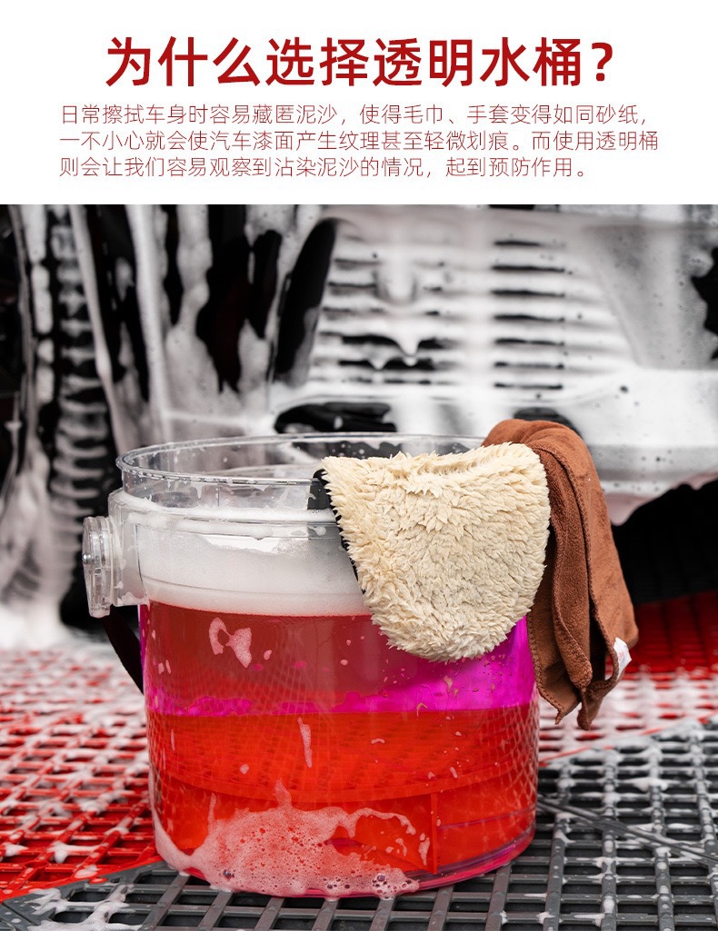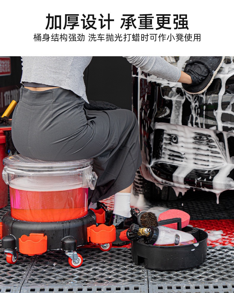 세차용 물통, 투명한 두 개의 물통, 바퀴 달린 받침대, 걸이형 바구니, 야외 세차용 브러시, 필터망 청소 도구스토어 가기
