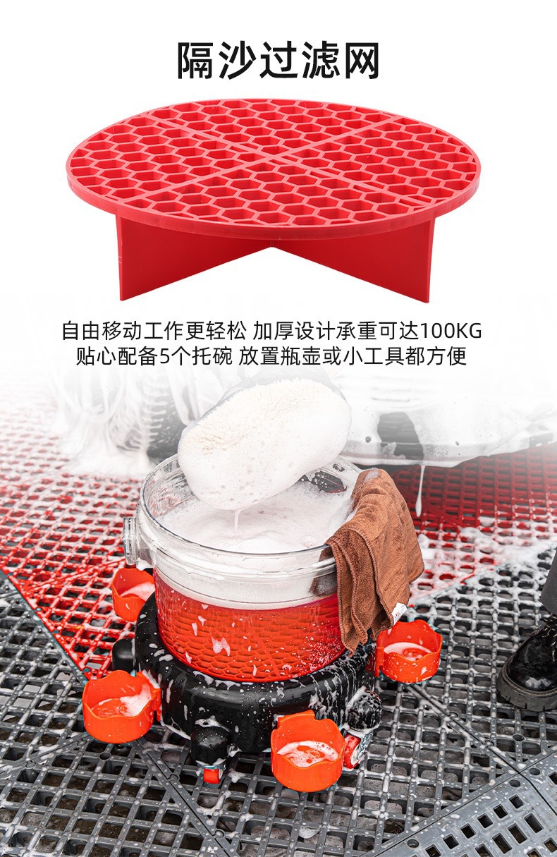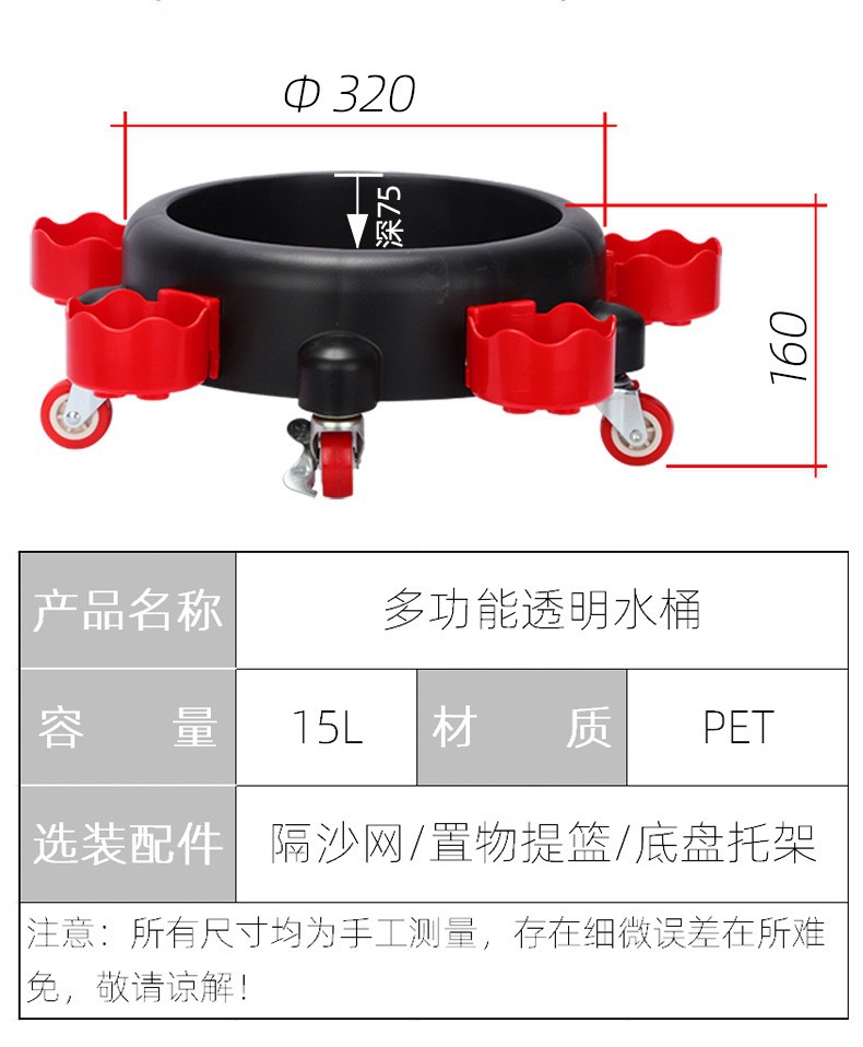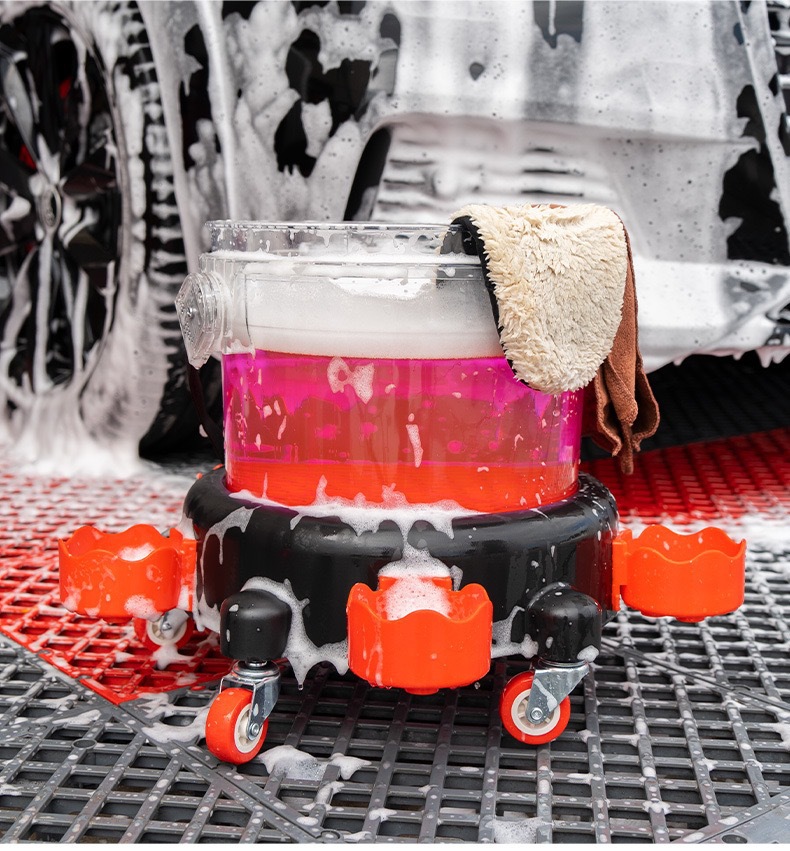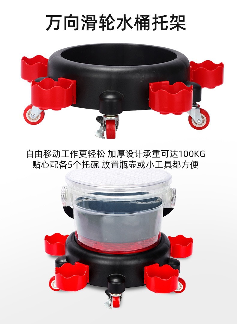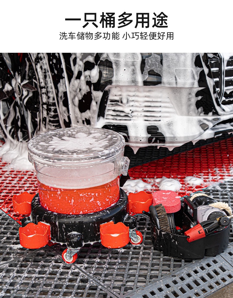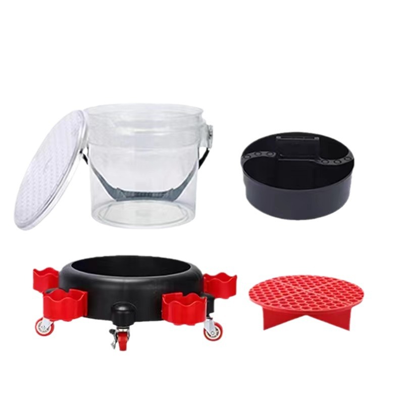 세차용 물통, 투명한 두 개의 물통, 바퀴 달린 받침대, 걸이형 바구니, 야외 세차용 브러시, 필터망 청소 도구