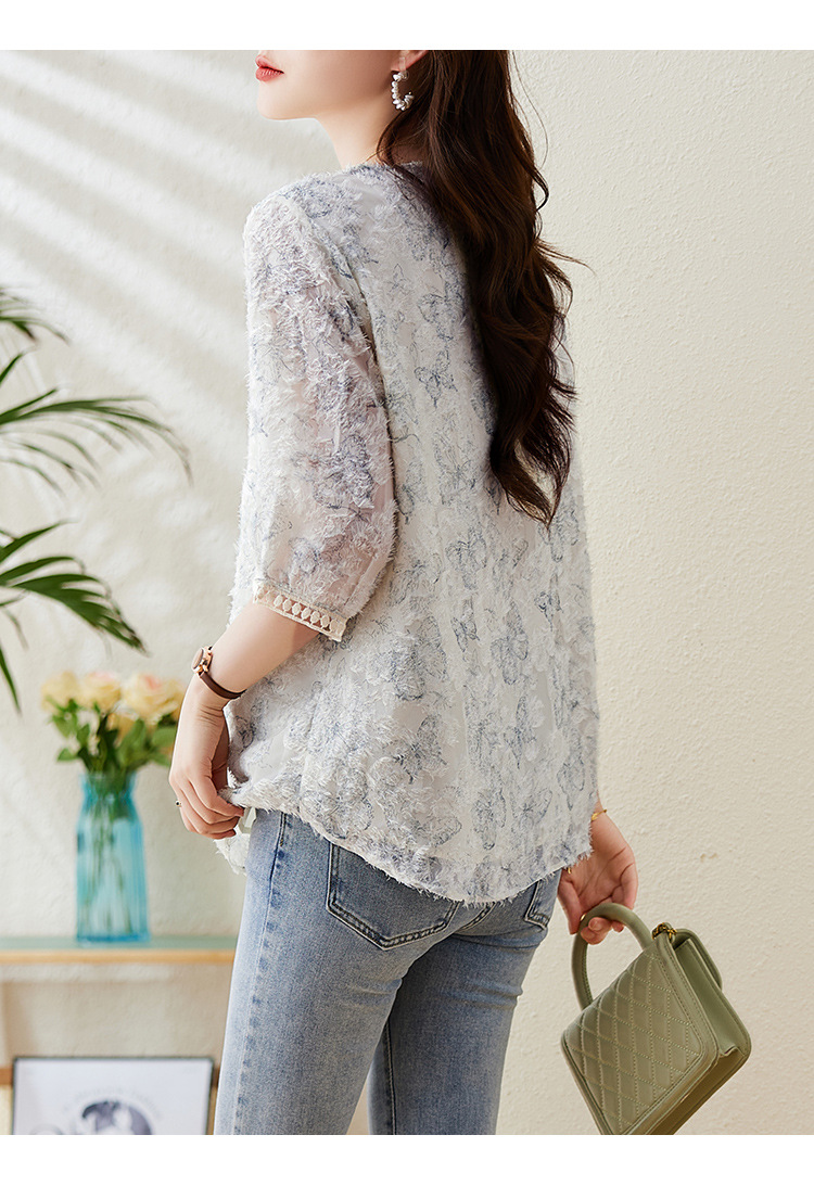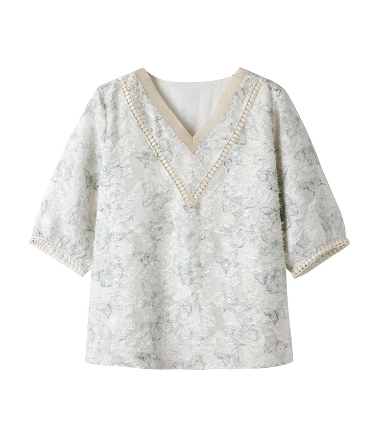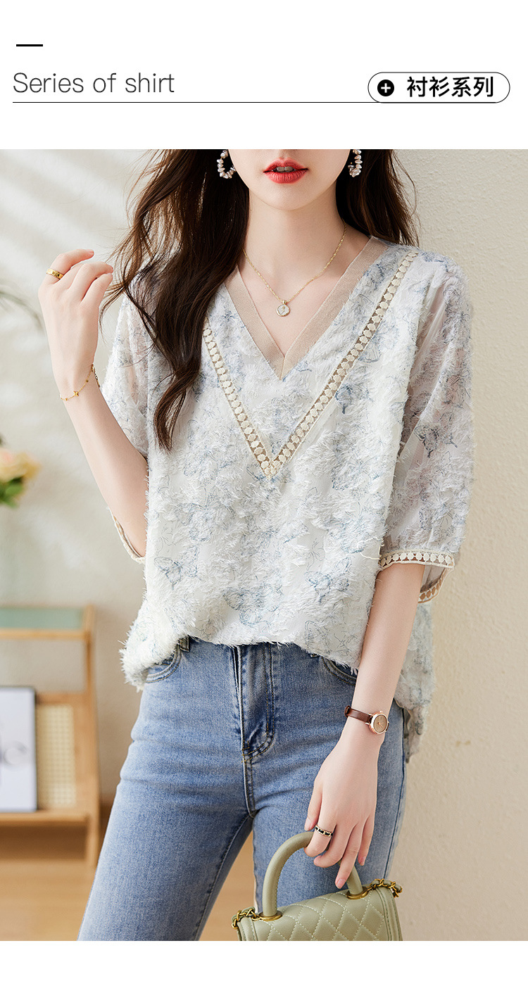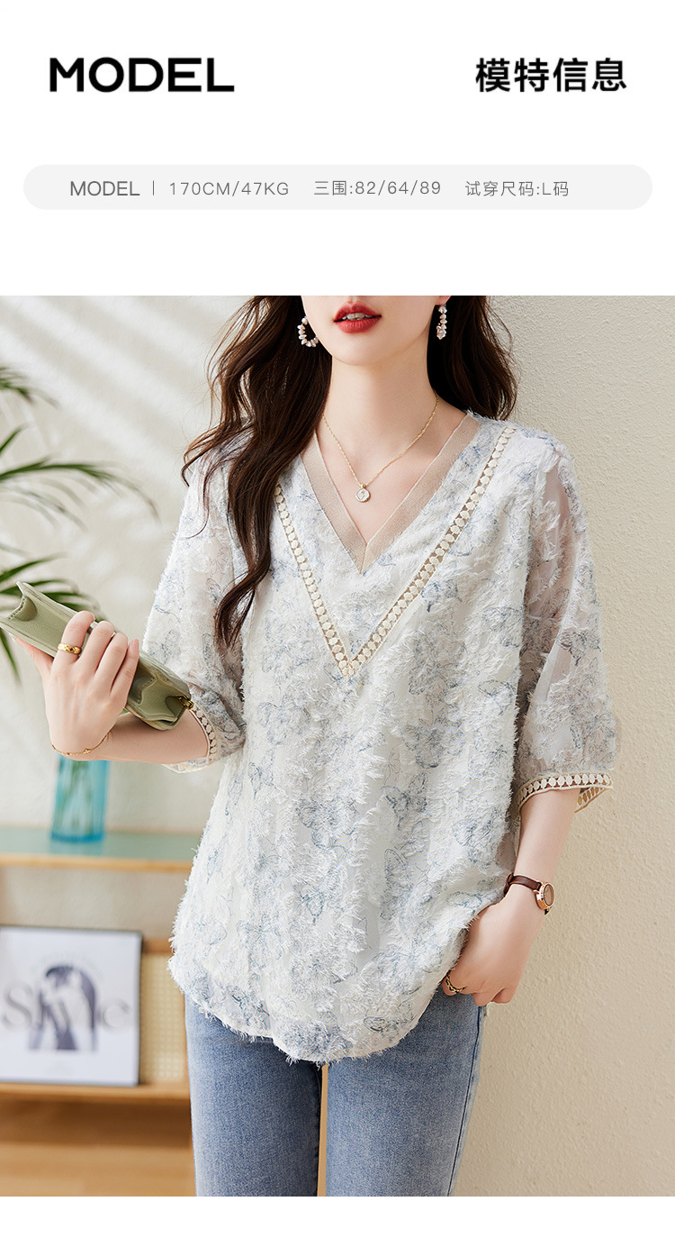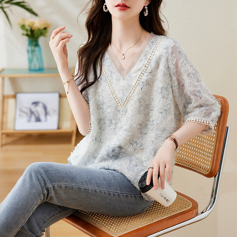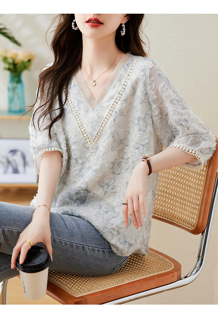실제 샷 스팟 기질 v 넥 컷 플라워 프린트 쉬폰 반팔 셔츠 여성 여름 2025 새로운 루즈 대형 탑스토어 가기