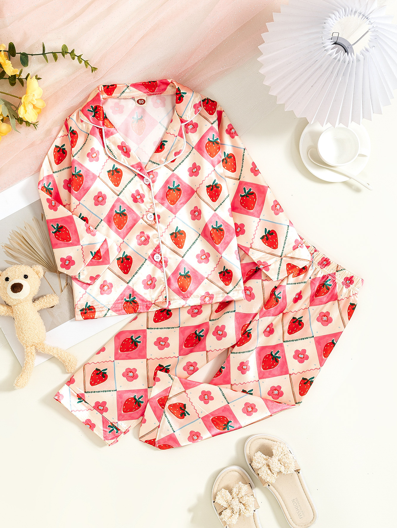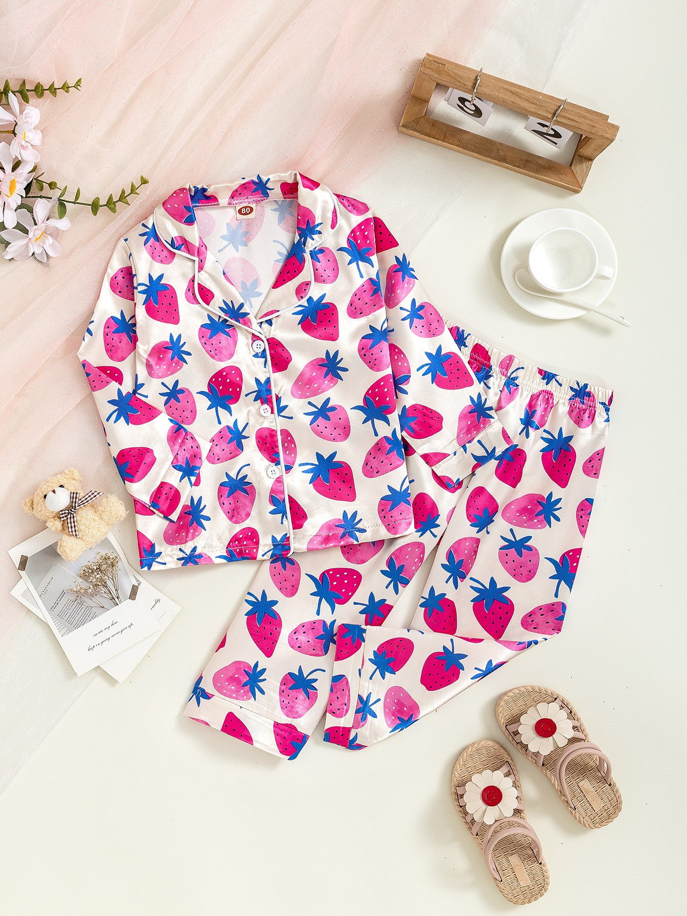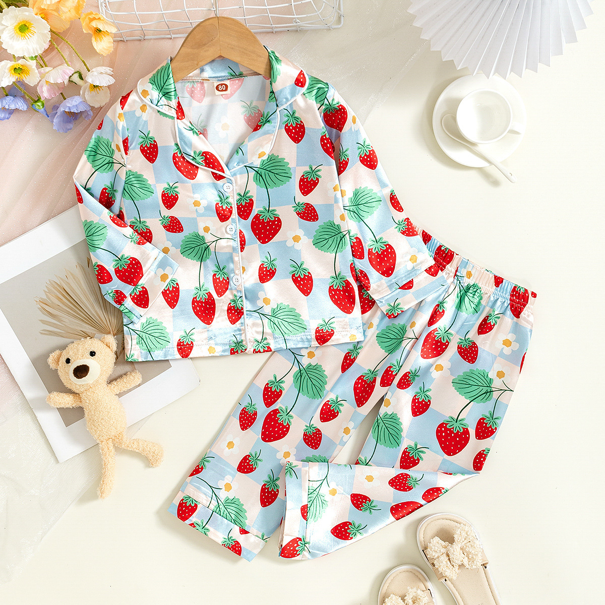 국경 간 소녀 잠옷 봄과 가을 아기 딸기 인쇄 긴팔 카디건 홈 의류 세트 어린이 잠옷스토어 가기
