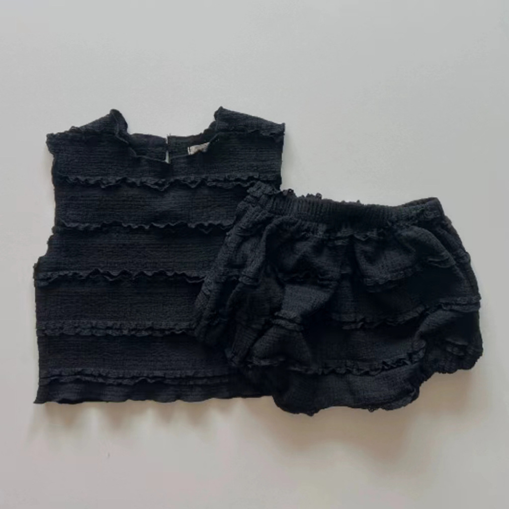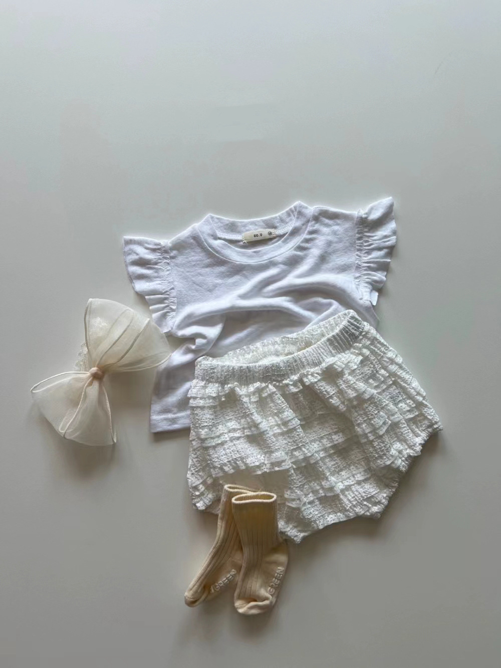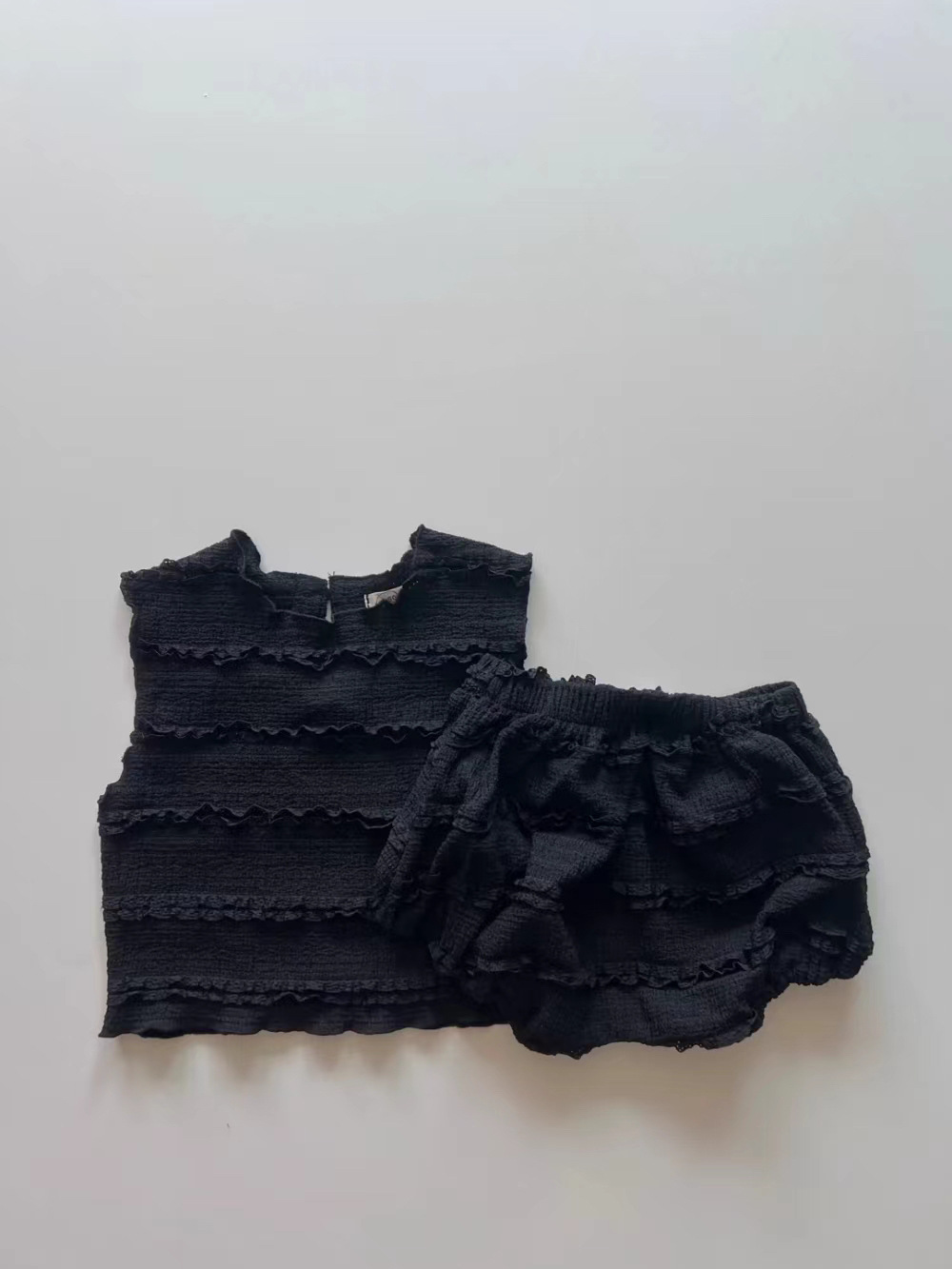 Ins 한국식 솔리드 컬러 느슨한 여름 세트 소년 소녀 아기 스트랩 다층 물결 가장자리 민소매 반바지 세트