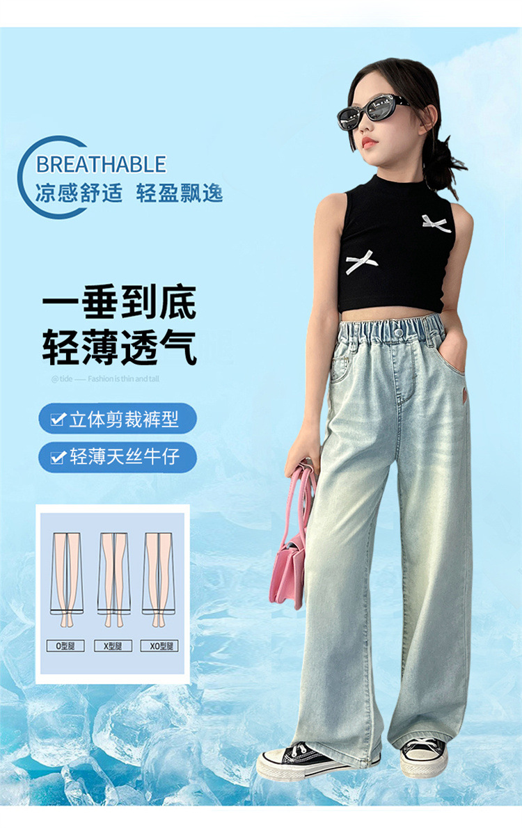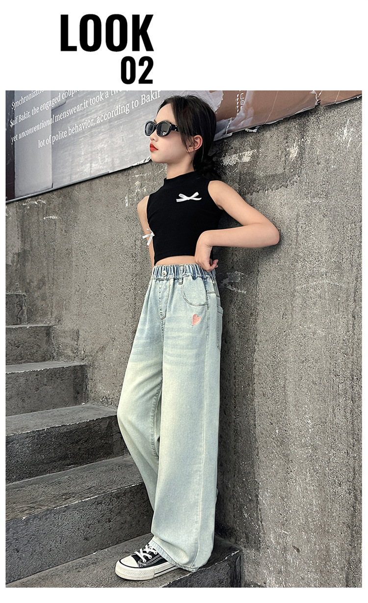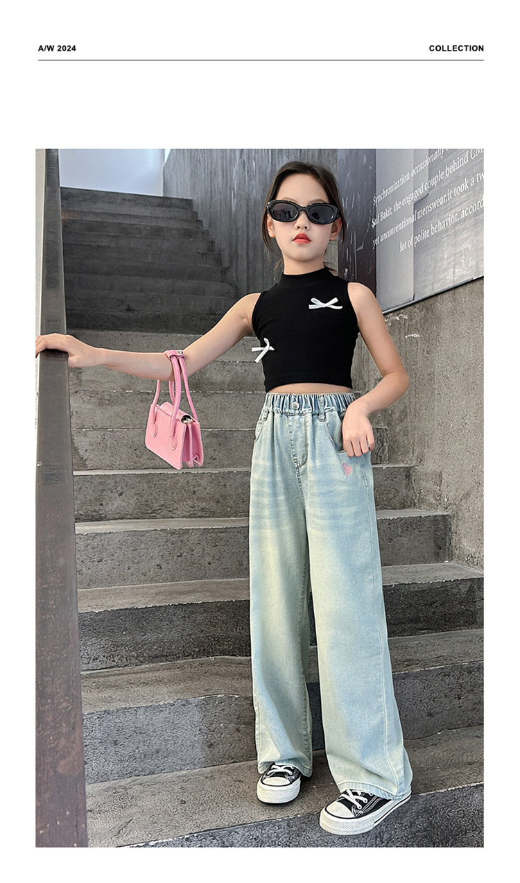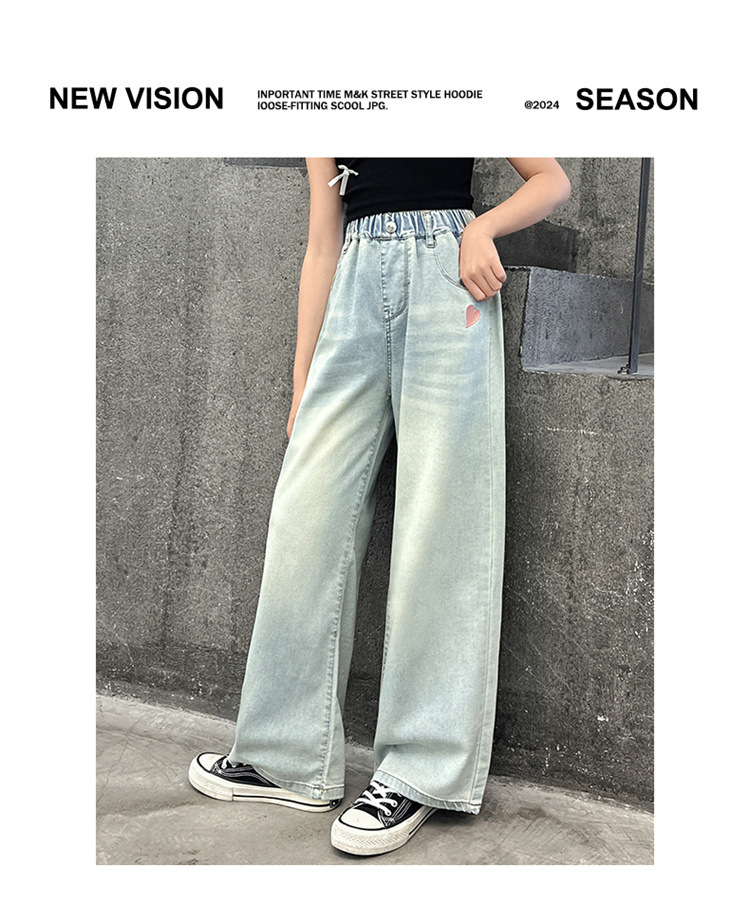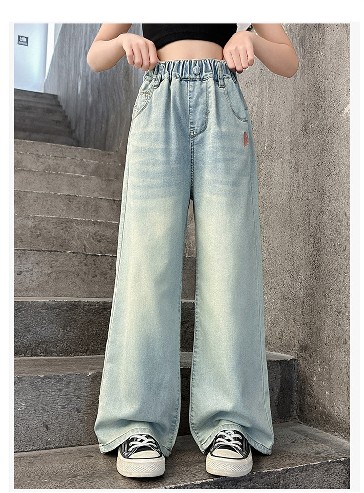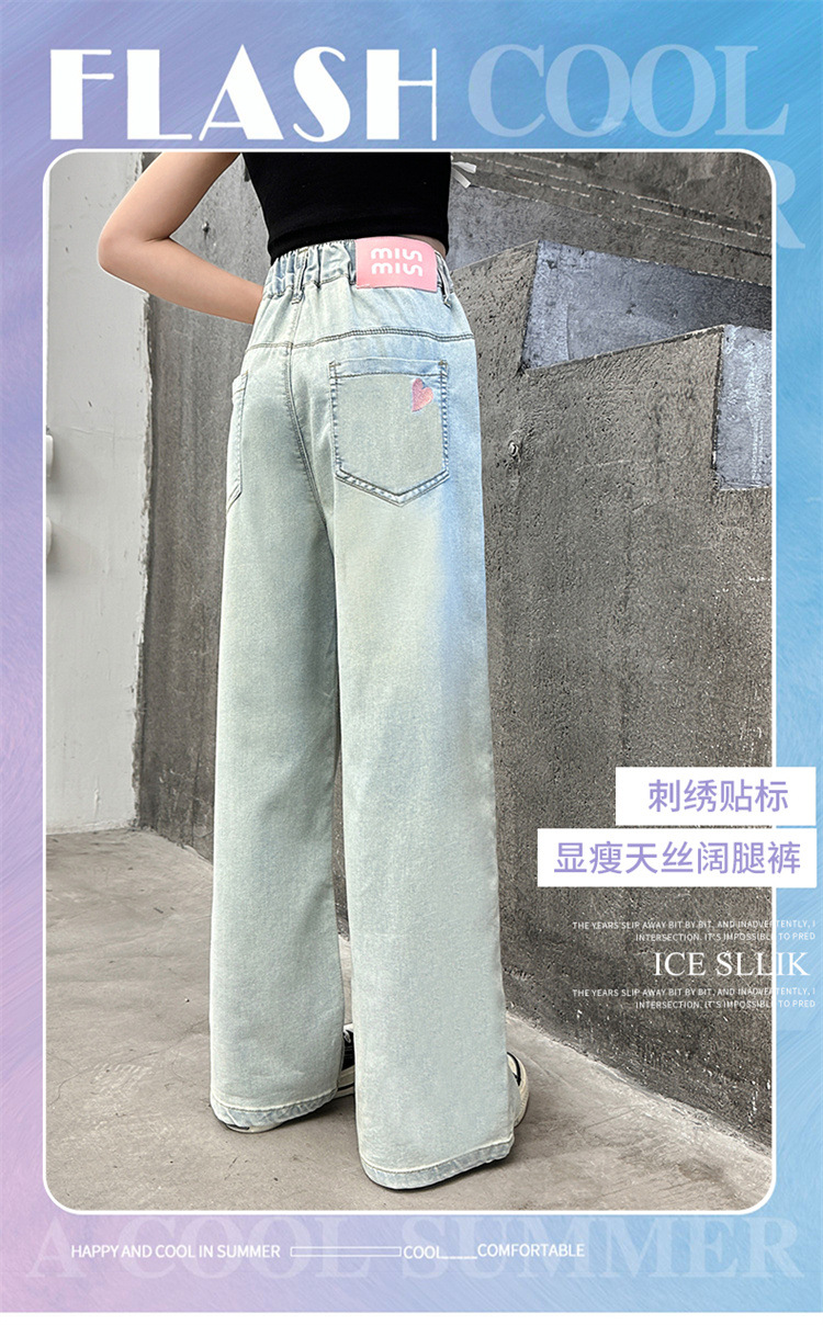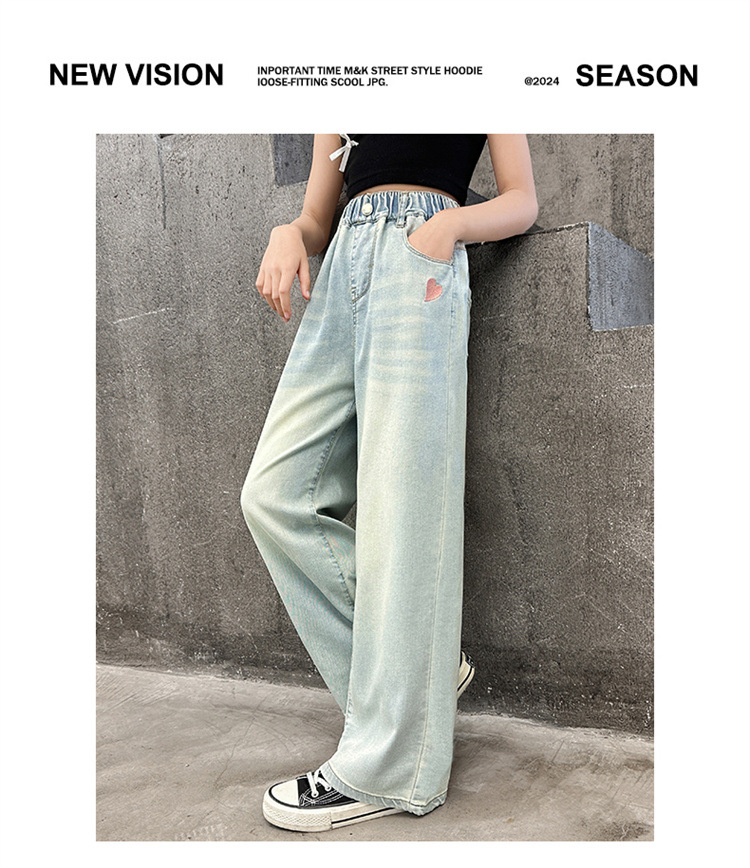 소녀의 바지 여름 얇은 2024 새로운 어린이 청바지 소녀의 큰 어린이 여름 유행 느슨한 넓은 다리 바지스토어 가기