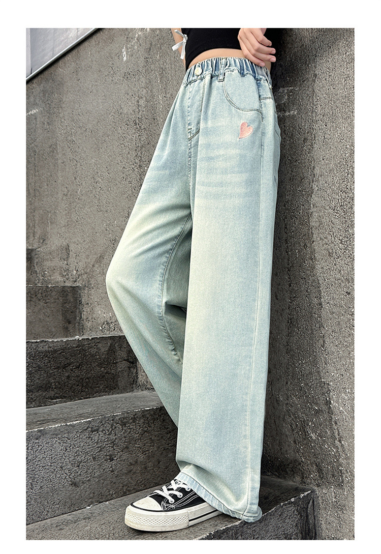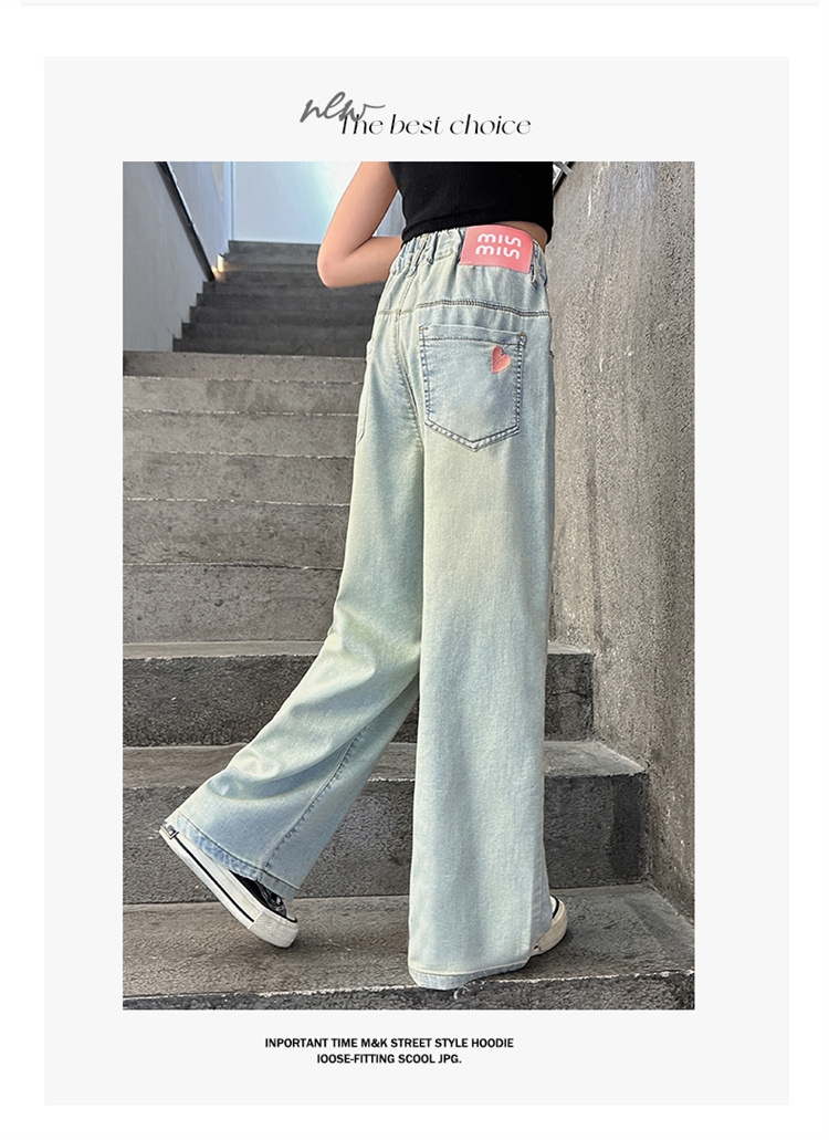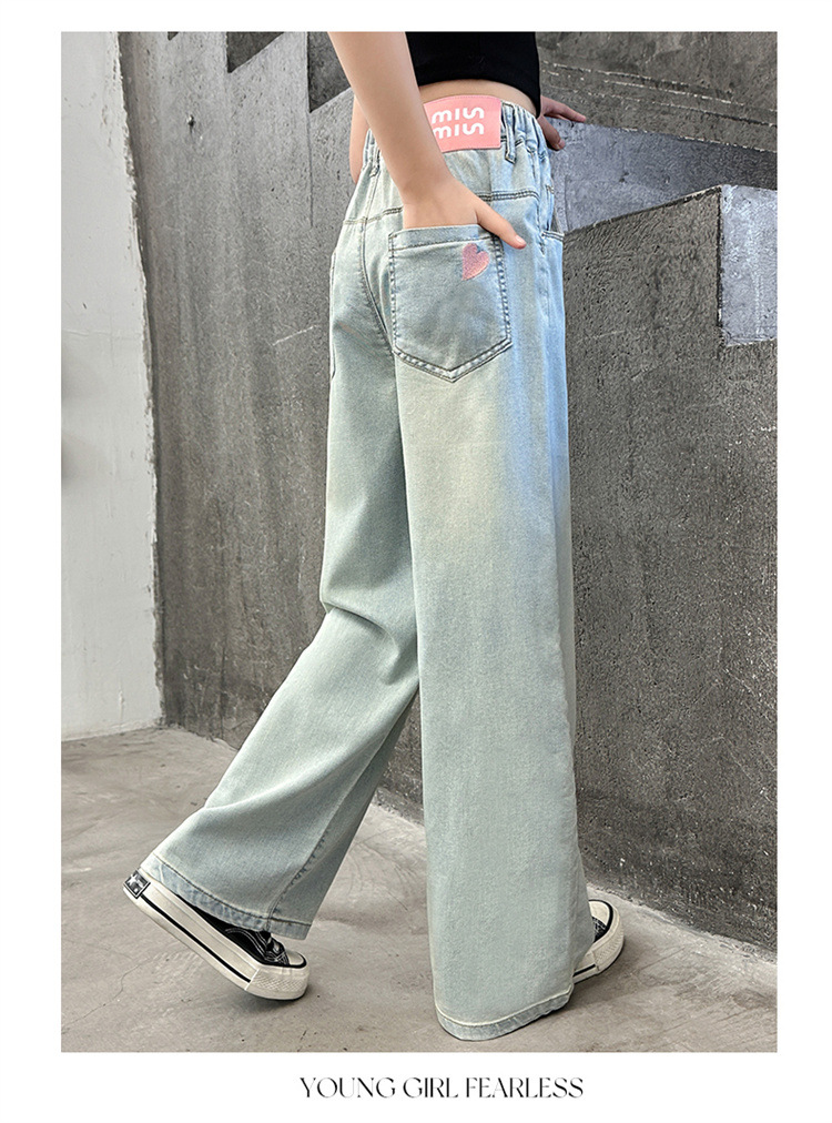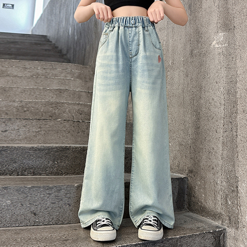 소녀의 바지 여름 얇은 2024 새로운 어린이 청바지 소녀의 큰 어린이 여름 유행 느슨한 넓은 다리 바지