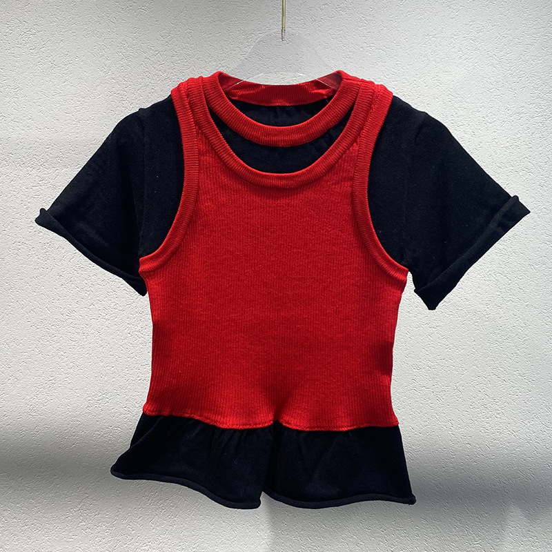 Xiaozhong 2024 봄과 여름 새로운 스티칭베이스 셔츠 탑 캐주얼 풀오버 가짜 여성용 반팔 스웨터스토어 가기
