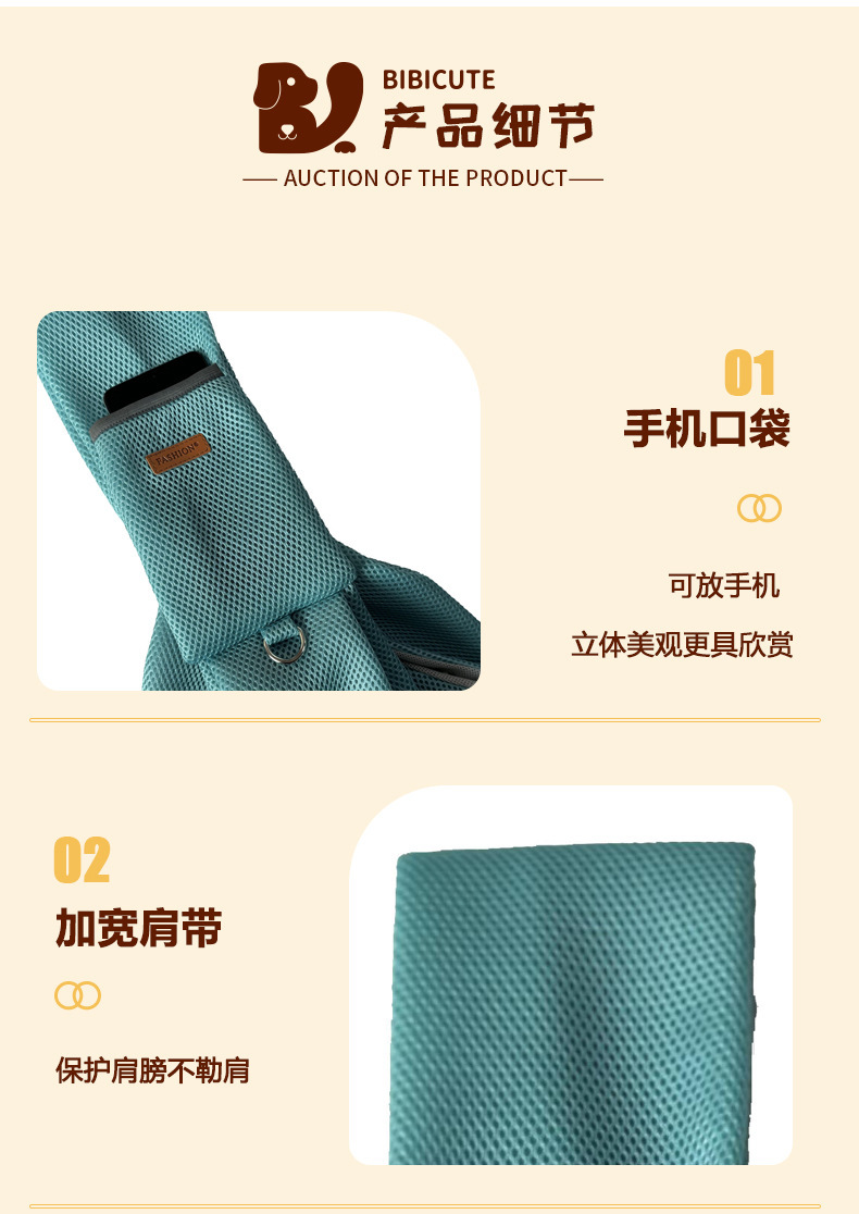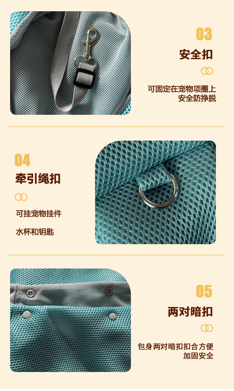 【适用范围】12斤内的小型宠物,猫狗兔子等。外出便于携带,网布结构,透气性好。可折叠便于收纳,不占地方。带牵引绳扣,小口袋,可放钥匙手机等物品。宽肩带,久背不累。