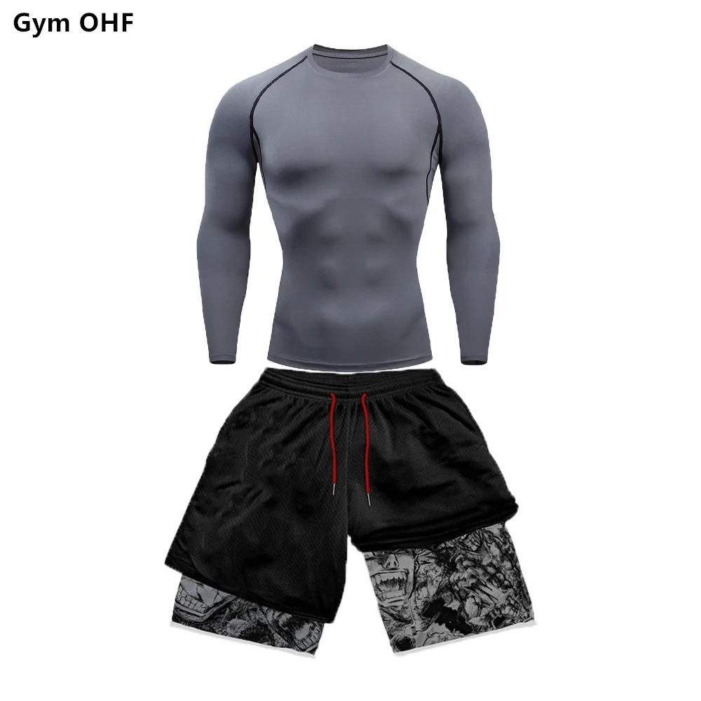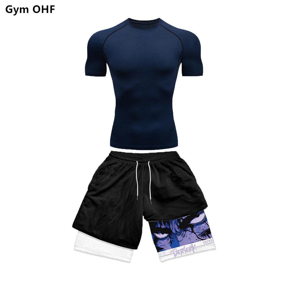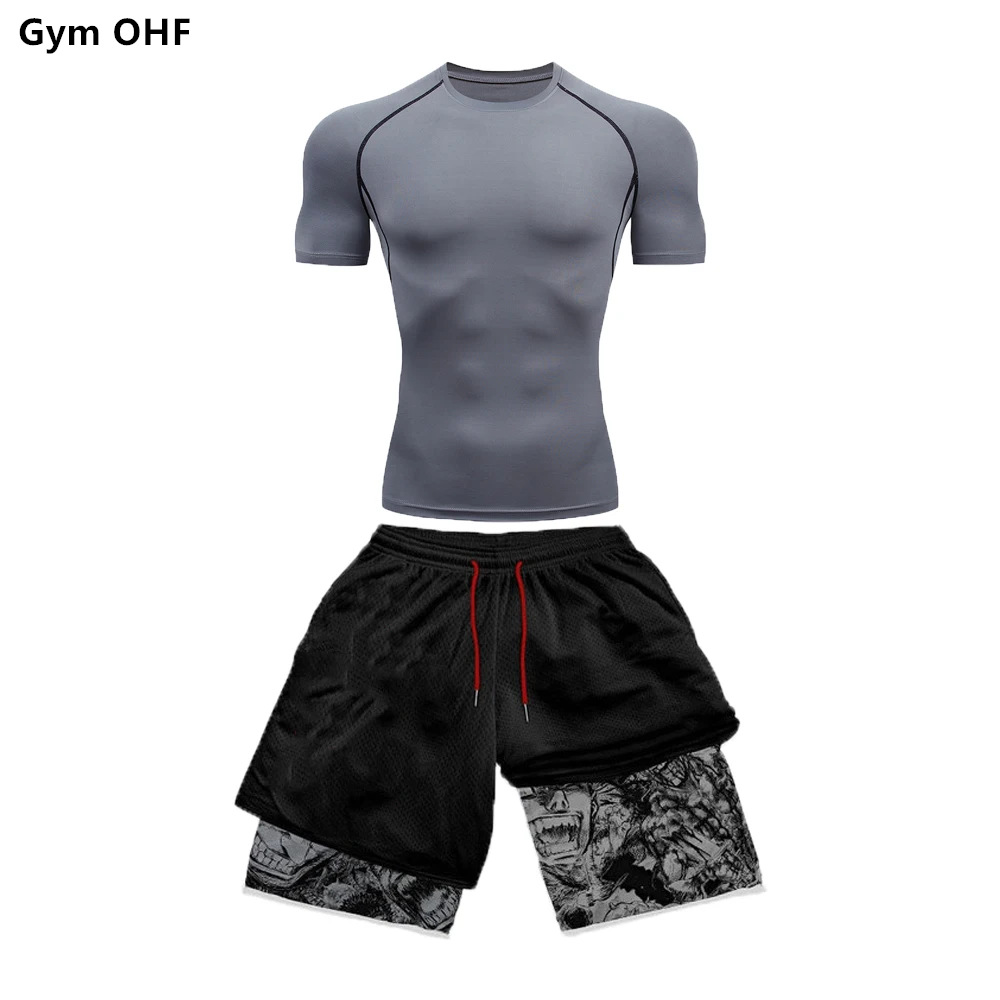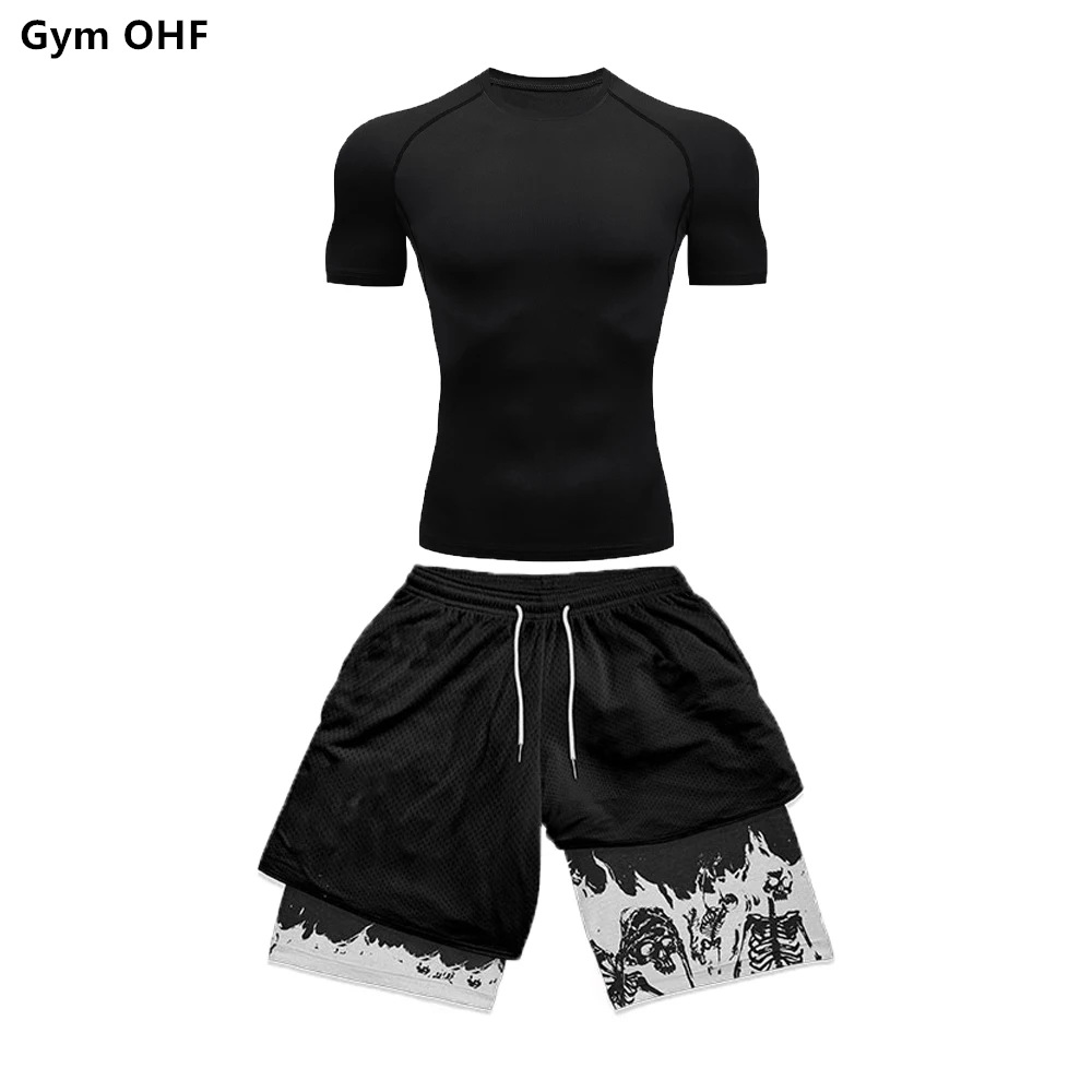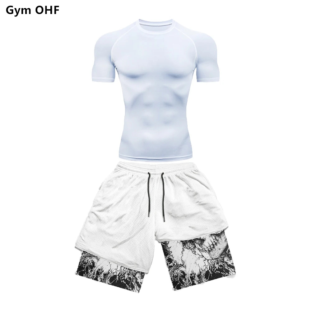 AliExpress 국경 남성 티셔츠 3D 디지털 인쇄 더블 레이어 반바지 2 피스 빠른 건조 러닝 트레이닝 세트