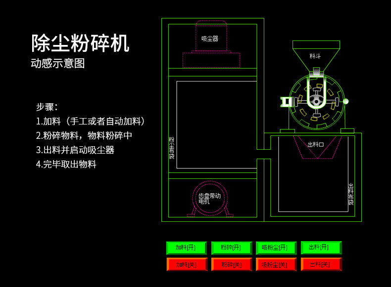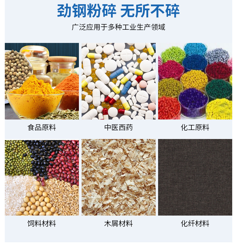本机主要适用于化工、染料、助剂、饲料、食品、医药、木屑、化纤及非金属矿等中低物料的粉碎加工,细度在20-200目之间调节,具有产量高、粒度细、噪声低、能耗低、维修简单、安装方便等优点,特别适用于油性、粘性、热敏性、纤维性等中低硬度物料的粉碎加工。