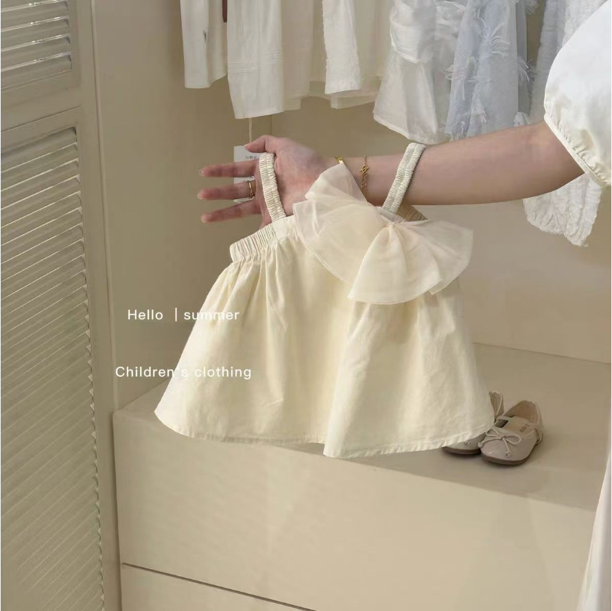 소녀 여름 세트 2024 새로운 세련된 아기 소녀의 활 조끼 슬링 레이스 반바지 투피스 유행 세트스토어 가기