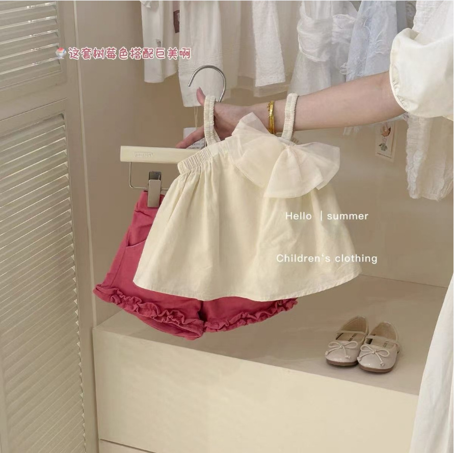 소녀 여름 세트 2024 새로운 세련된 아기 소녀의 활 조끼 슬링 레이스 반바지 투피스 유행 세트