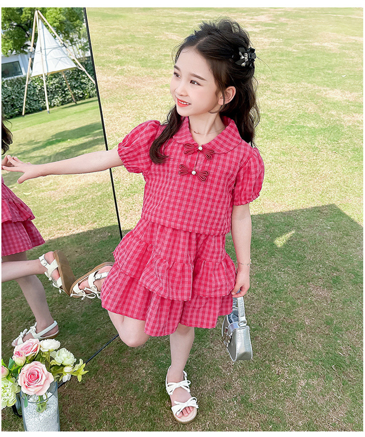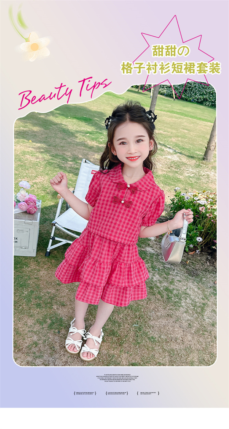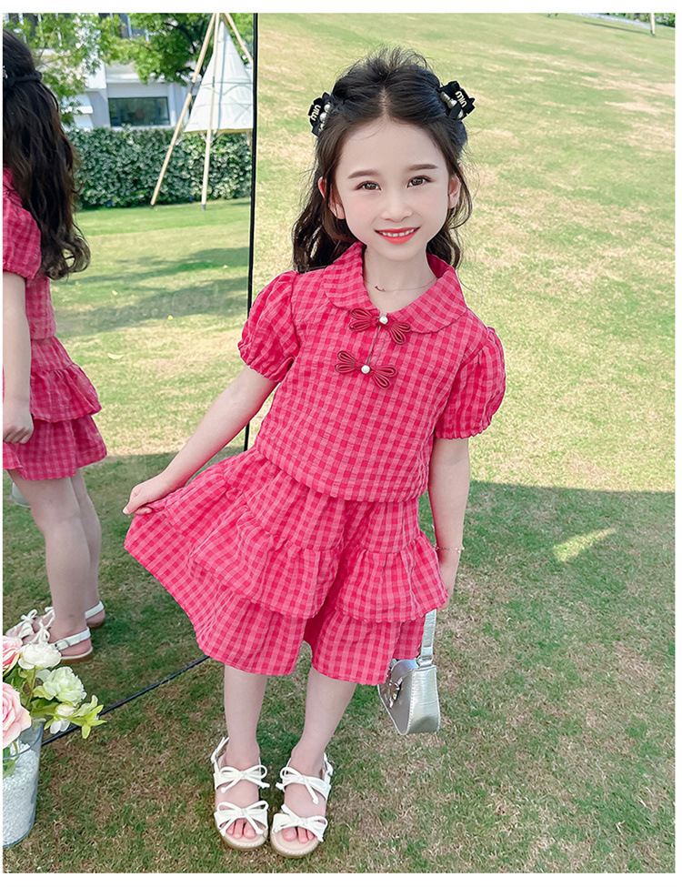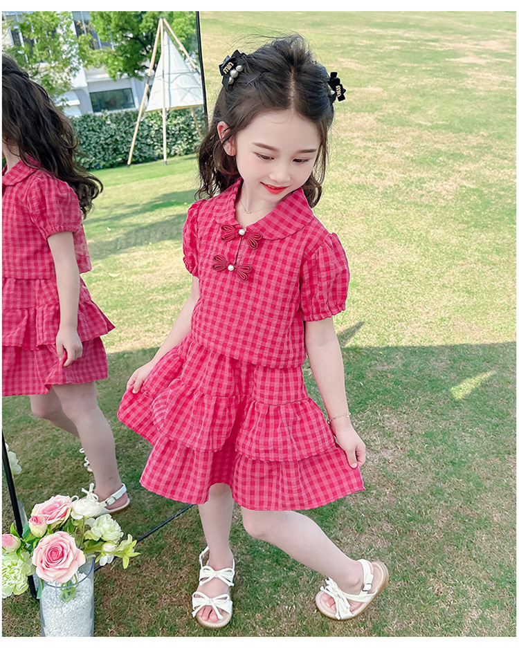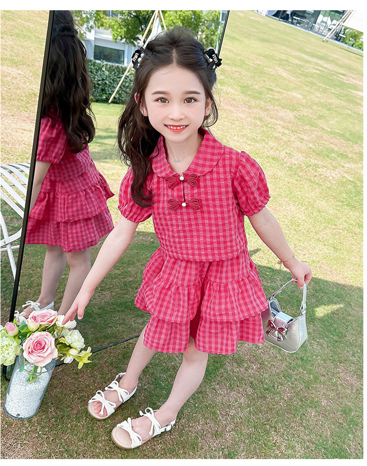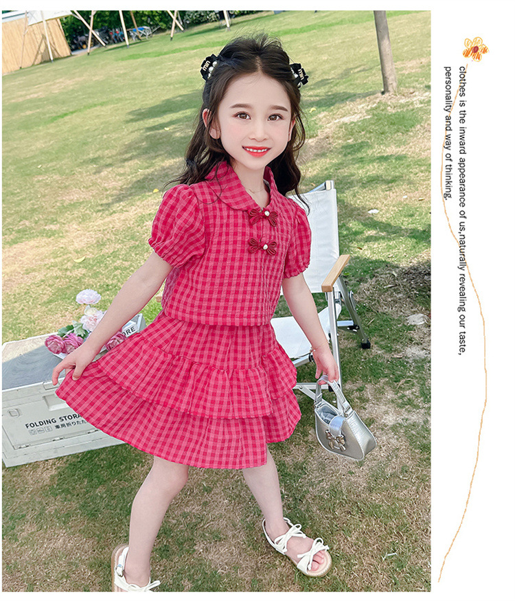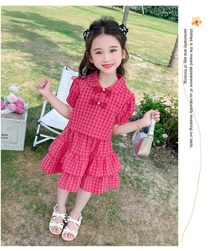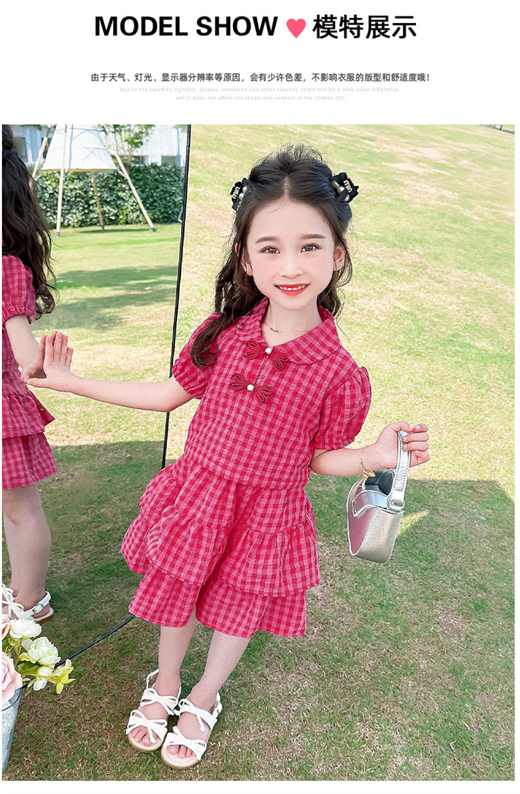 소녀 여름 세트 2024 새로운 패션 어린 소녀 스포츠 스타일 빨간 격자 무늬 원피스 2 피스 세트스토어 가기