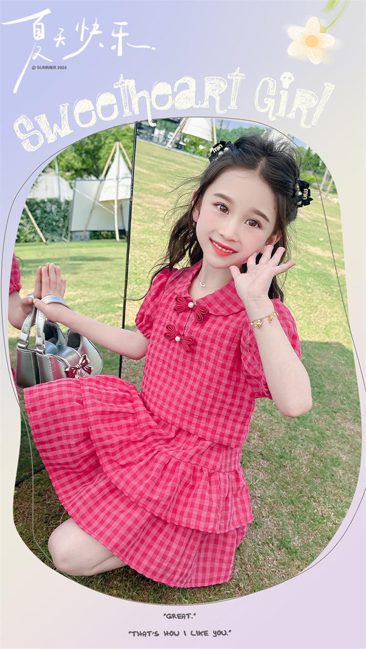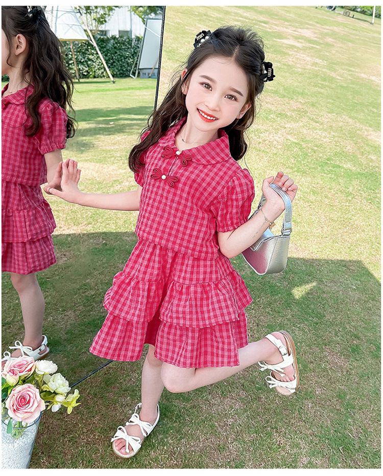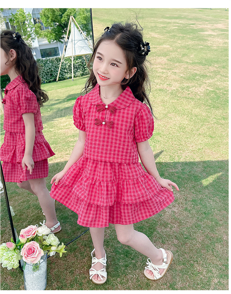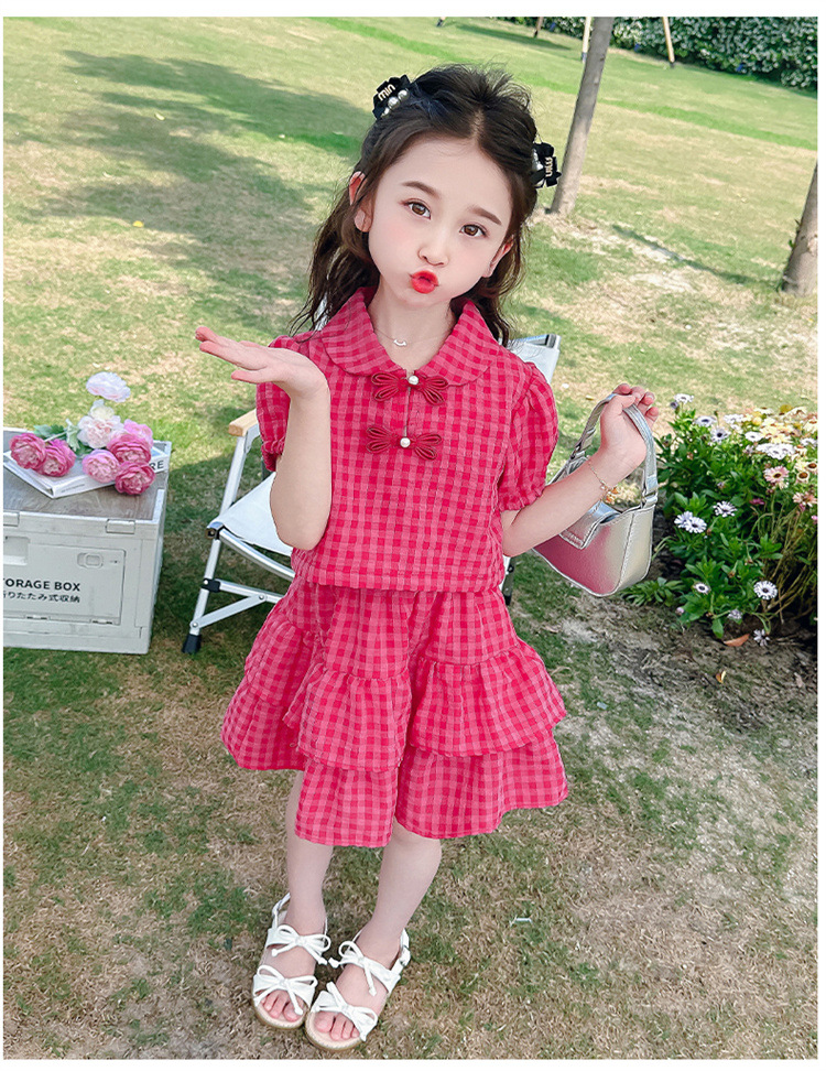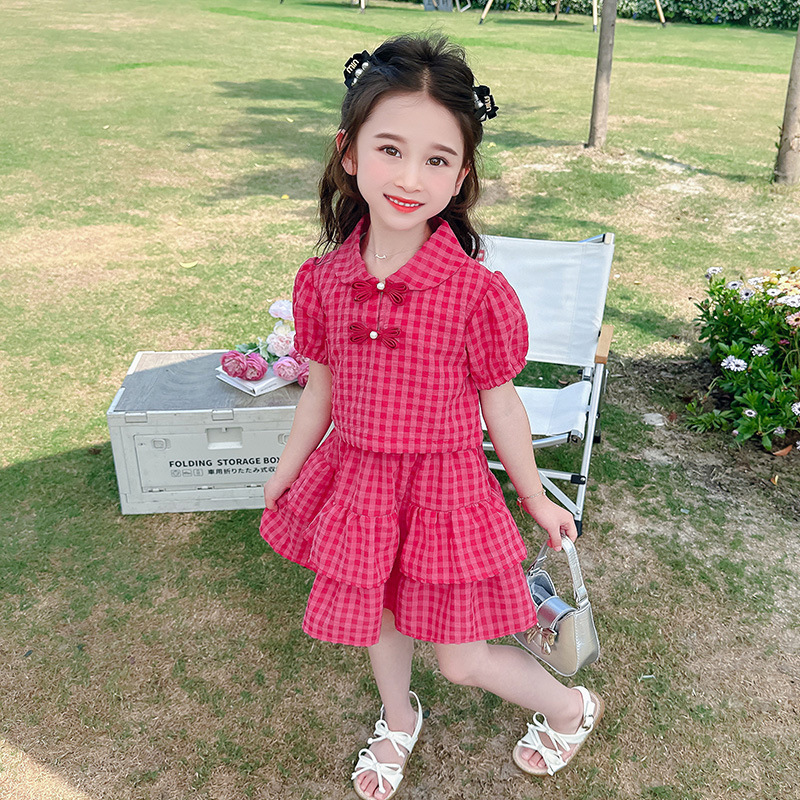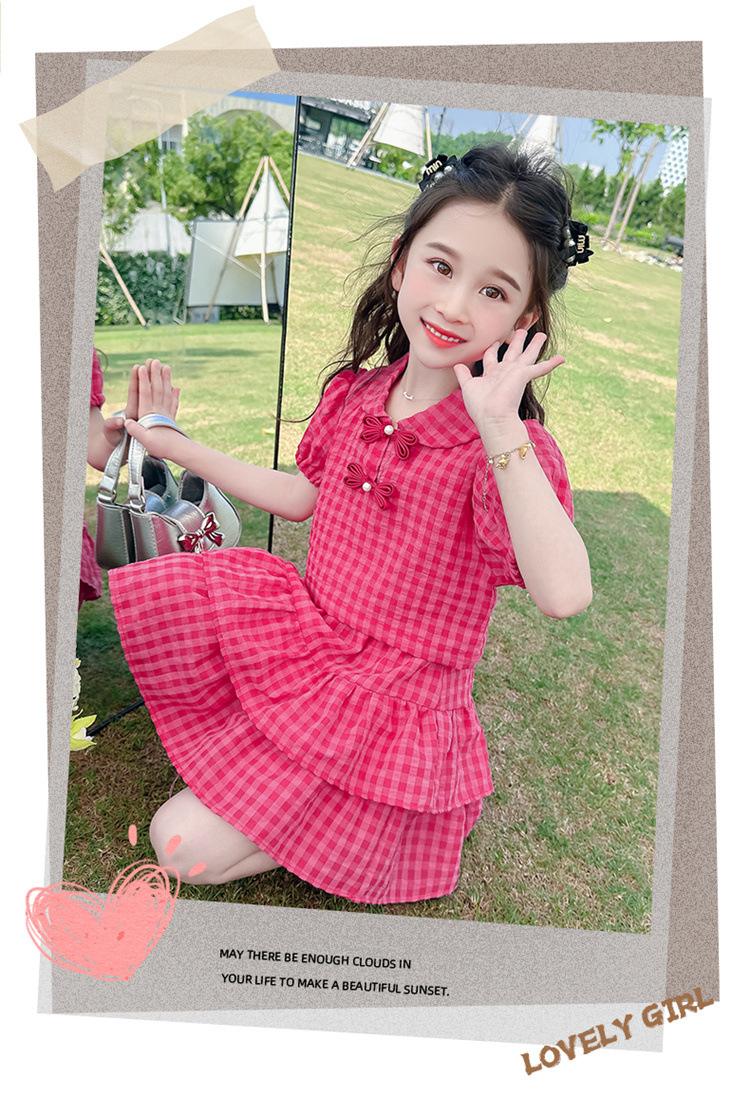 소녀 여름 세트 2024 새로운 패션 어린 소녀 스포츠 스타일 빨간 격자 무늬 원피스 2 피스 세트