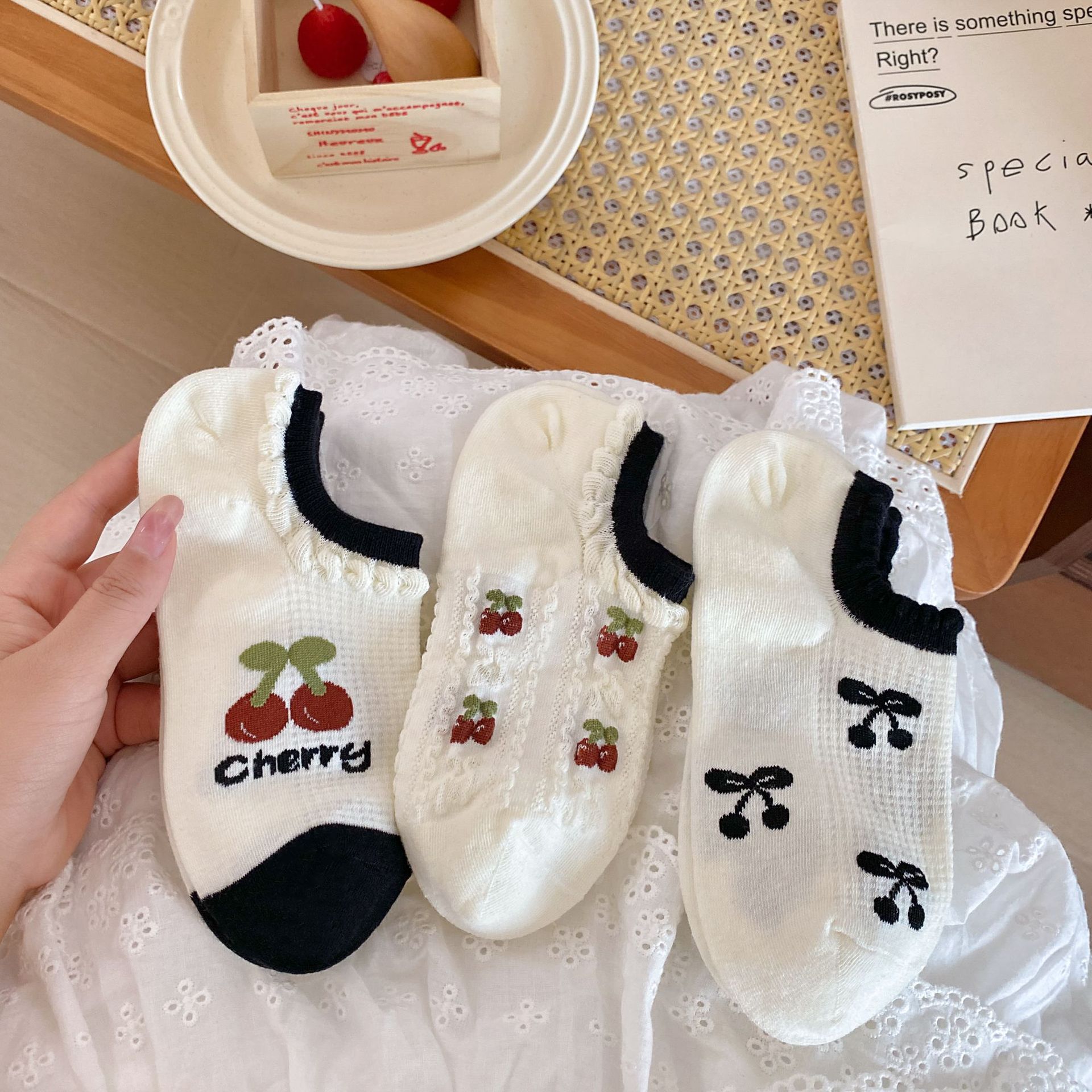 사랑스러운 양말 여성 여름 얇은 면 양말 충격 입 보이지 않는 보트 양말 짧은 체리 한국식 통기성 땀 흡수 미끄럼 방지 양말
