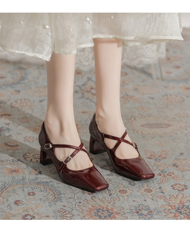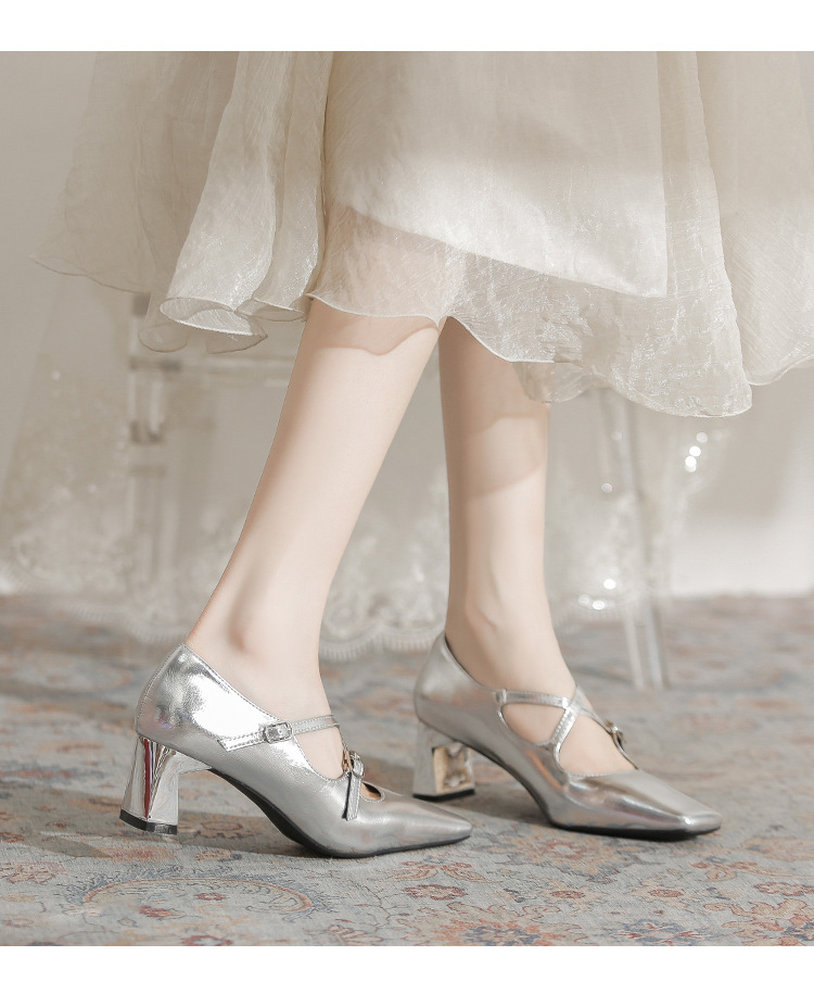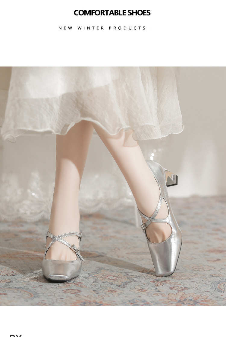 6368-3 크로스 버클 뉴 메리 제인 여성 신발 스퀘어 토 레트로 실버 두꺼운 힐 얕은 입 올 매치 프렌치 싱글 슈즈