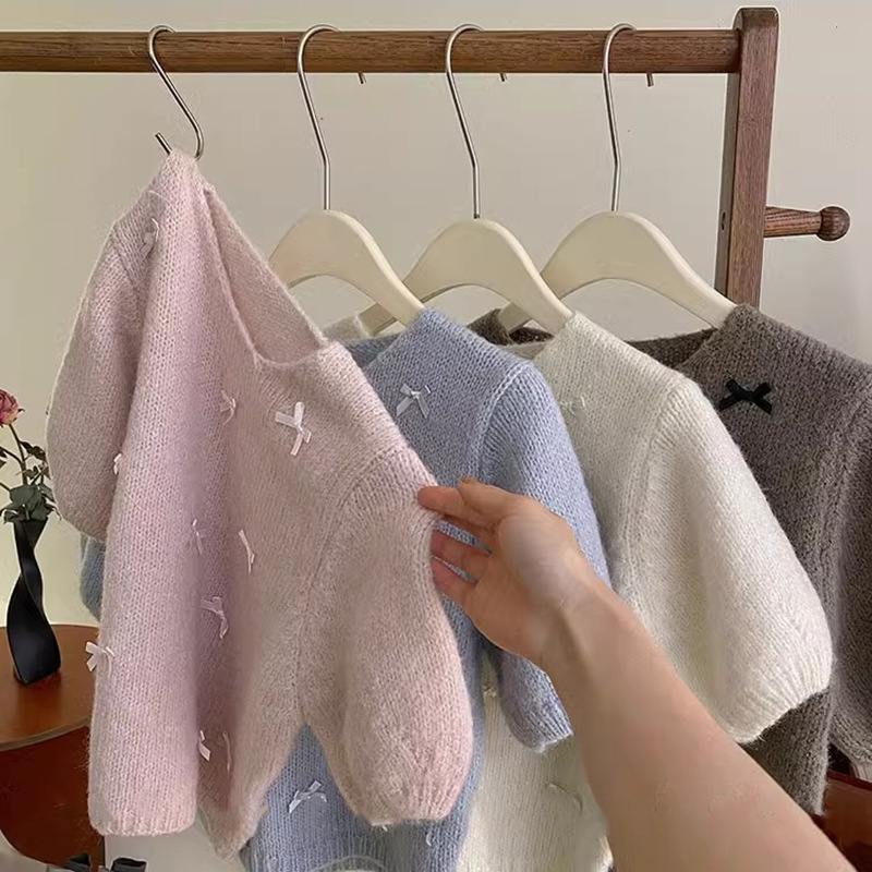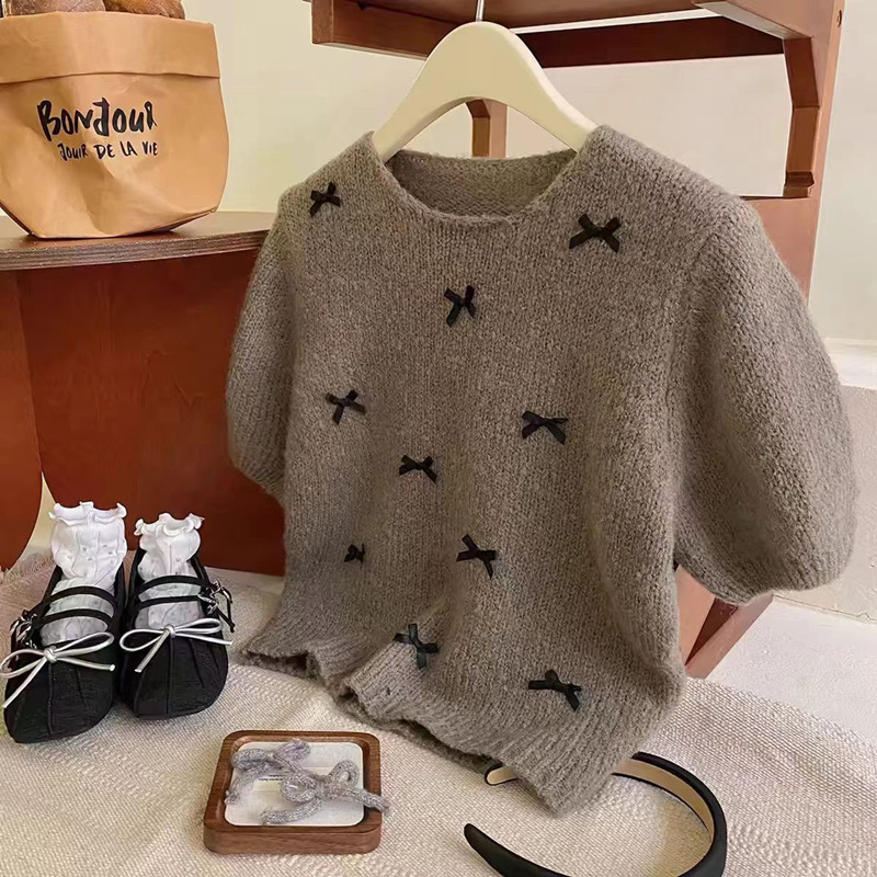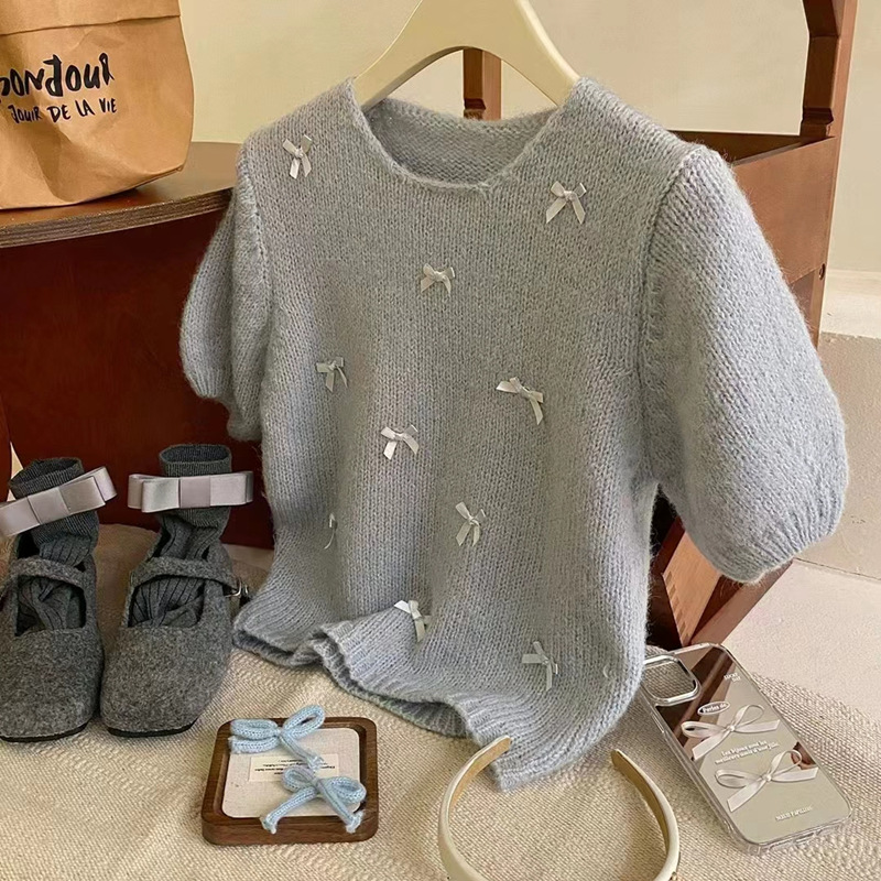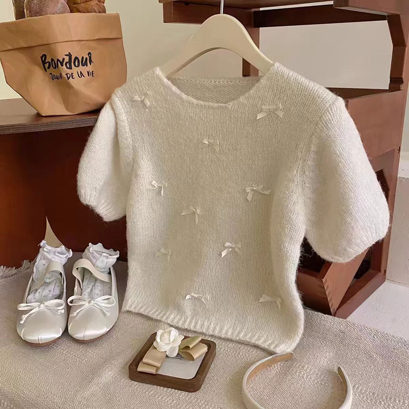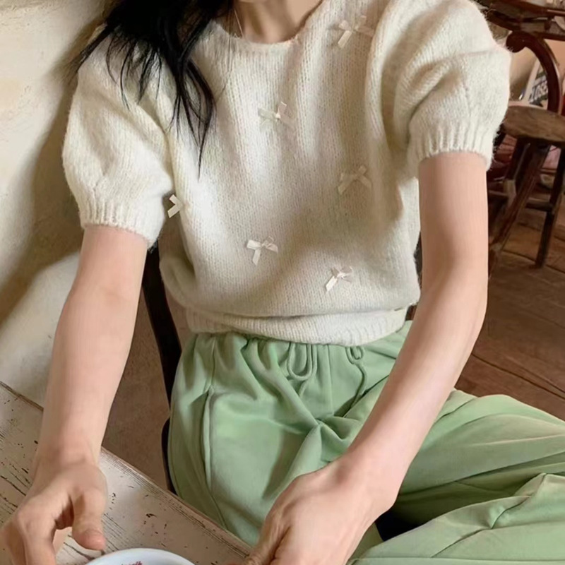 한국 세련된 봄 여름 작은 활 짧은 소매 라운드 넥 스웨터 여성의 봄 달콤한 소프트 왁스 퍼프 슬리브 탑