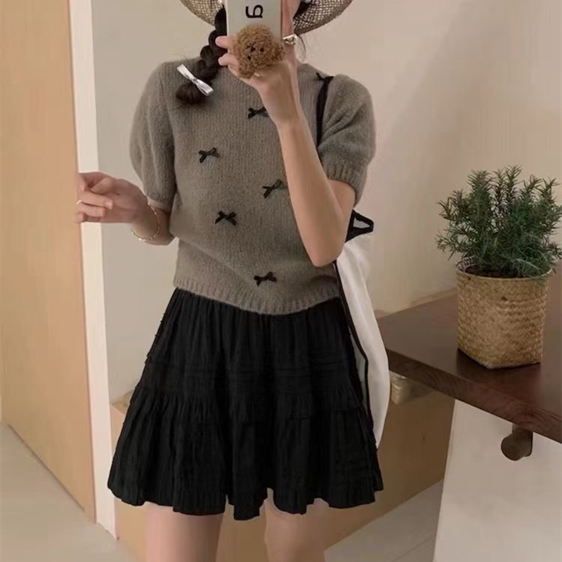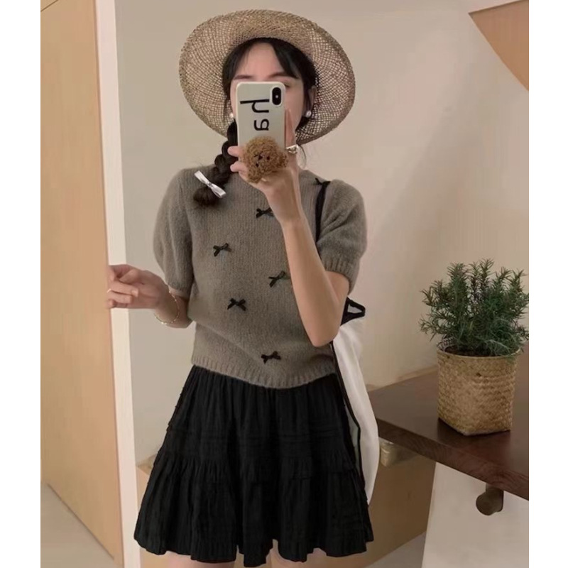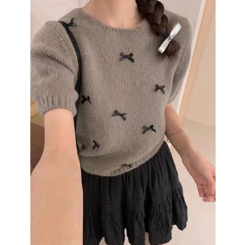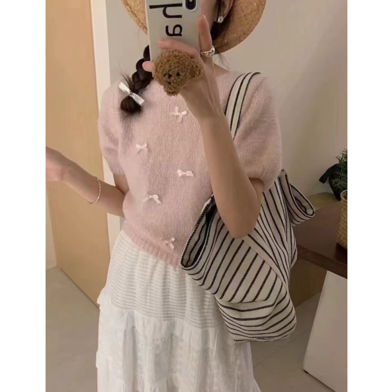 한국 세련된 봄 여름 작은 활 짧은 소매 라운드 넥 스웨터 여성의 봄 달콤한 소프트 왁스 퍼프 슬리브 탑스토어 가기