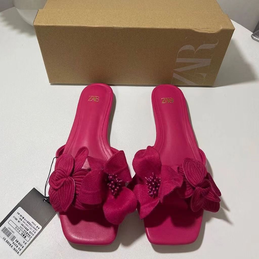 ZA New 2023 Square Toe 프랑스 여성 신발 로즈 플라워 오픈 발가락 빈 하프 드래그 여성용 샌들