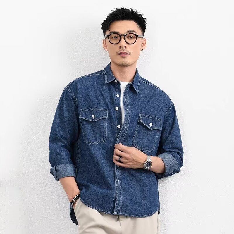 유행 더블 포켓 세탁 오래 된 데님 셔츠 남자의 봄과 가을 한국 스타일 느슨한 고급 긴팔 작업 셔츠스토어 가기