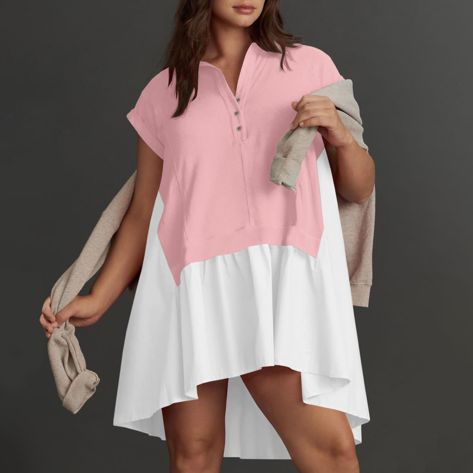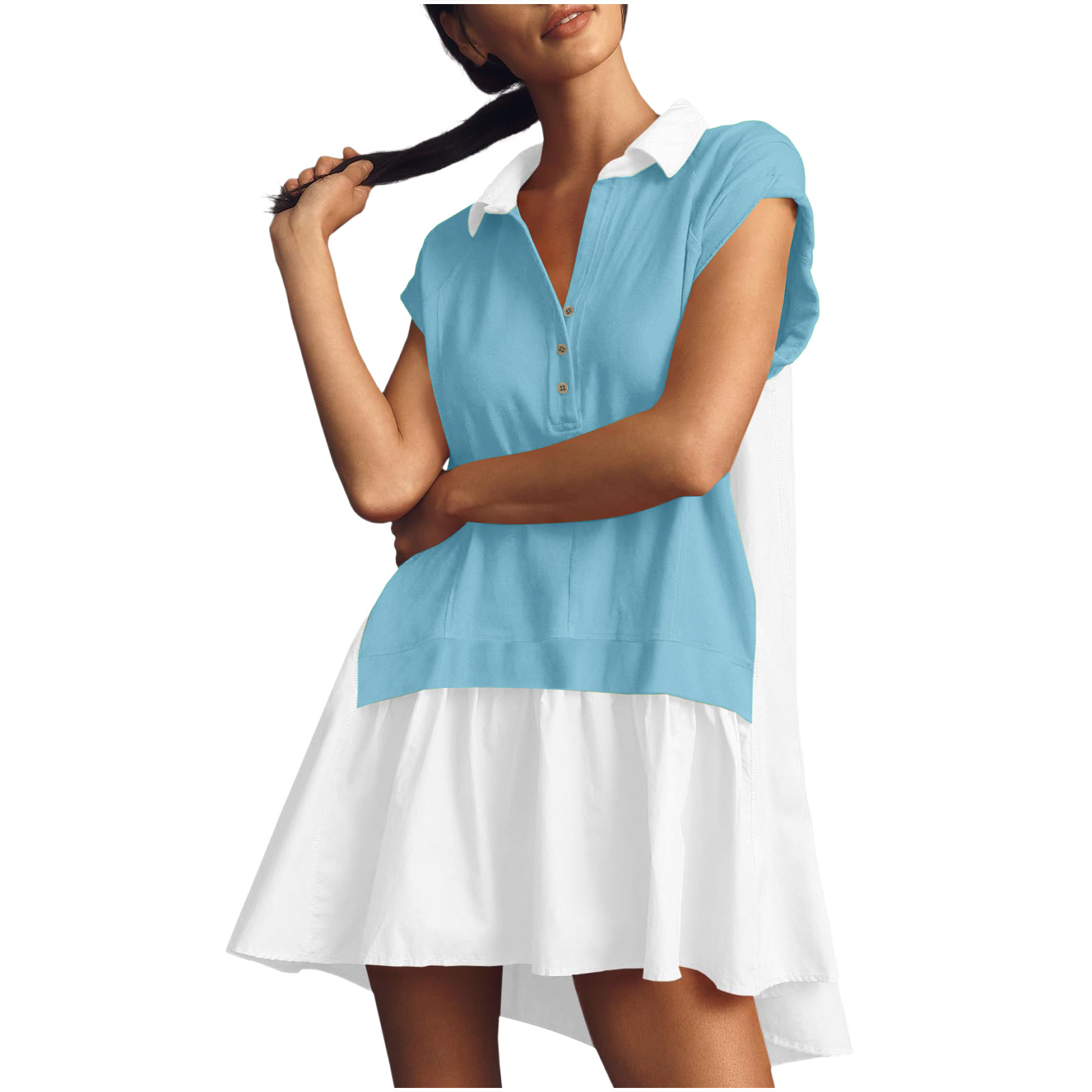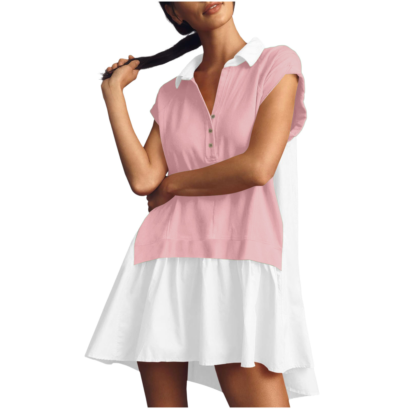 2024 크로스 보더 여성용 컬러 매칭 셔츠 칼라 스웨터 셔츠 셔츠 스티칭 플러스 사이즈 스웨터 스커트 반팔 원피스