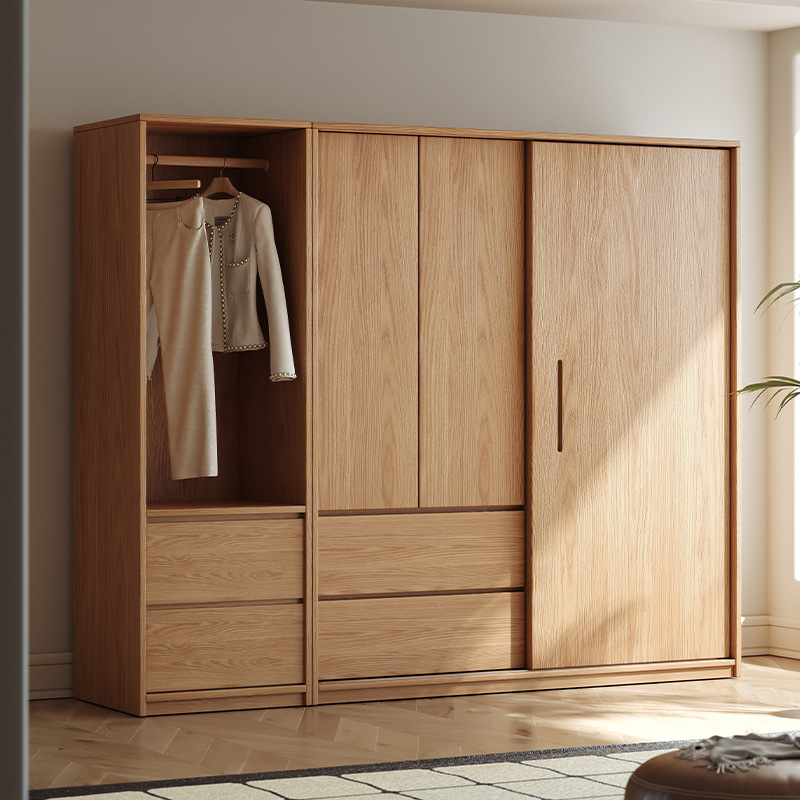 M & Solid Wood Oak 슬라이딩 도어 옷장 홈 침실 로그 스타일 현대 간단한 옷장 적재 도어 마스터 침실 옷