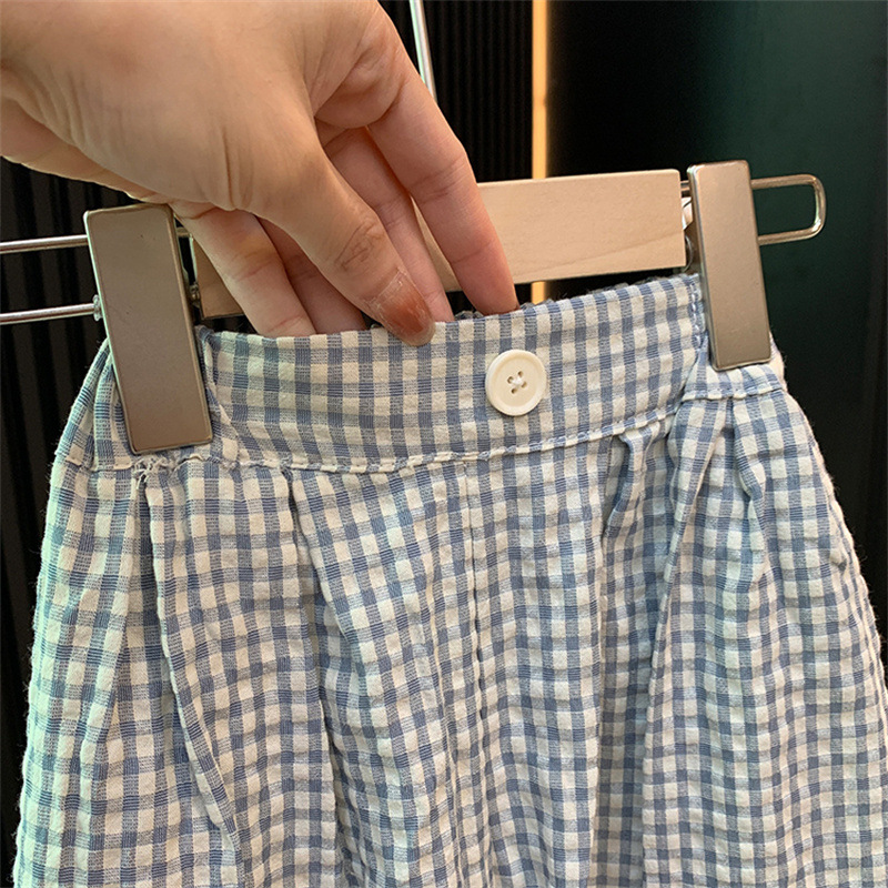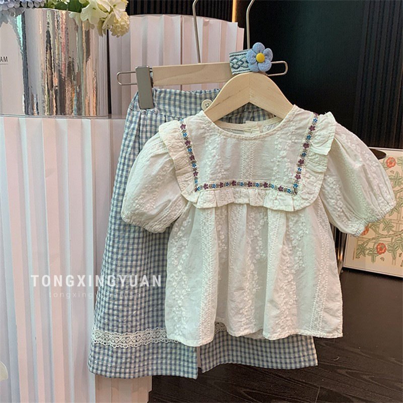 어린이 Xingyuan 여자 세트 2024 여름 새로운 어린이 한국 스타일 모리 자수 인형 셔츠 격자 넓은 다리 바지스토어 가기