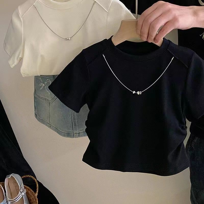 한국 2024 년 여름 소녀 디자인 체인 새로운 반팔 티셔츠 서양식 어린이 톱 쇼트 올 매치