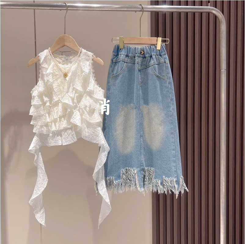여자 여름 세트 2024 한국식 성격 디자인 불규칙한 술 조끼 데님 치마 투피스 세트