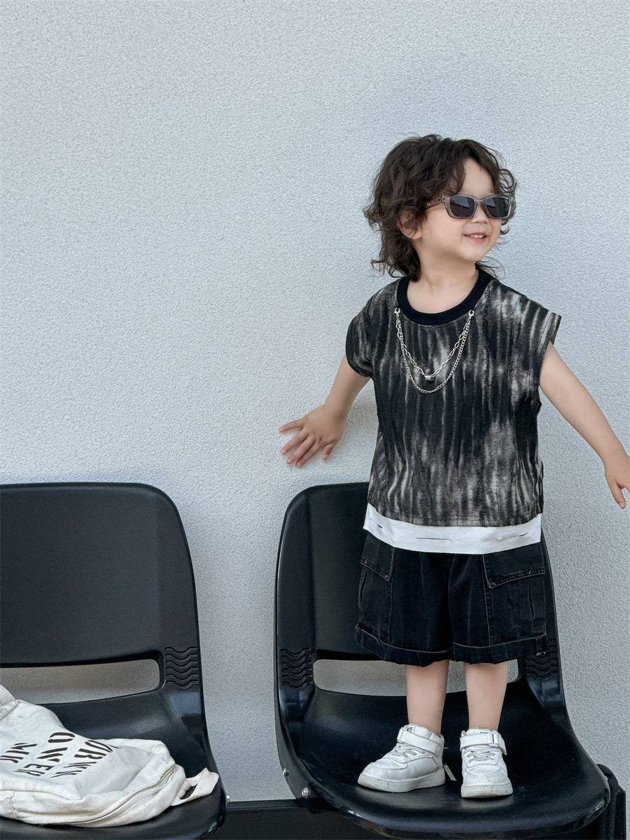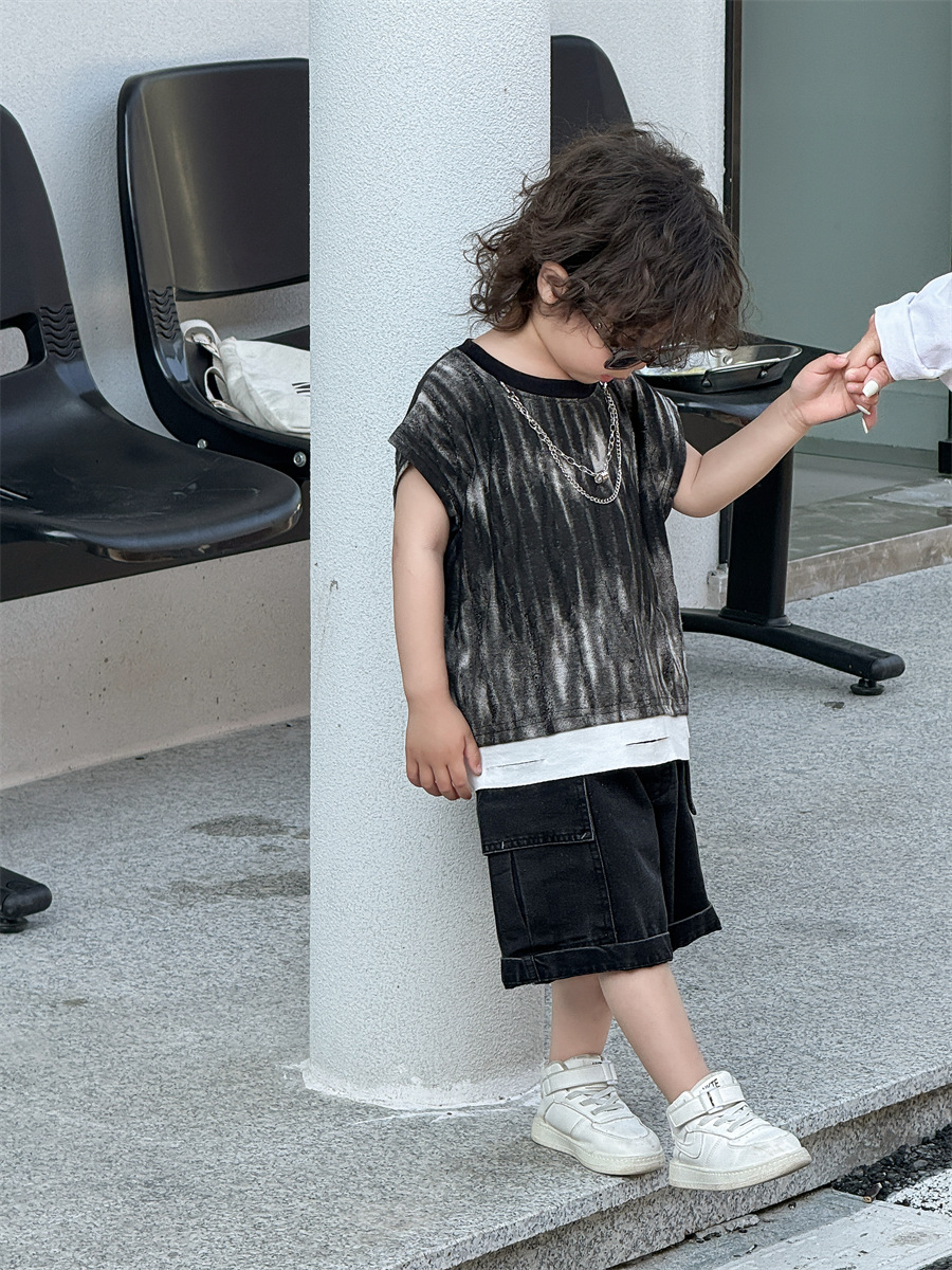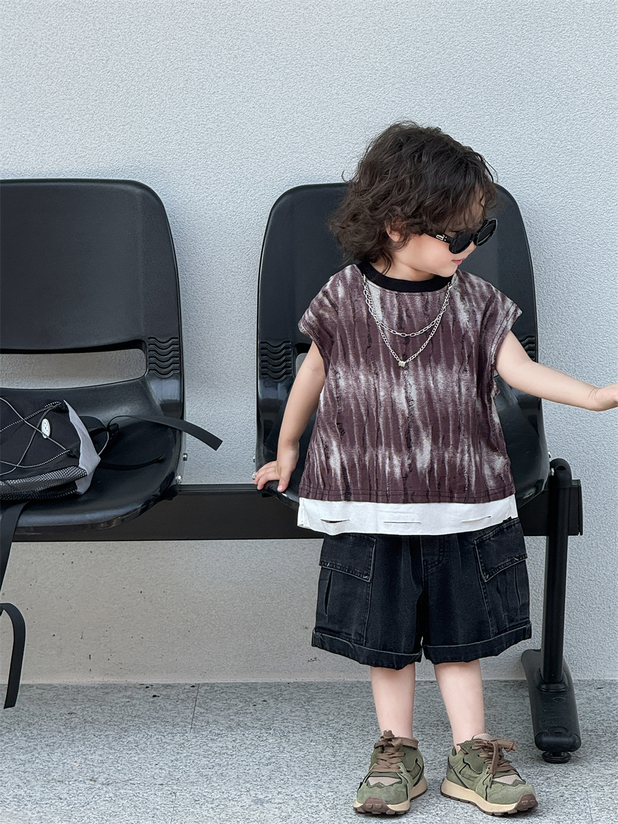 소년 여름 티셔츠 어린이 여름 한국 스타일 얇은 아기 민소매 아동 의류 2025 새로운 가짜 투피스 조끼 트렌드