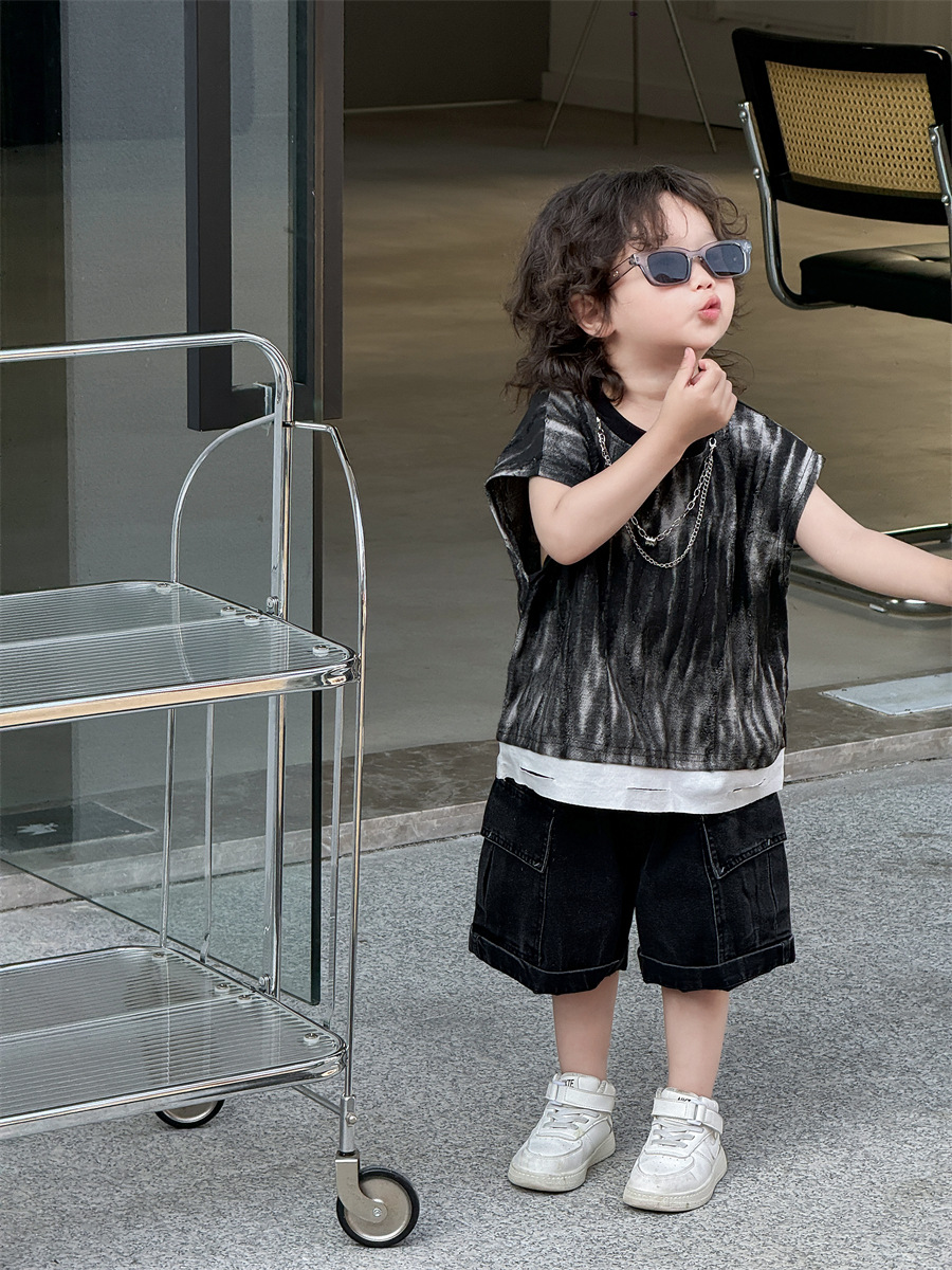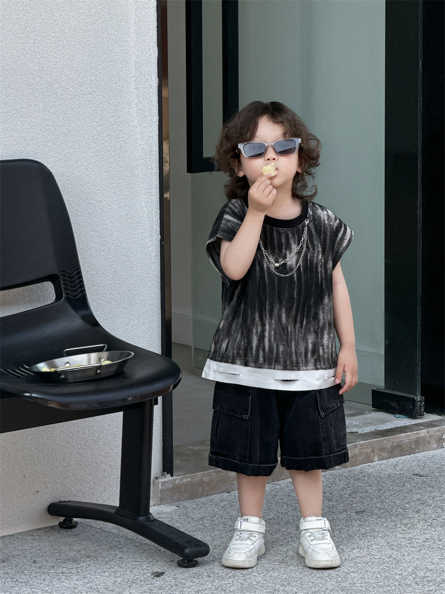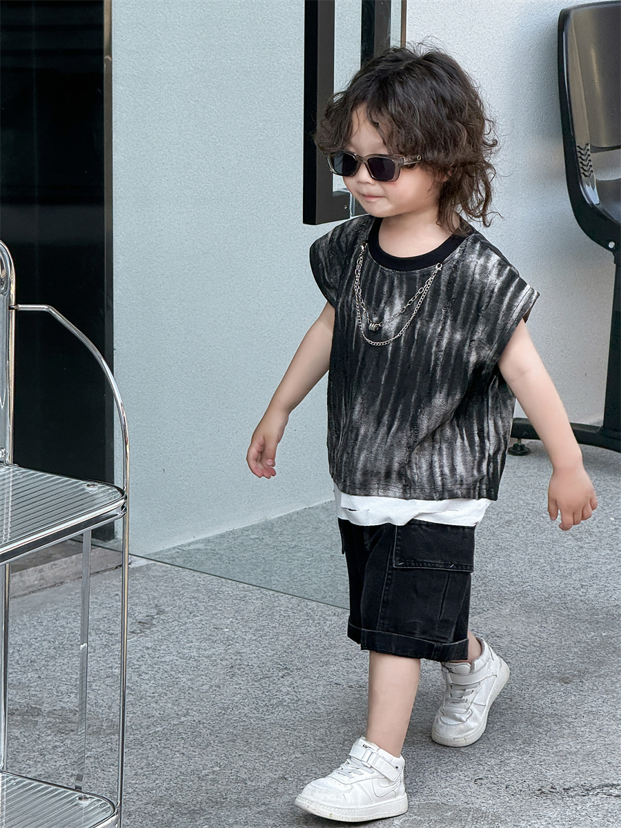 소년 여름 티셔츠 어린이 여름 한국 스타일 얇은 아기 민소매 아동 의류 2025 새로운 가짜 투피스 조끼 트렌드