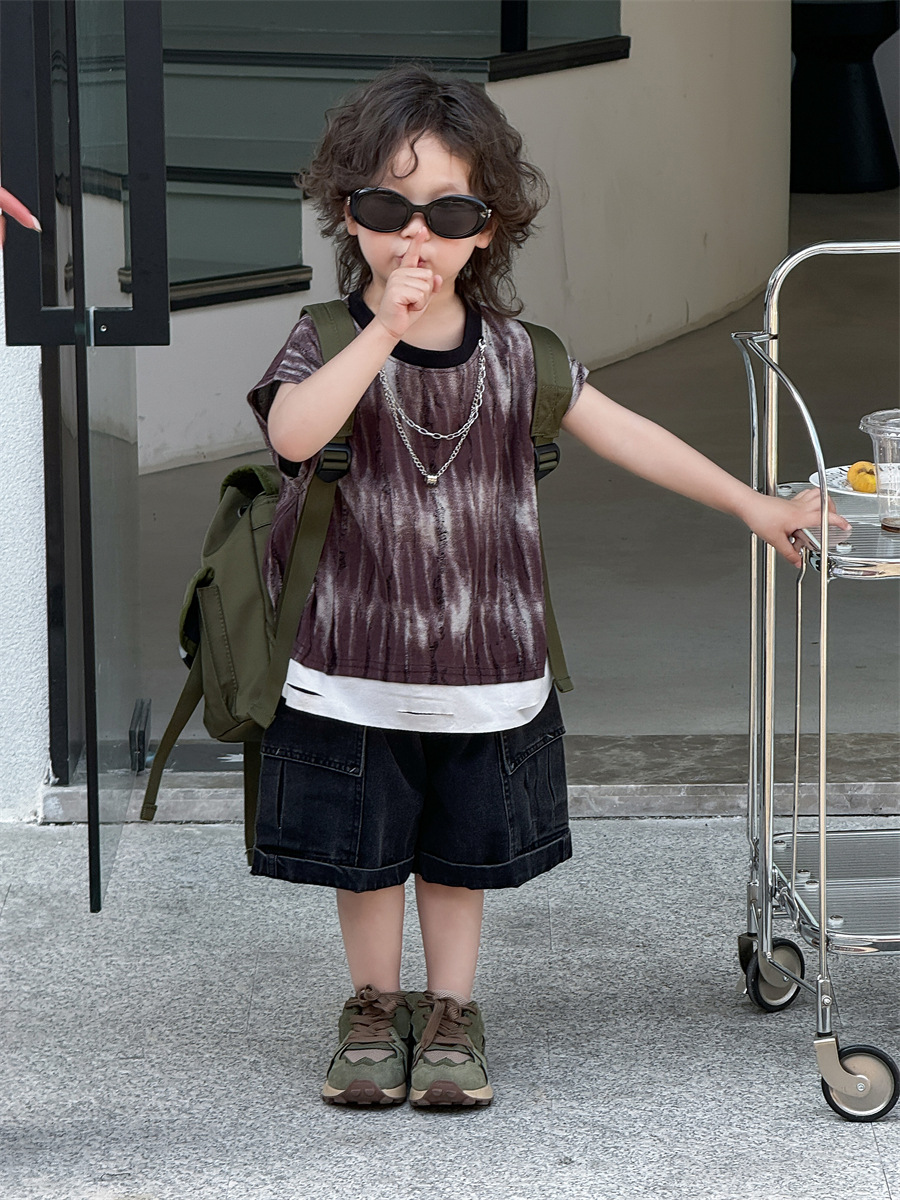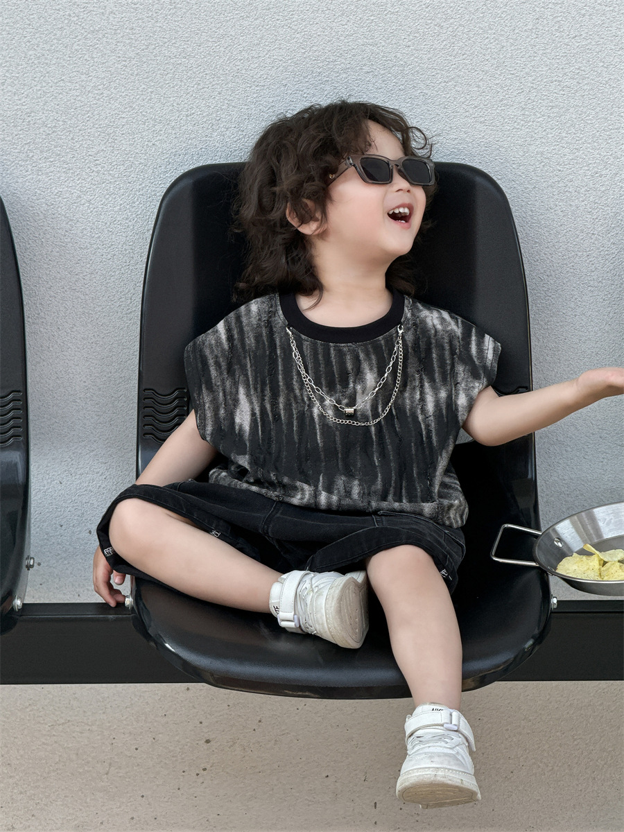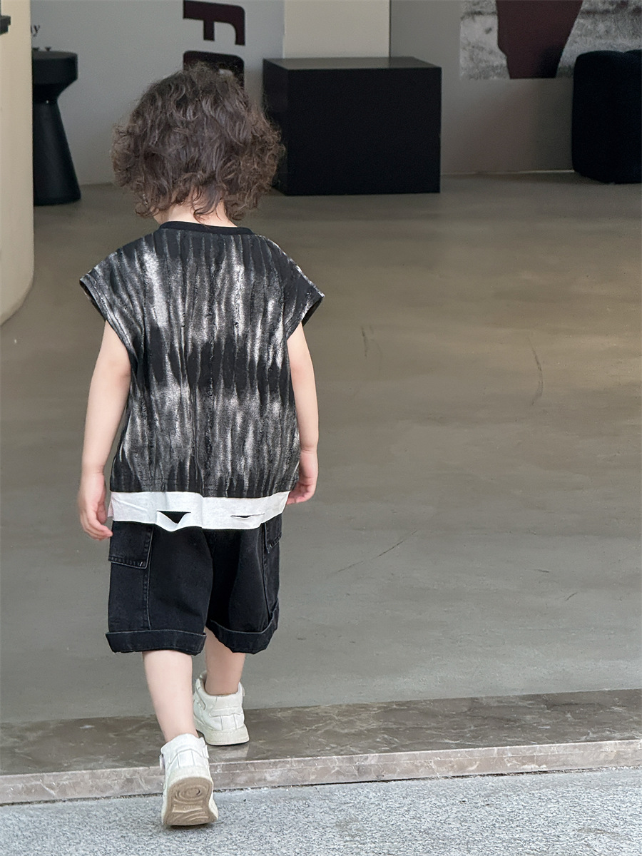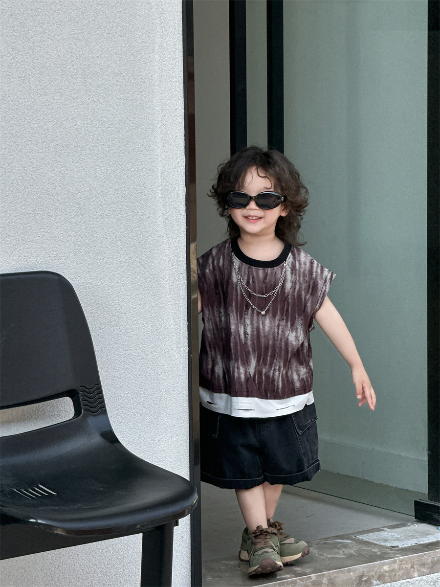 소년 여름 티셔츠 어린이 여름 한국 스타일 얇은 아기 민소매 아동 의류 2025 새로운 가짜 투피스 조끼 트렌드스토어 가기