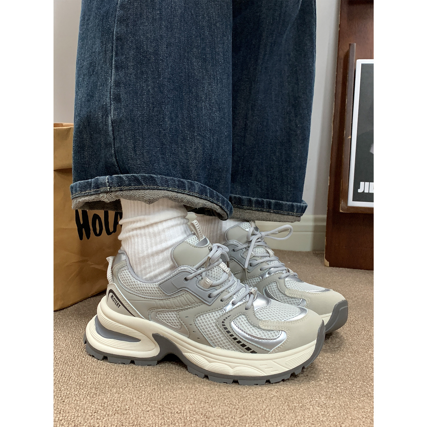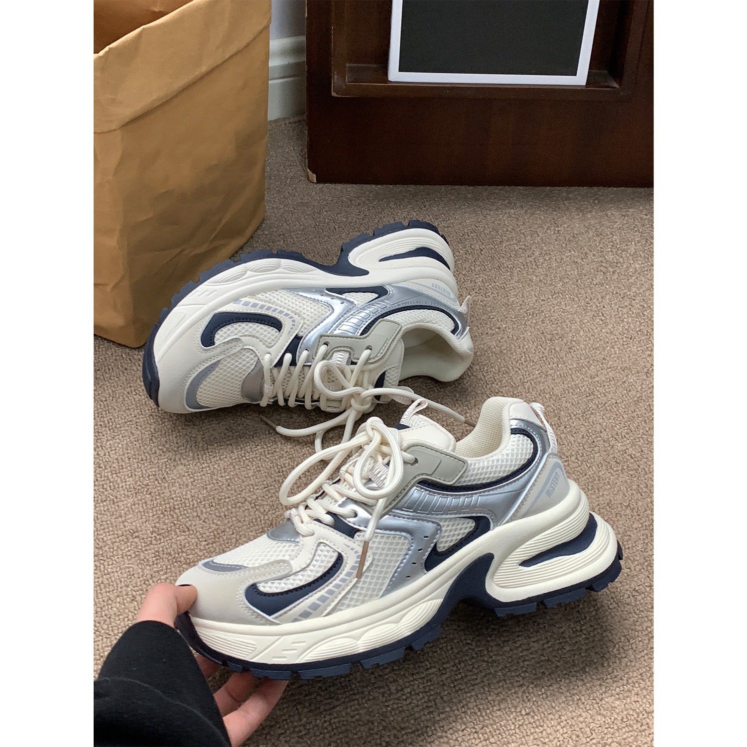 여성을위한 발 보여주는 작은 아빠 신발 봄, 가을 새로운 두꺼운 밑창 고조 캐주얼 스포츠 신발 메쉬 통기성 흰색 신발스토어 가기