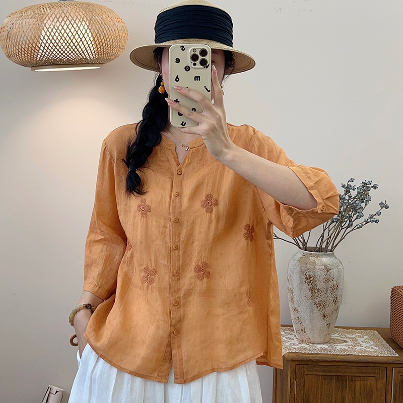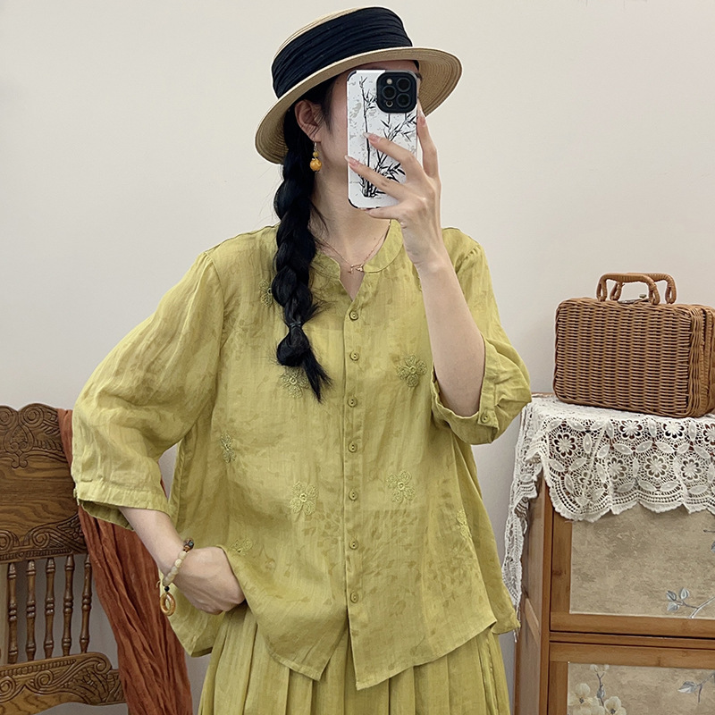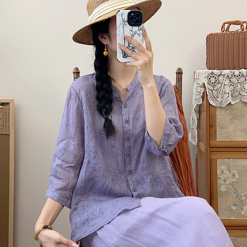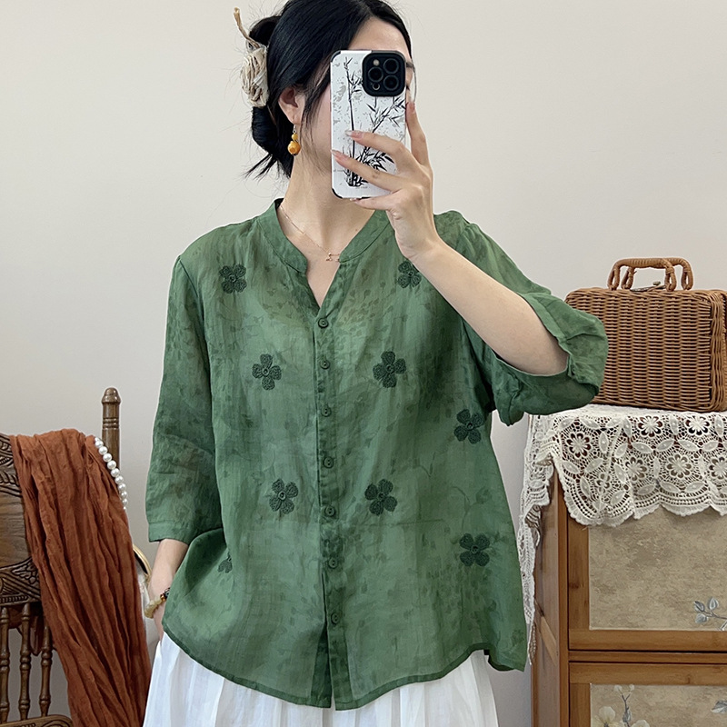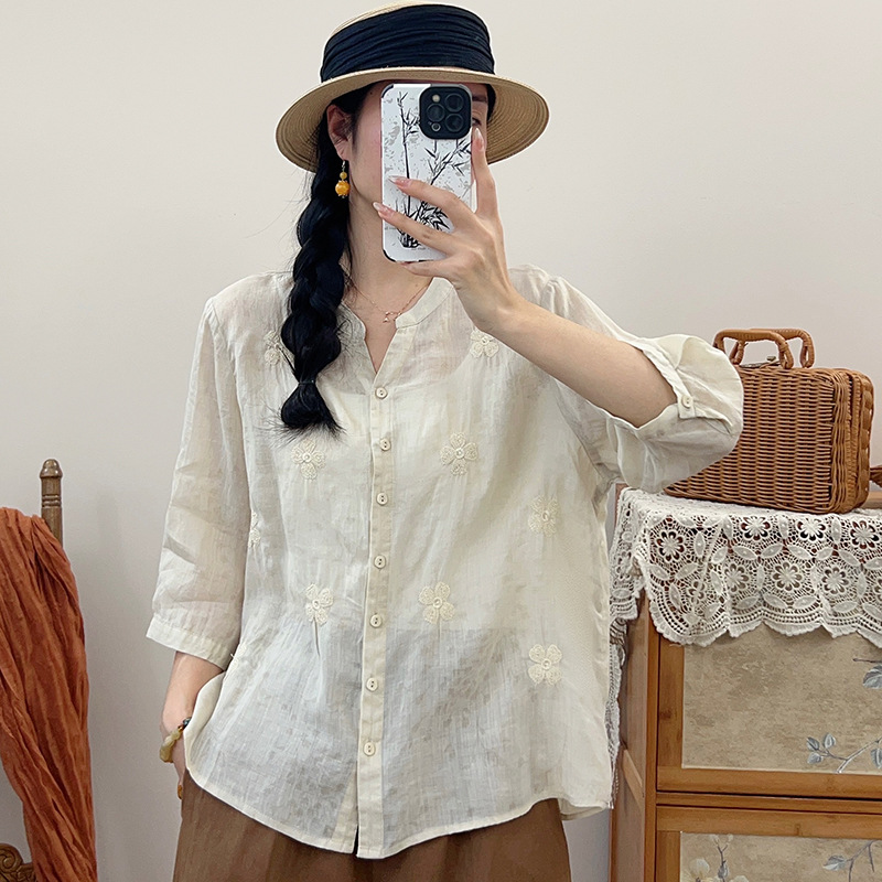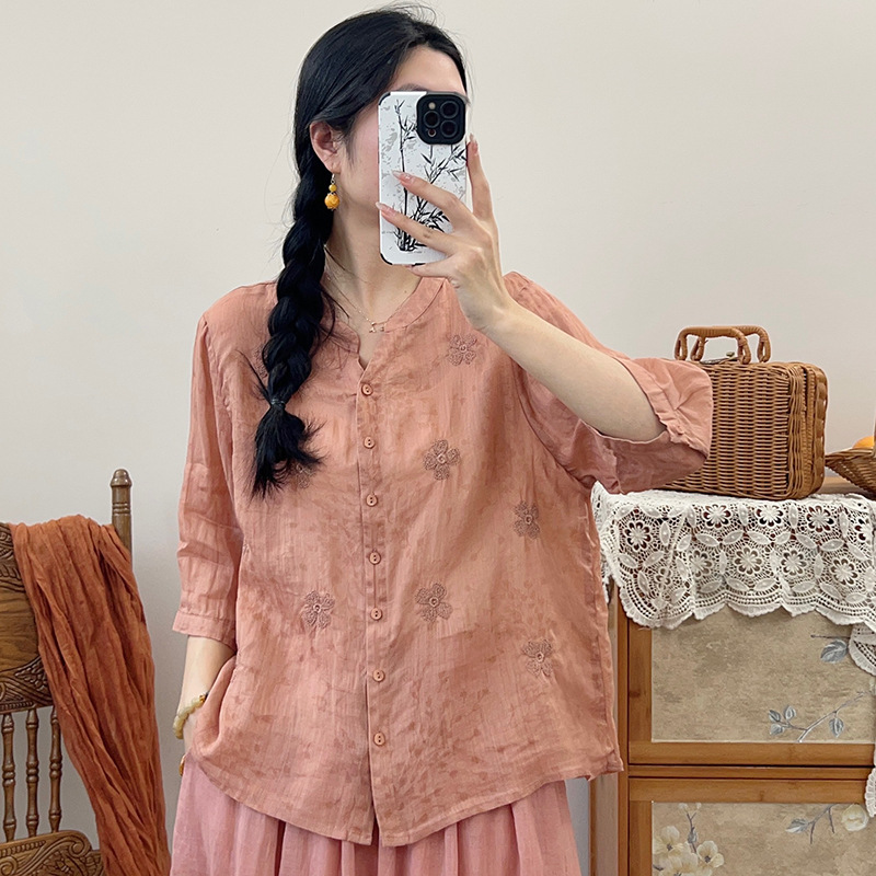 봄과 여름 2024 새로운 스타일 단일 가슴 느슨한 슬림 셔츠 서 있는 칼라와 예술적 캐주얼 인쇄 셔츠스토어 가기