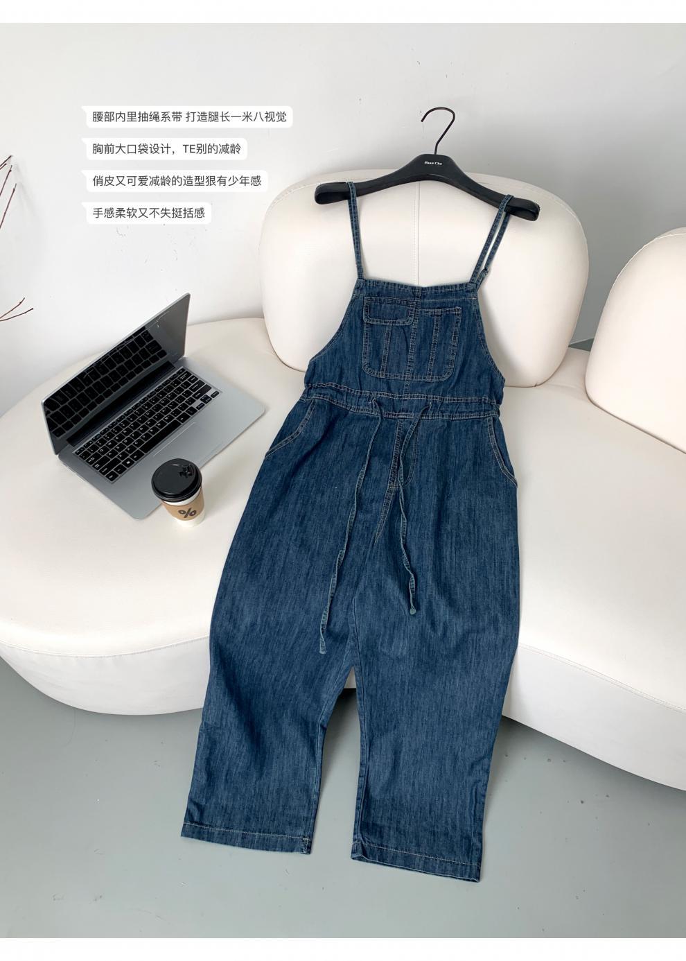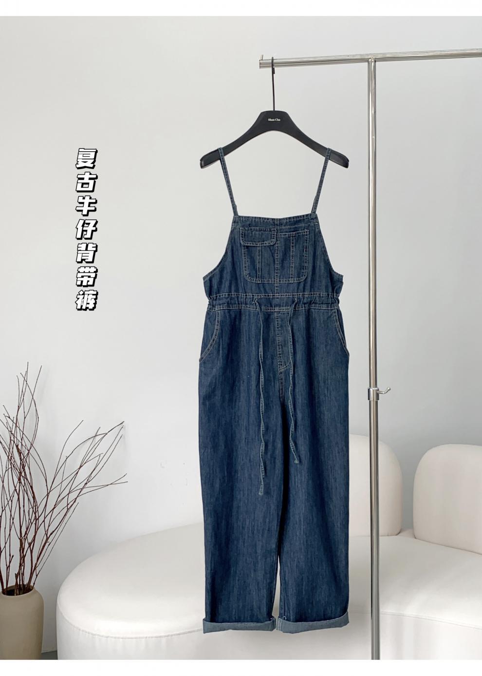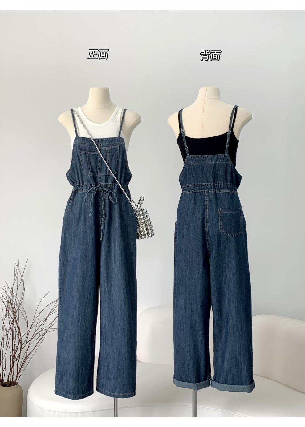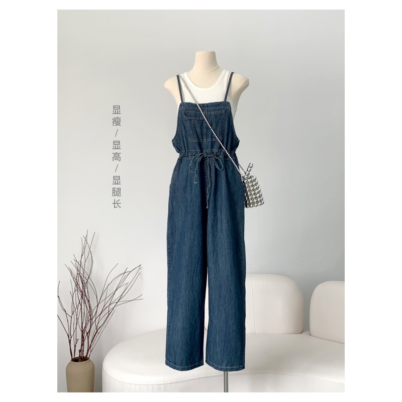 한국식 하이 엔드 레트로 스타일 게으른 스타일 블루 스트랩 청바지 여성 2024 여름 짧은 웨이스트 점프 수트스토어 가기