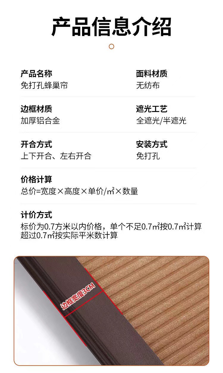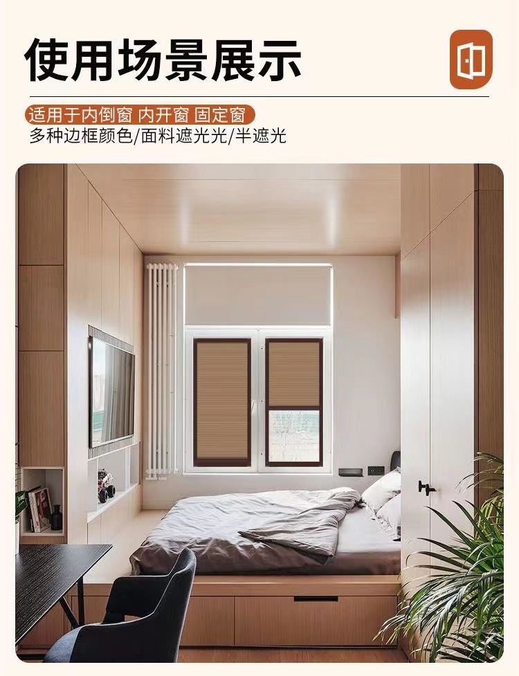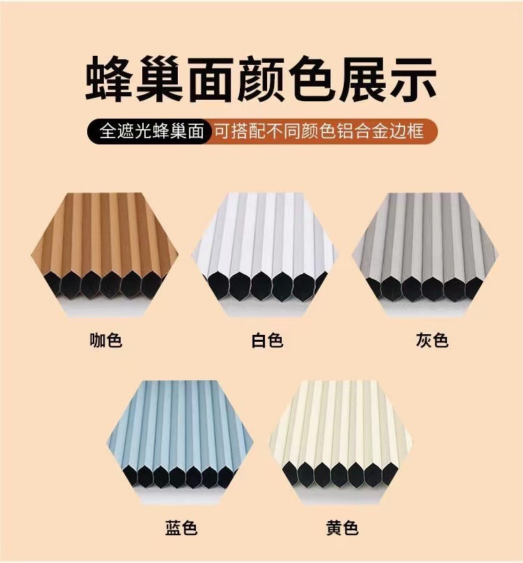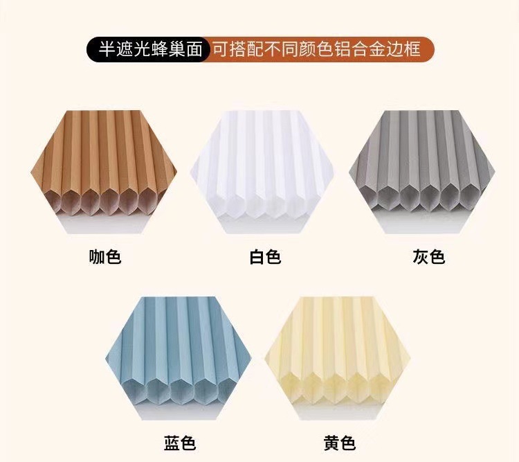 • 안쪽으로 열리는 창틀 없는 벌집형 블라인드(다양한 색상)