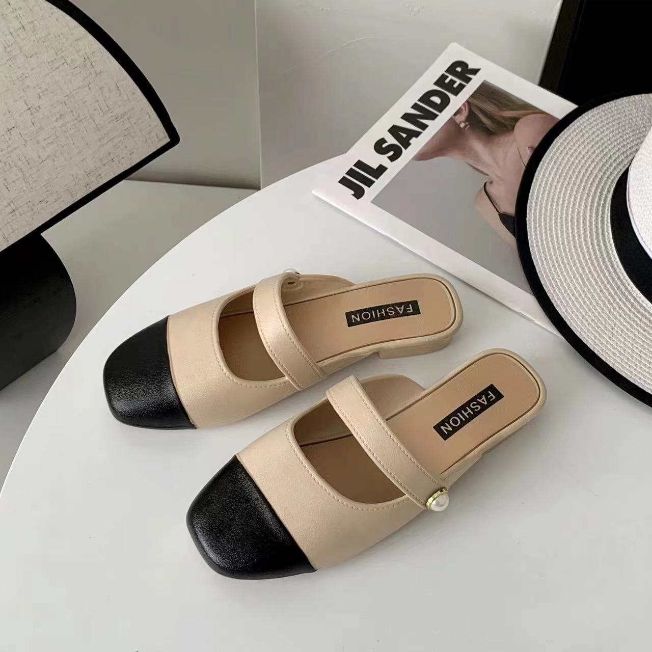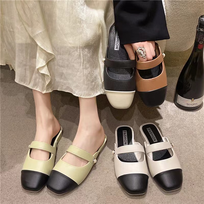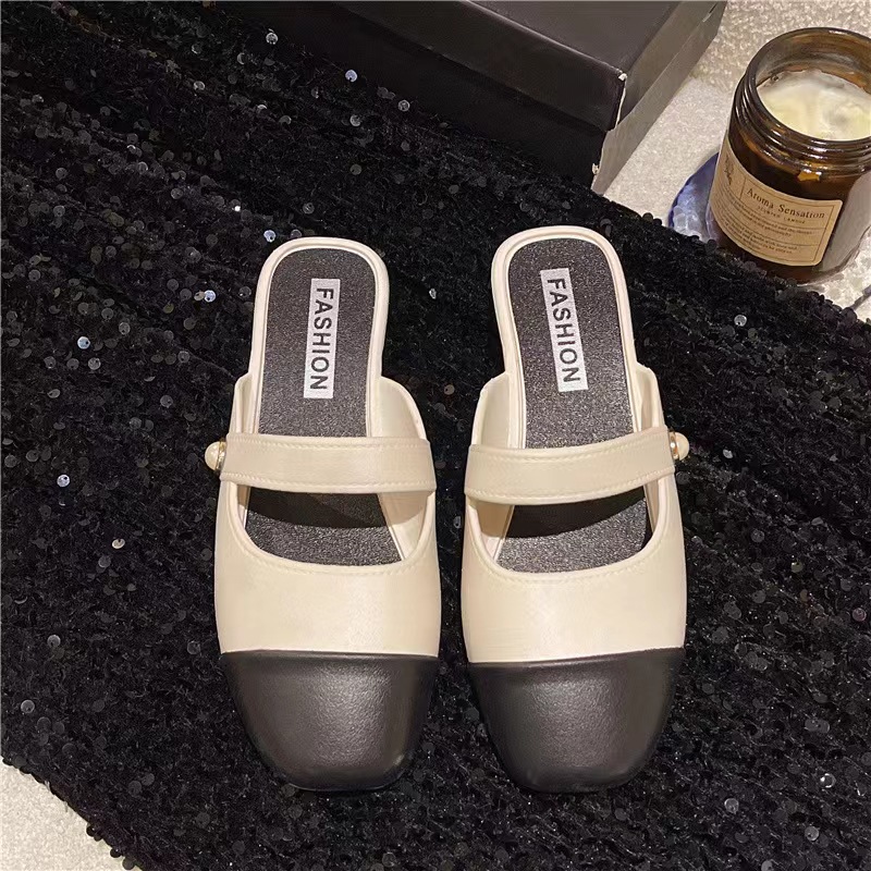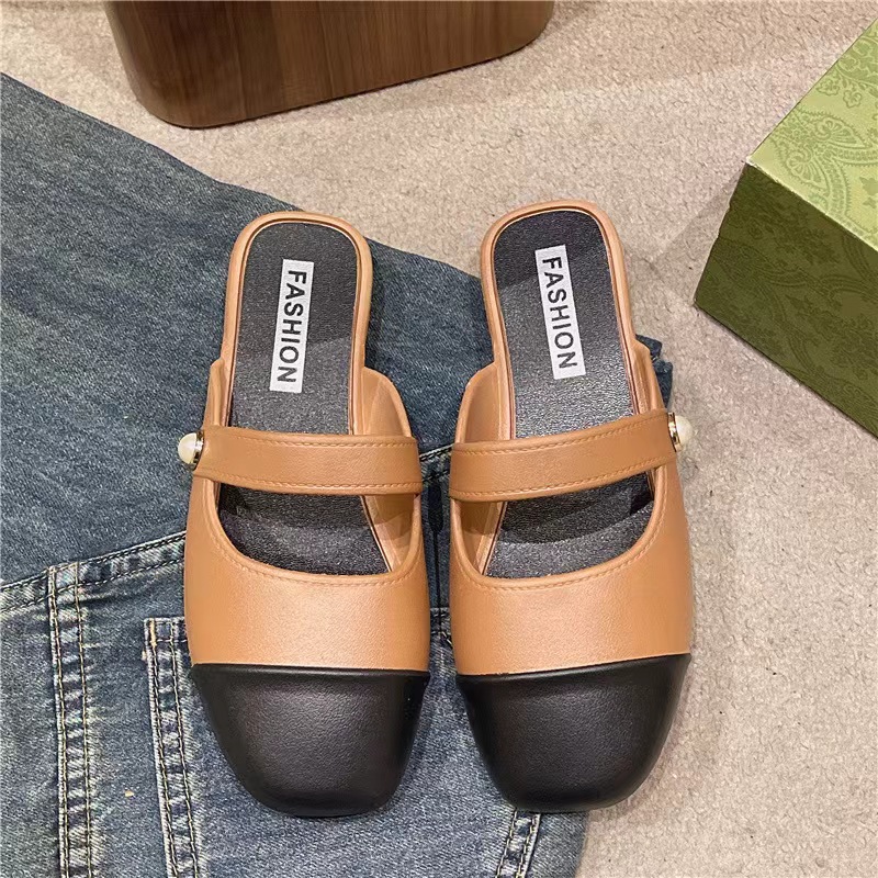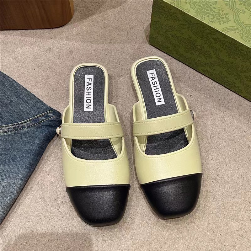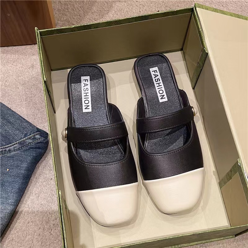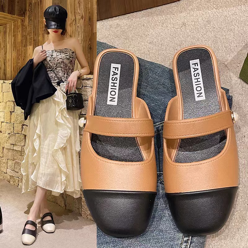 세련된 여름 컬러 블록 하프 슬리퍼 캐주얼 아우터 비치 뉴 스타일 Baotou 플랫 샌들 및 슬리퍼 트렌드스토어 가기