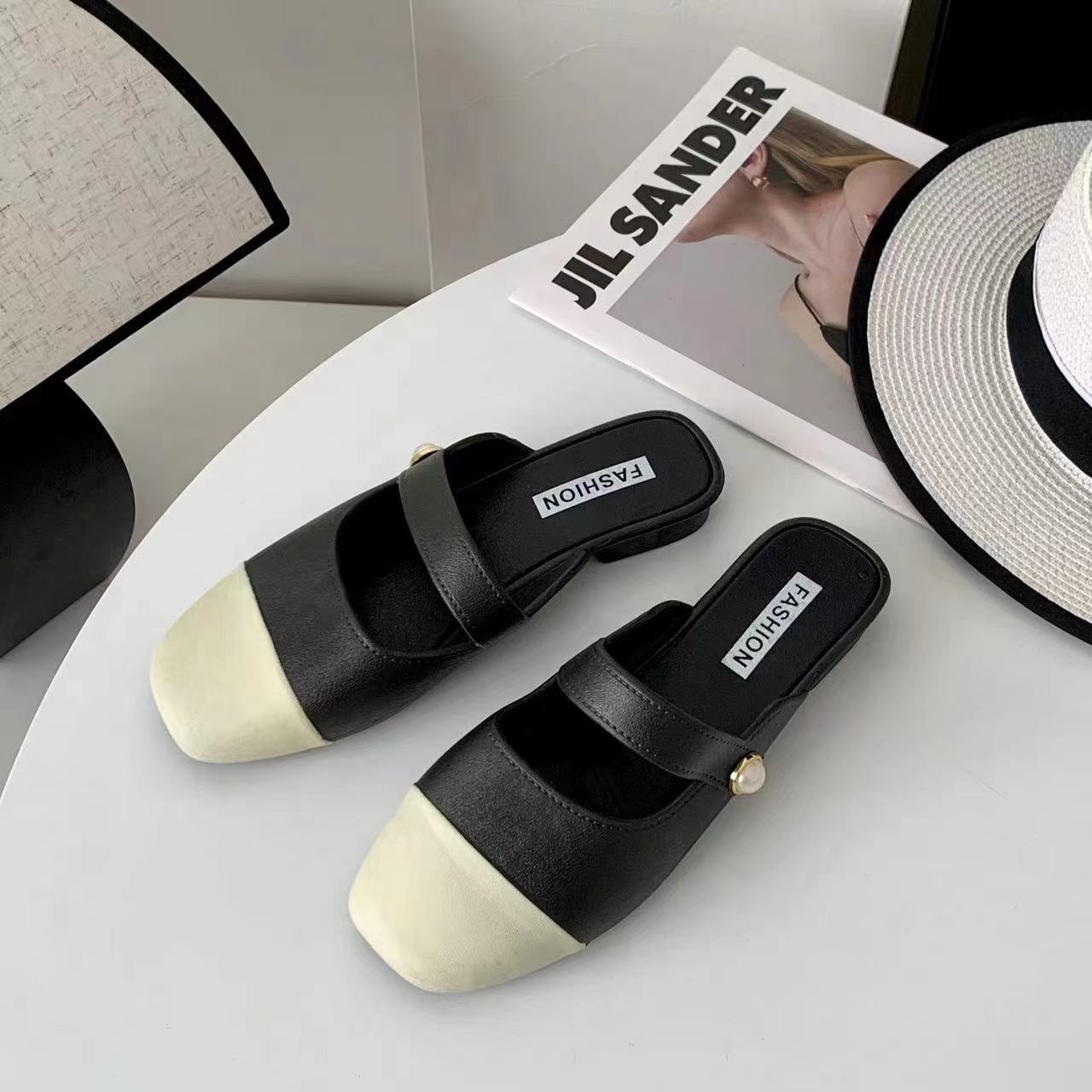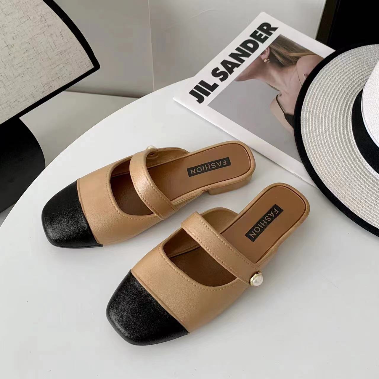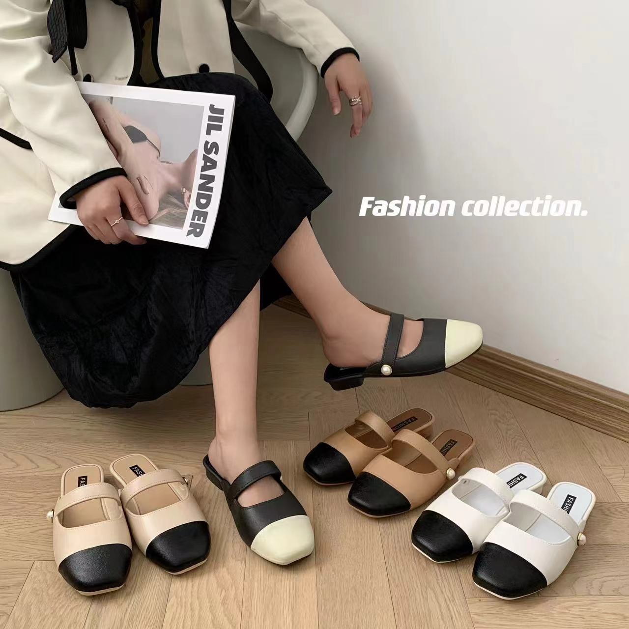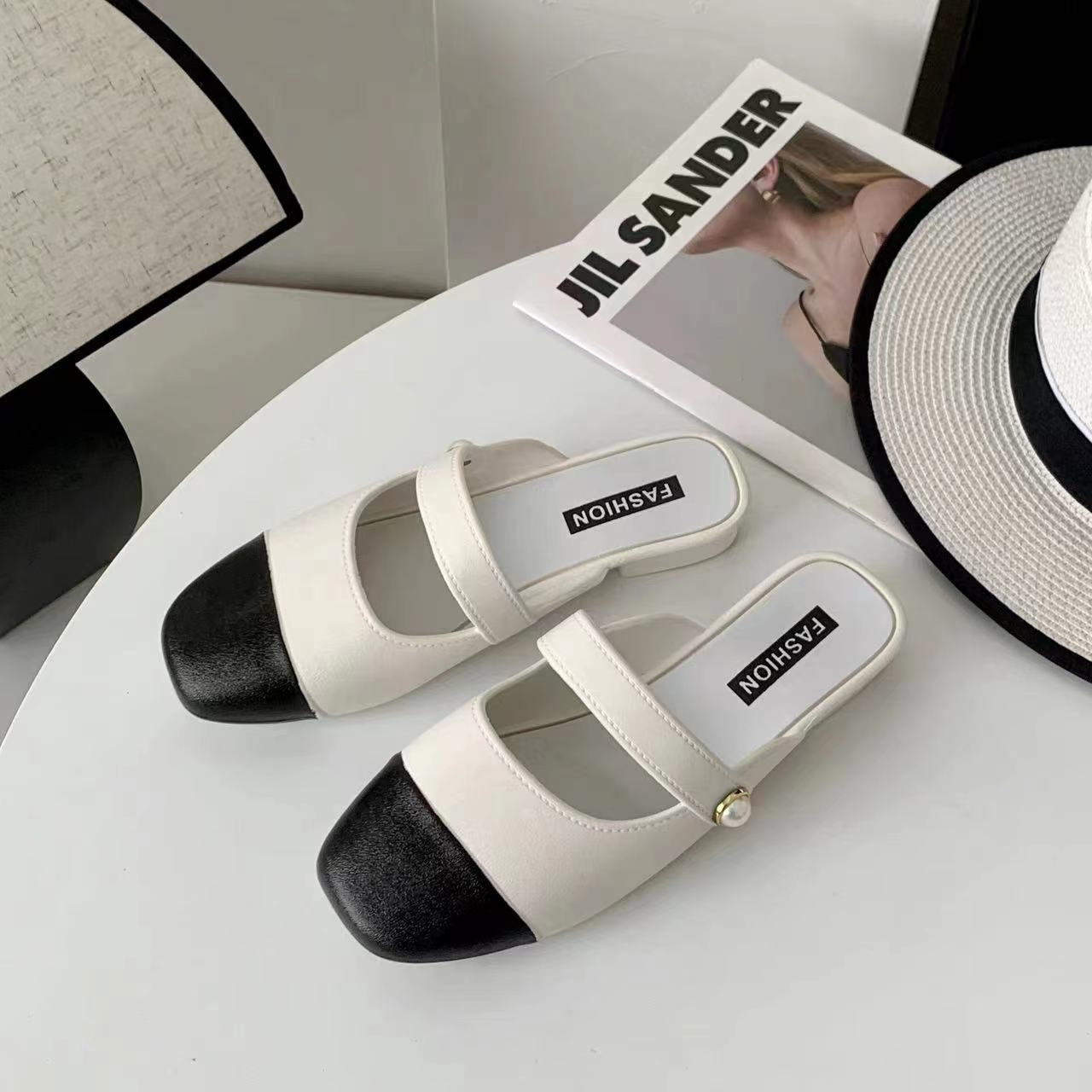 세련된 여름 컬러 블록 하프 슬리퍼 캐주얼 아우터 비치 뉴 스타일 Baotou 플랫 샌들 및 슬리퍼 트렌드스토어 가기