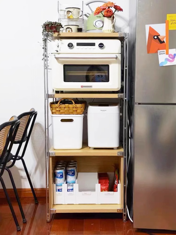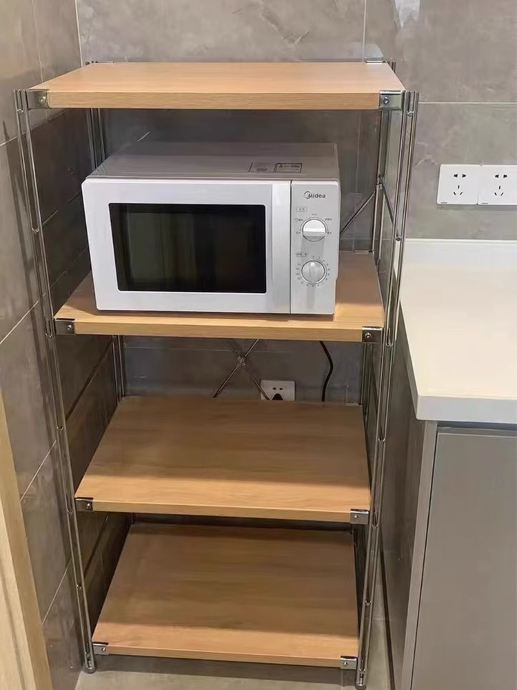 9C 일본식 스테인레스 스틸 솔리드 우드 선반 바닥 스탠딩 발코니 다층 책장 주방 전자 레인지 보관