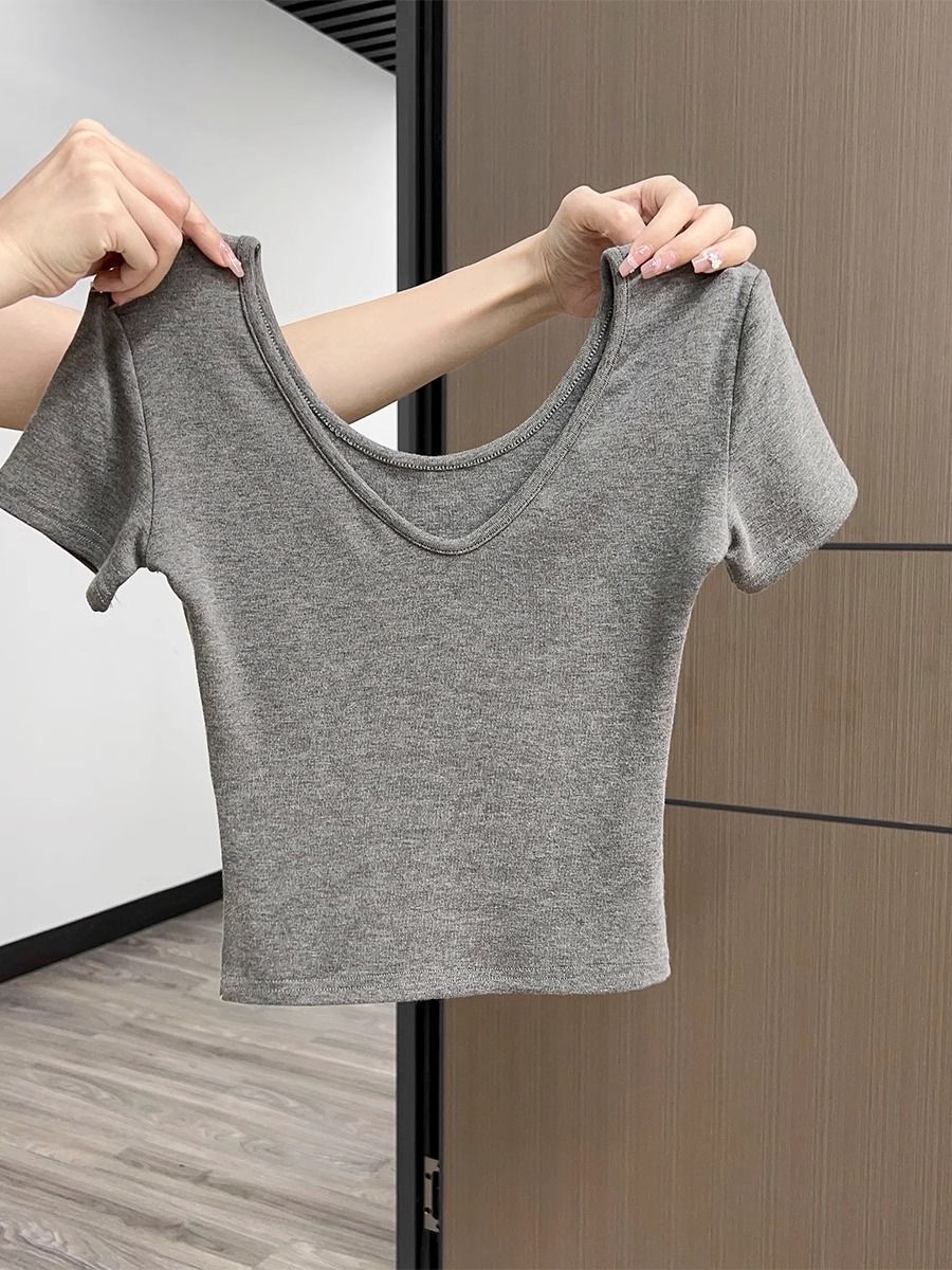 한국 스타일 여름 도파민 컬러 매칭 U 자형 칼라 허리 라인 슬림 탑 올 매치 컬러 매칭 스위트 소녀 반팔 탄성 티셔츠 여성스토어 가기