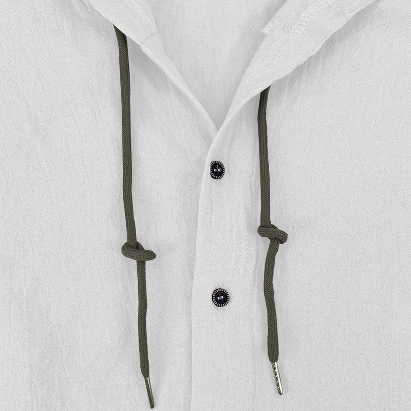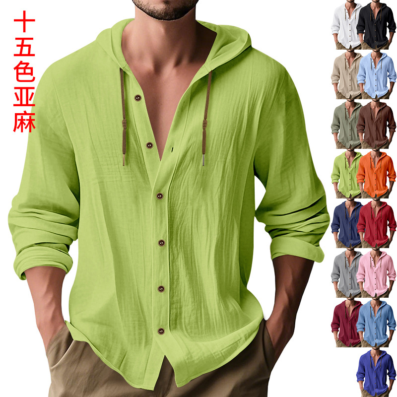 크로스 보더 남성용 솔리드 컬러 캐주얼 긴팔 셔츠 후드 드로스트링 코튼 및 린넨 카디건 트렌디하고 다재다능한 루즈 비치 티셔츠스토어 가기