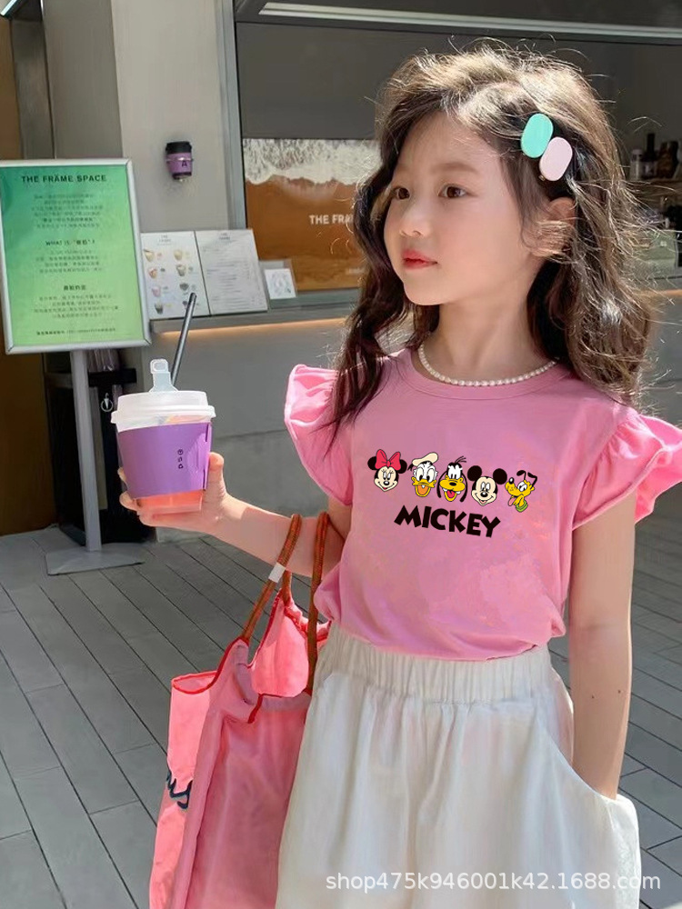 크로스 보더 걸스 코튼 반팔 티셔츠 여름 아기의 서양식 작은 플라잉 슬리브 탑 어린이 만화 미키 티셔츠스토어 가기