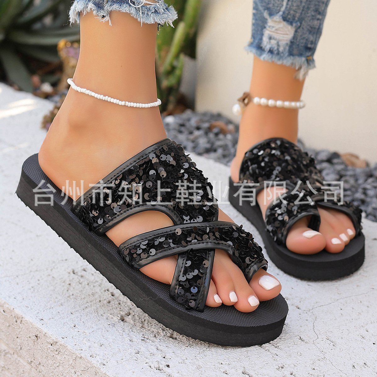 • 블랙 스팽글 두꺼운 밑창 웨지 힐