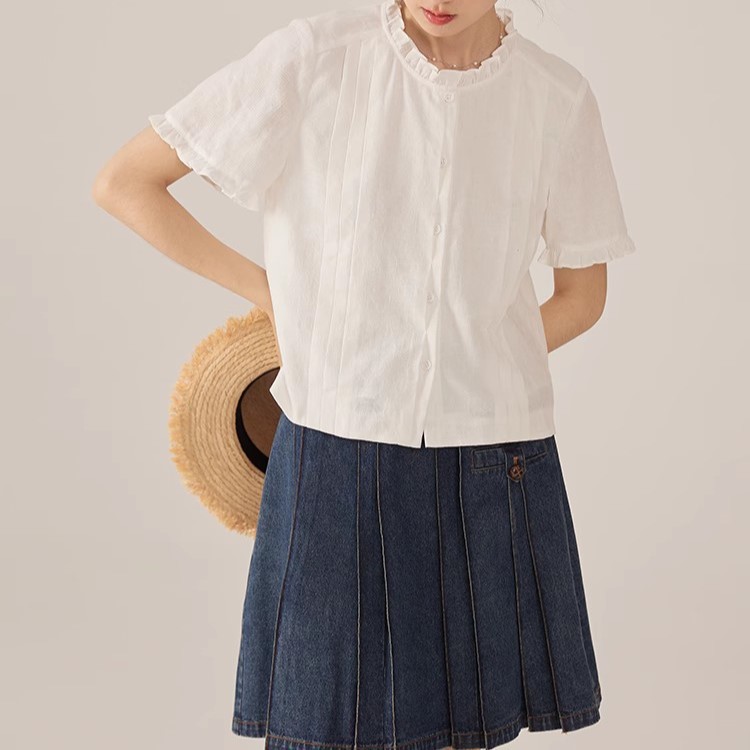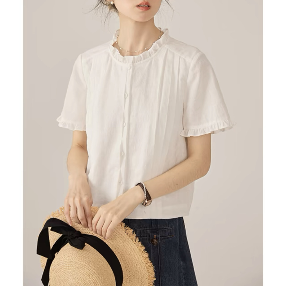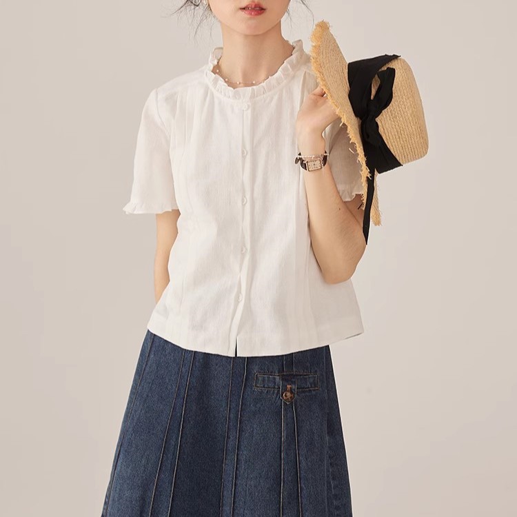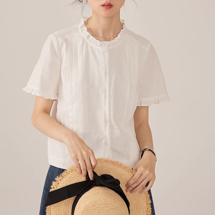 디자인 틈새 곰팡이 가장자리 주름 반팔 흰색 셔츠 여성 여름 새로운 프랑스 소녀 복고풍 탑스토어 가기