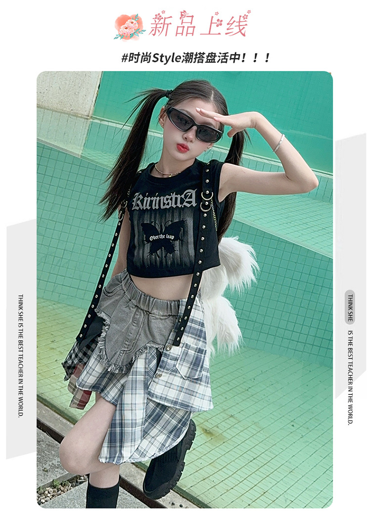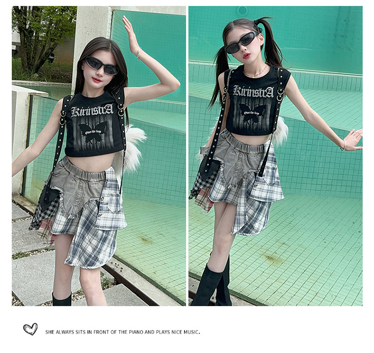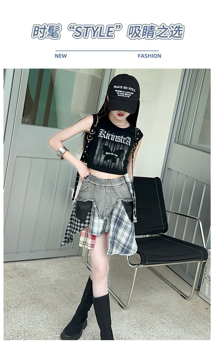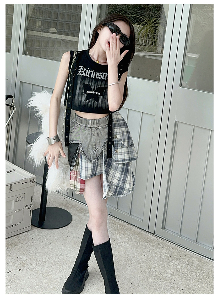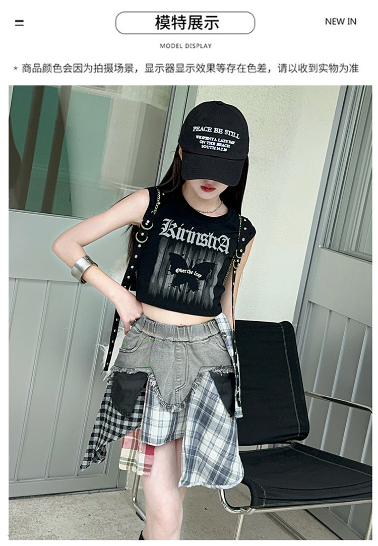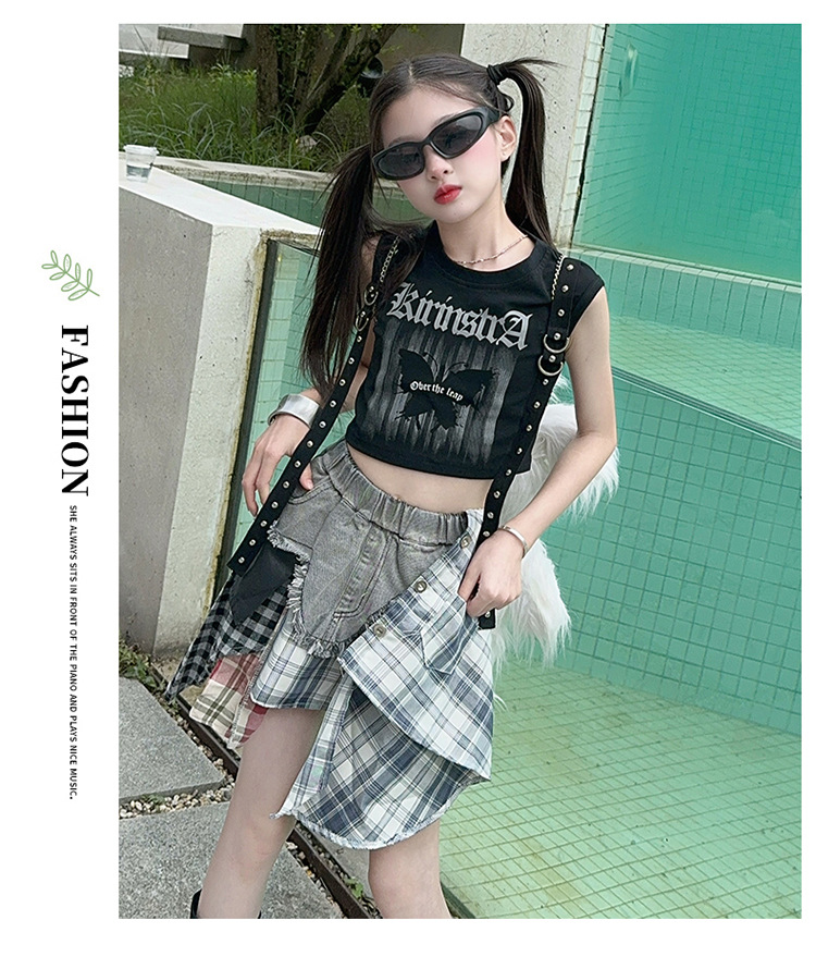 여자 2024 불규칙한 바느질 뜨거운 소녀 데님 스커트 스트리트 댄스 의상 공연 원피스 스커트 조끼 세트