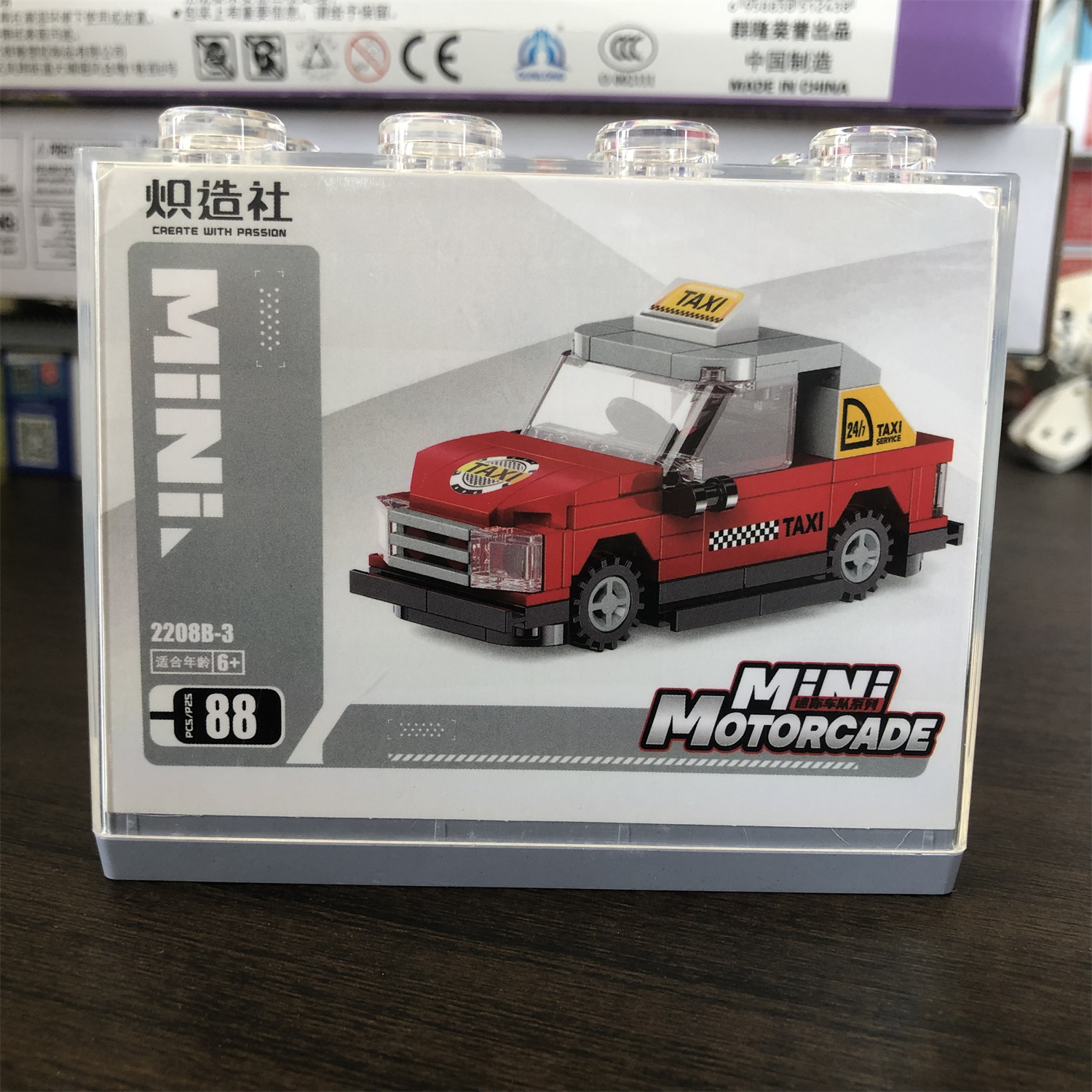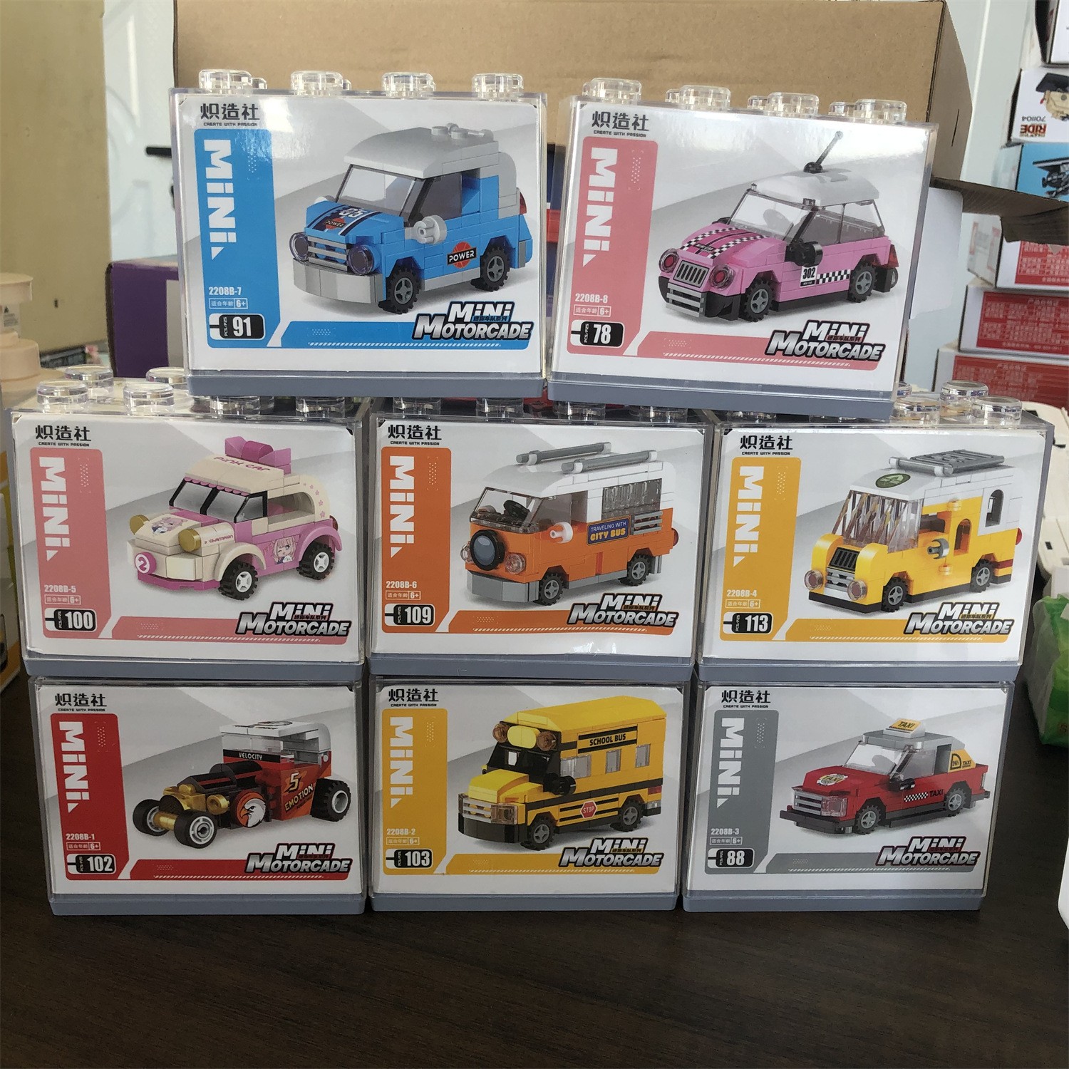 치 빌딩 사회 만화 자동차 모델 조립 소년 어린이 교육 DIY 장난감 빌딩 블록 선물 PVC 디스플레이 상자스토어 가기