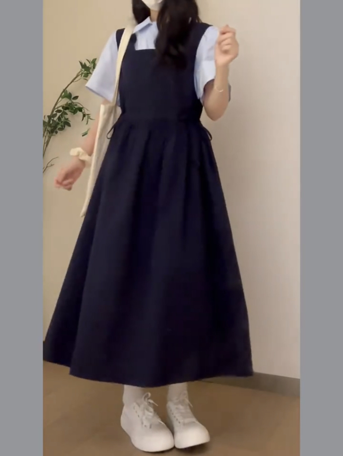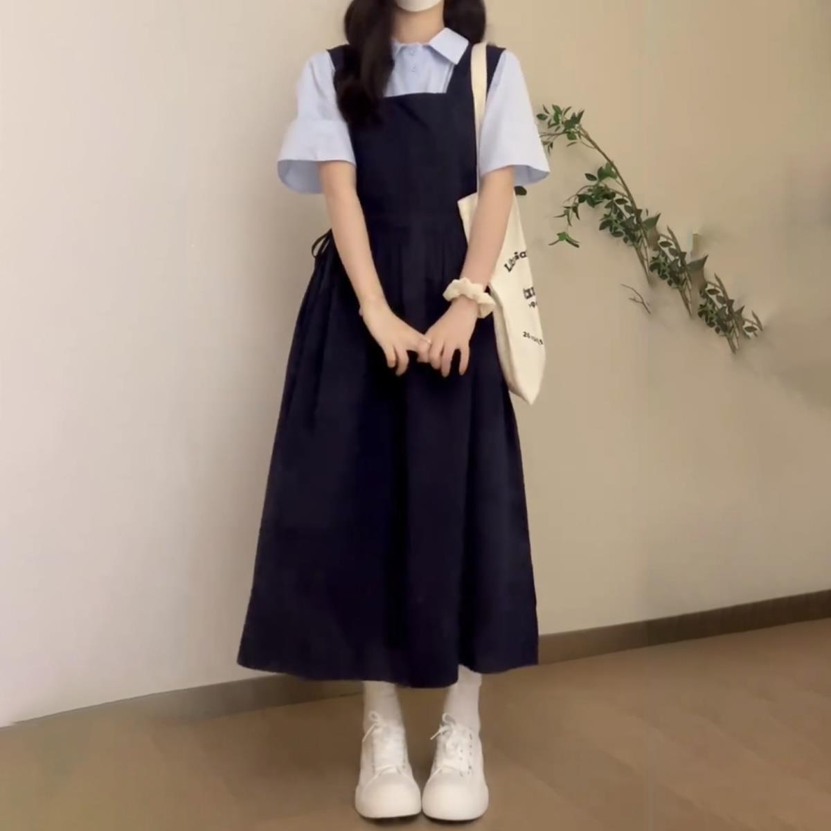나이 감소 스트랩 원피스 여학생 타이트한 허리 슬림 A 라인 스커트 블루 셔츠 투피스 세트 일본 대학 스타일스토어 가기