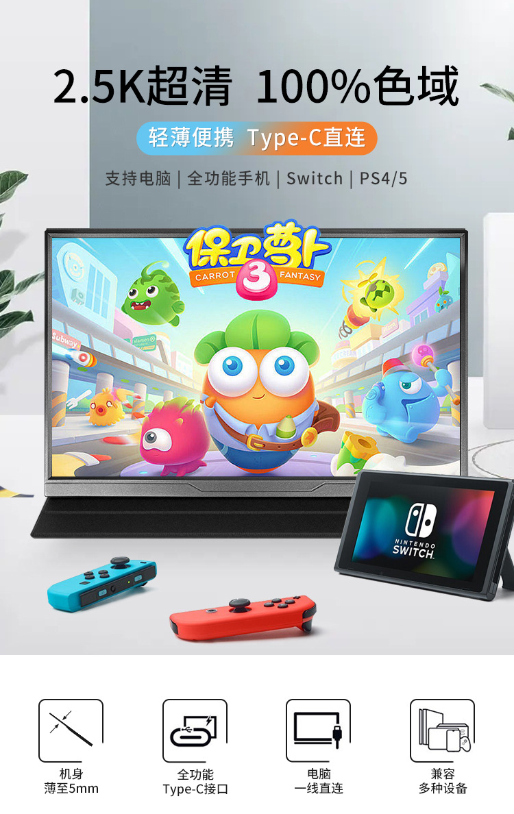14 인치 휴대용 디스플레이 2.5k 슈퍼 클리어 스위치 휴대 전화 노트북 16:10 외부 화면 확장 화면