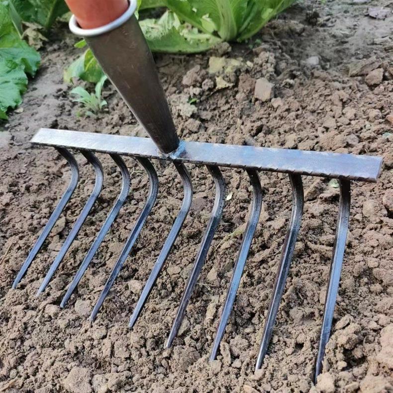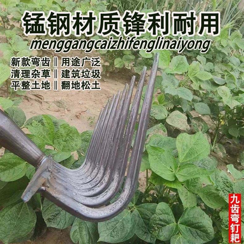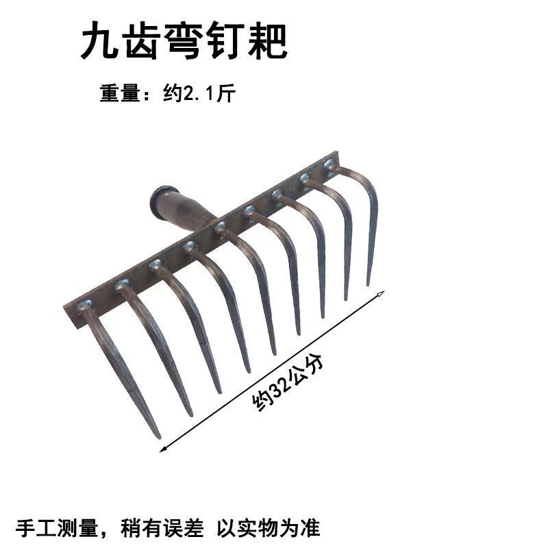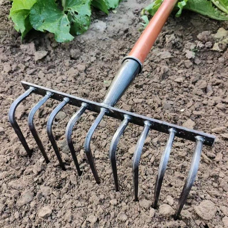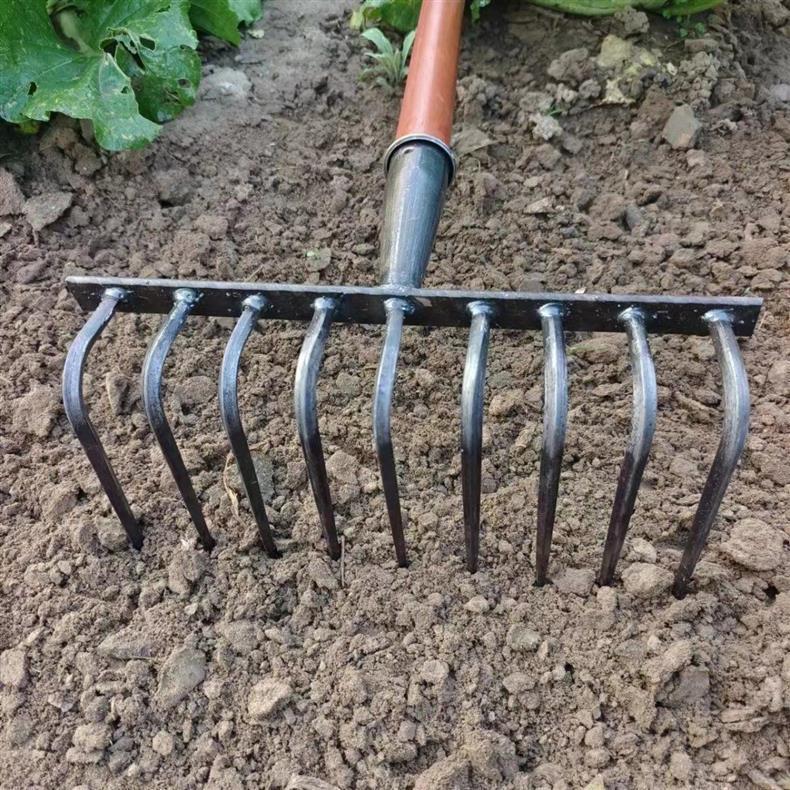 9 개의 이빨 갈퀴가 흙을 돌리고 인공물을 느슨하게하는 새로운 구식 농업 철 갈퀴 갈퀴는 망간 강철 갈퀴를 두껍게 만들었습니다.
